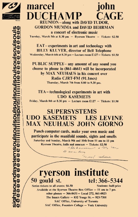 On the evening of 5 March 1968, an audience filled the Ryerson Theatre in Toronto for the opening event of SightSoundSystems, a festival of art and technology directed by the Estonian-born Canadian composer Udo Kasemets and jointly presented by the Isaacs Gallery and Ryerson Polytechnical Institute. The performance that unfolded was Reunion, conceived by John Cage as a piece with no score, in which the moves of a chess game would generate and spatially distribute electronic music around the audience.