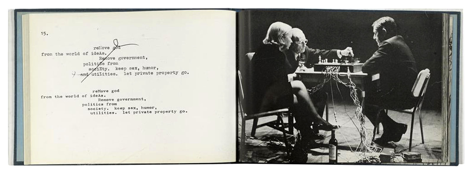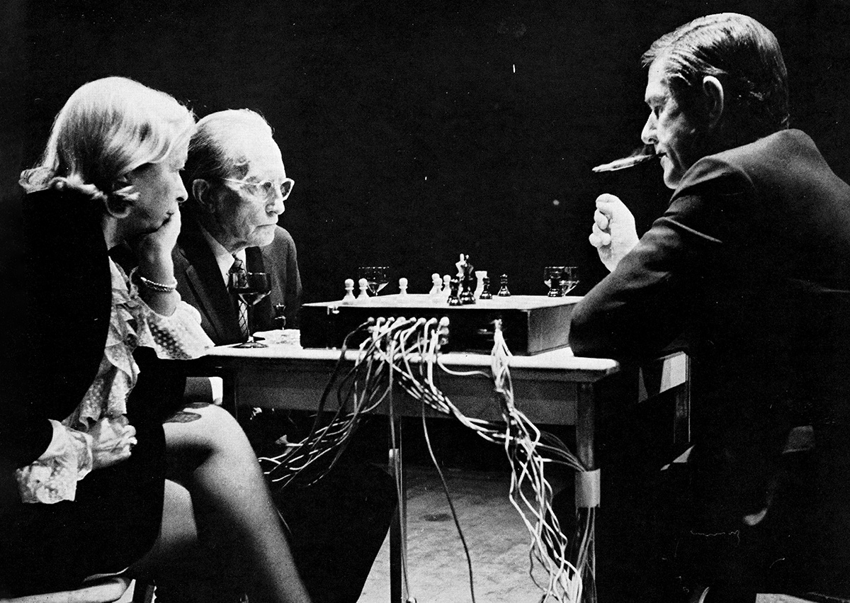 Shigeko Kubota, a Japanese-born artist affiliated with Fluxus who had met Duchamp earlier in 1968, photographed the Reunion performance. Her black-and-white photographs of the event, showing Duchamp and Cage at the board, Teeny observing, and the composers at work, became the basis for the artist’s book Marcel Duchamp and John Cage.