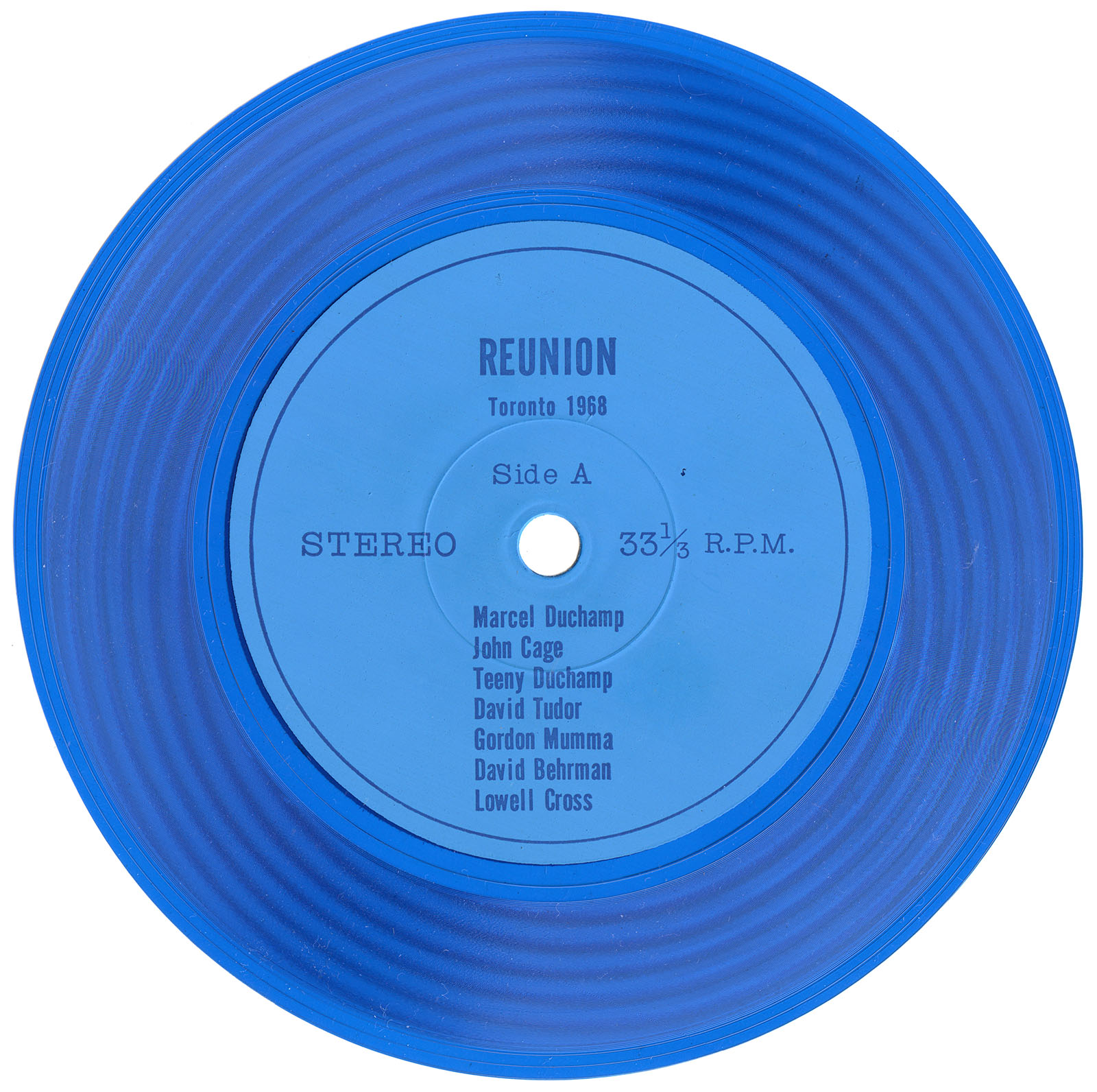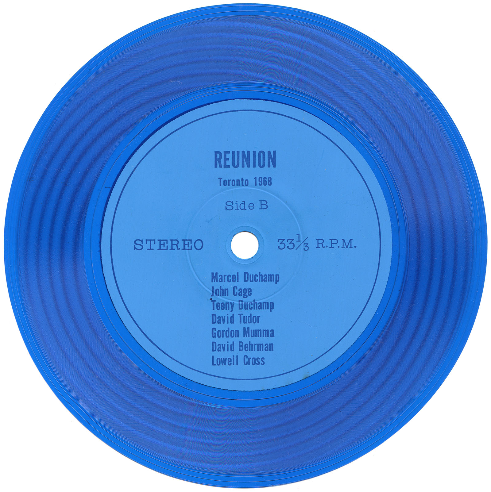 A blue 33⅓ rpm flexi-disc containing a recording of the Reunion performance is laid into the book. This flexi-disc constitutes the only commercially distributed audio document of the event. Although the entire performance was also recorded by CBS/Columbia with David Behrman as producer, the location and condition of those tapes are unknown. Cross’s tape work Video II (B), heard during Reunion, was separately released on Source Records No. 5 in 1971.