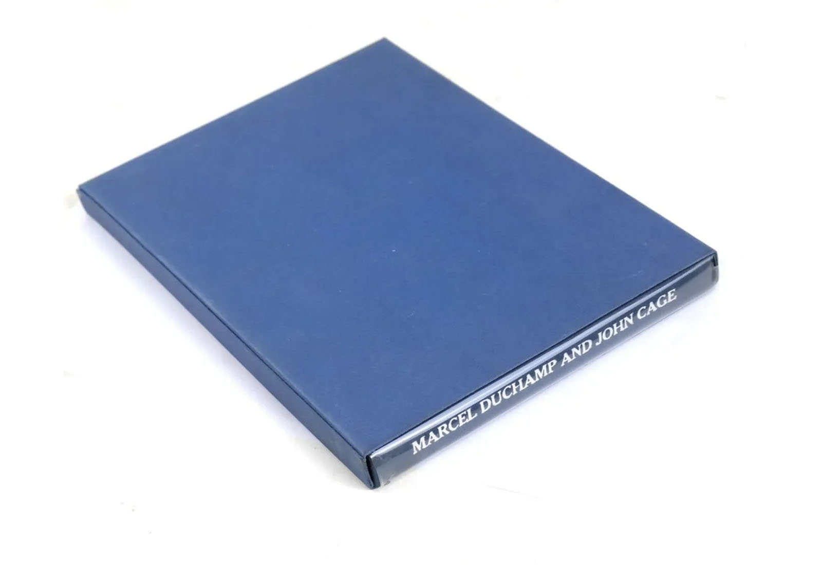 Published in 1970 by Takeyoshi Miyazawa, then chief editor of the Japanese art magazine Bijutsu Techo, the book was issued in a limited edition of 500 hand-numbered copies. It is bound in blue cloth with silver lettering, housed in a clear acetate dust jacket and a blue cardboard slipcase. The photographs appear on rectos, with Cage’s text 36 Acrostics re and not re Duchamp printed on the facing versos. This text, a set of poems in the mesostic form, carries the instruction: “A given letter capitalized does not occur among the letters between it and the preceding capitalized letter.”