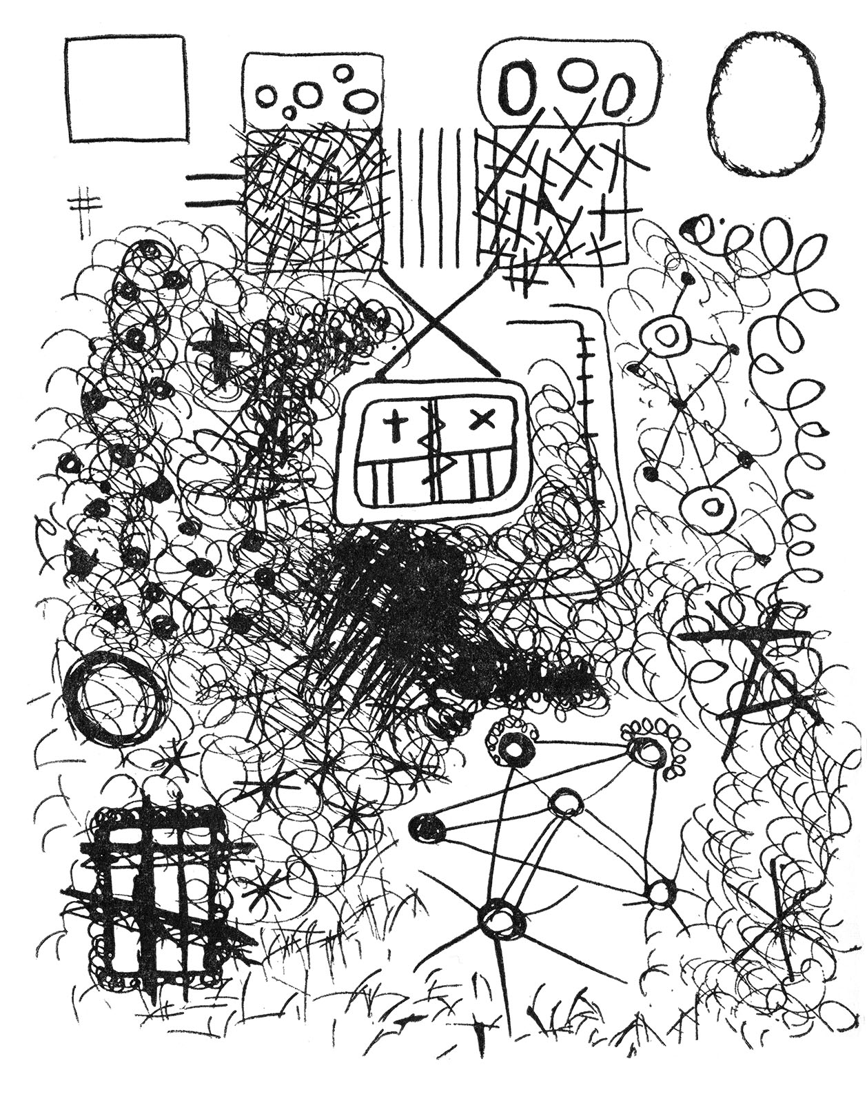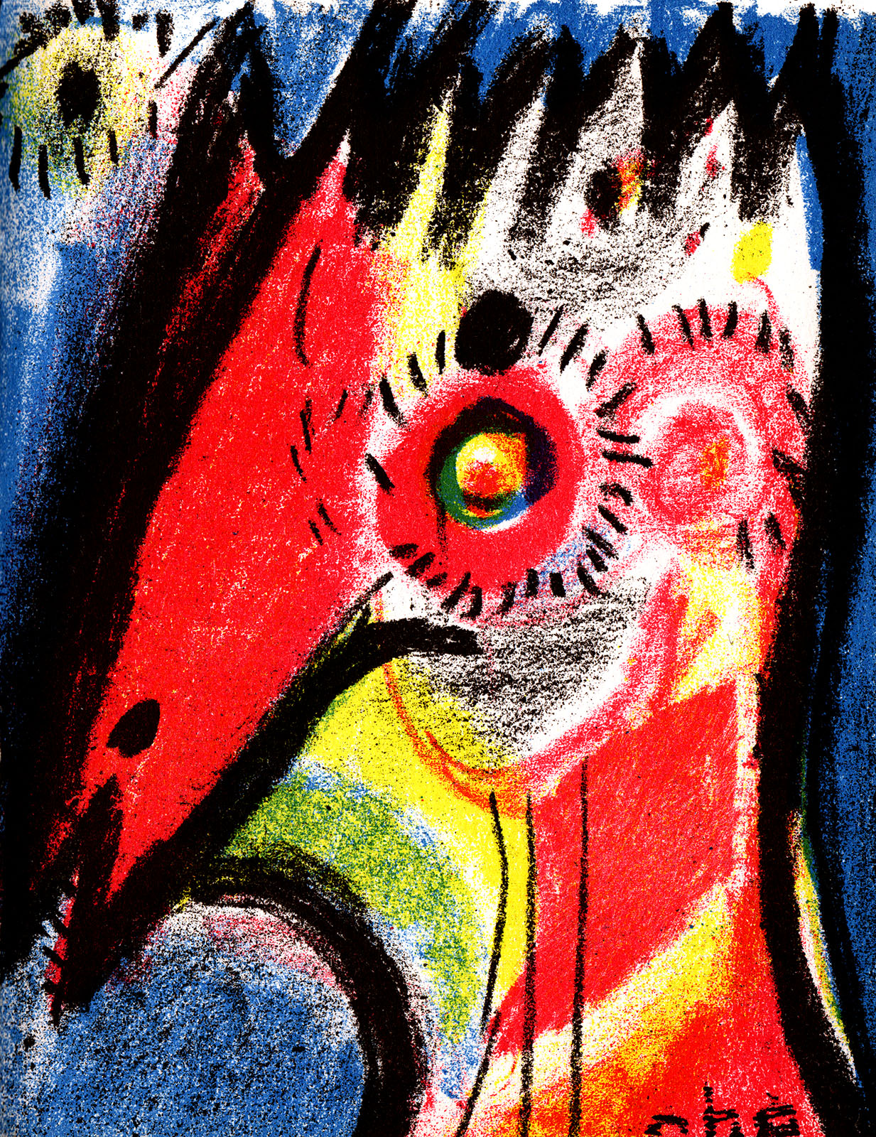 In his text on Asger Jorn, Dotremont described the artist’s painting as free, ruthless, living, and direct, going “from the dream of reality to the dream of content, and to the point where I (Jorn) and it (reality) kiss each other (on the mouth).” He characterized Jorn as aware of “painting’s misery” or rather its wealth’s fragility, seeing painting not as a heaven of oblivion but as “the dangerous area for a human unity-experiment, which reaches from the simple seismograph to the organization of a common joy for all senses and in all directions.”