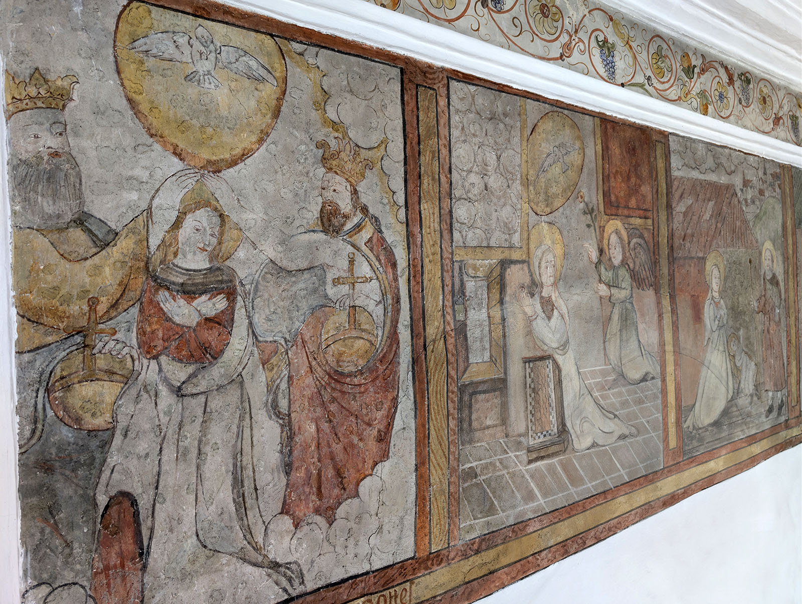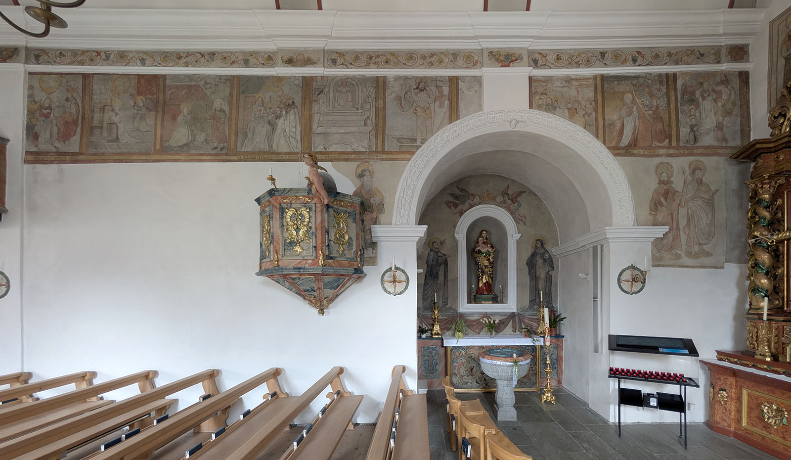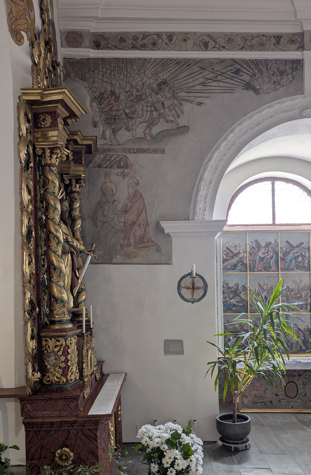 The most artistically distinctive feature of the nave of S. Stiafen is a pair of wall paintings that Maissen tentatively attributes to Hans Ardüser (1557–1617), one of the most characteristic visual artists to emerge from Graubünden in the late sixteenth century. On the upper side of the nave, a cycle depicting the Ten Joys of Our Lady runs along the wall; on the lower side, a fresco of the Battle of Mundaun commemorates one of the violent episodes of the Bündner Wirren (1618–1639), the decades-long conflict in which Habsburg and French intervention tore apart the Three Leagues and brought foreign troops repeatedly through the Surselva. Maissen dates both works to approximately a century after the Gothic construction of the nave, placing them around the late sixteenth or early seventeenth century, and notes that Ardüser “is known to have also worked in the Lumnezia, for example on the chapel of St. Roc at Vella.”9 The attribution remains probable rather than documented: unlike several of Ardüser’s confirmed works, the Cumbel paintings bear no signature, and the episcopal visitation protocols for the Lumnezia of 1623 and 1643 — which would be the most likely sources of contemporary documentation — make no mention of the church at Cumbel at all.