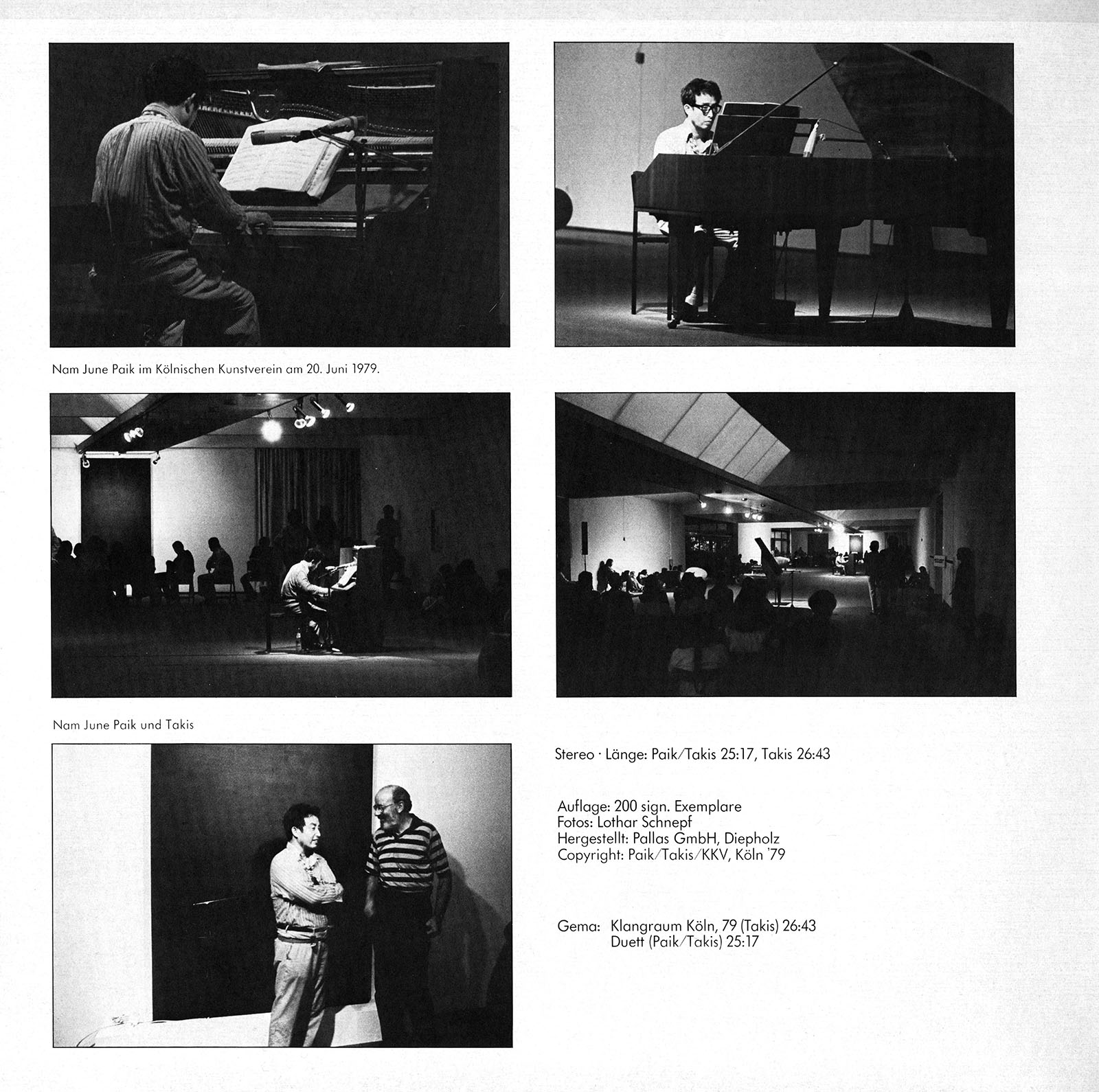 The LP was the first release on the Edition Kölnischer Kunstverein imprint (EKK-1). The second release on the same imprint (EKK-2) was a recording by composer Hans Otte, documenting a staging of his piece On Earth given at the Kunstverein on June 13, 1979 - a week before the Paik/Takis concert. The pressing was manufactured by Pallas GmbH in Diepholz. Photographs were taken by Lothar Schnepf.