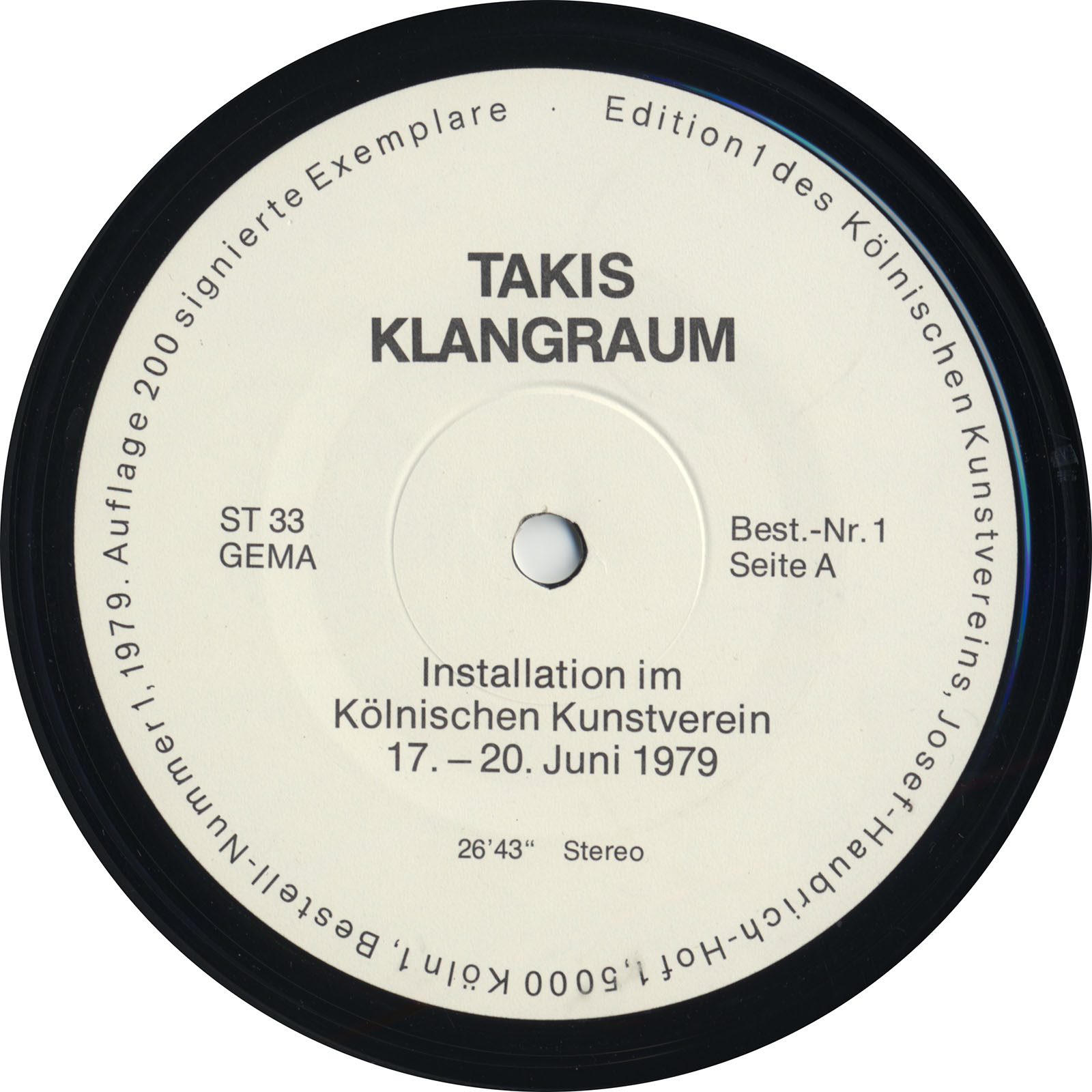 The second side documents the Klangraum (Sound Space) installation that Takis designed for the Kölnischer Kunstverein. The liner notes state that this Klangraum was designed by Takis - “born 1925 in Athens, lives in Paris” - for the Kunstverein, and was audible and visible there from June 17–20, 1979.
