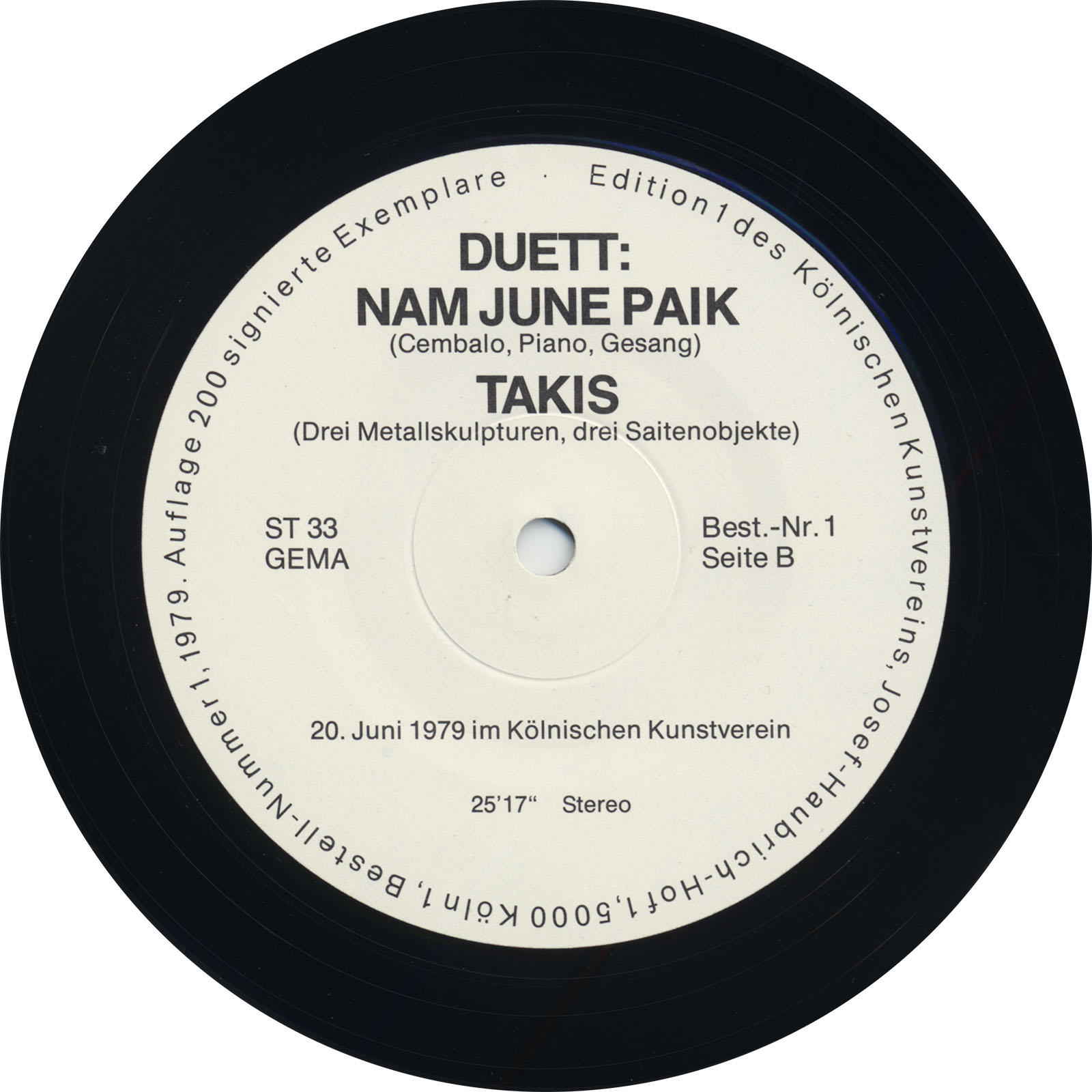 Duett Paik/Takis is a double-sided vinyl LP documenting two live performances staged at the Kölnischer Kunstverein in Cologne in June 1979, featuring Nam June Paik performing on harpsichord, piano, and voice alongside the electromagnetic sculptures of Takis. The record was released as the inaugural edition of the Kölnischer Kunstverein’s own imprint, in a limited pressing of 200 signed and numbered copies. Both performances were recorded on June 20, 1979, by composers Klarenz Barlow and Walter Zimmermann.