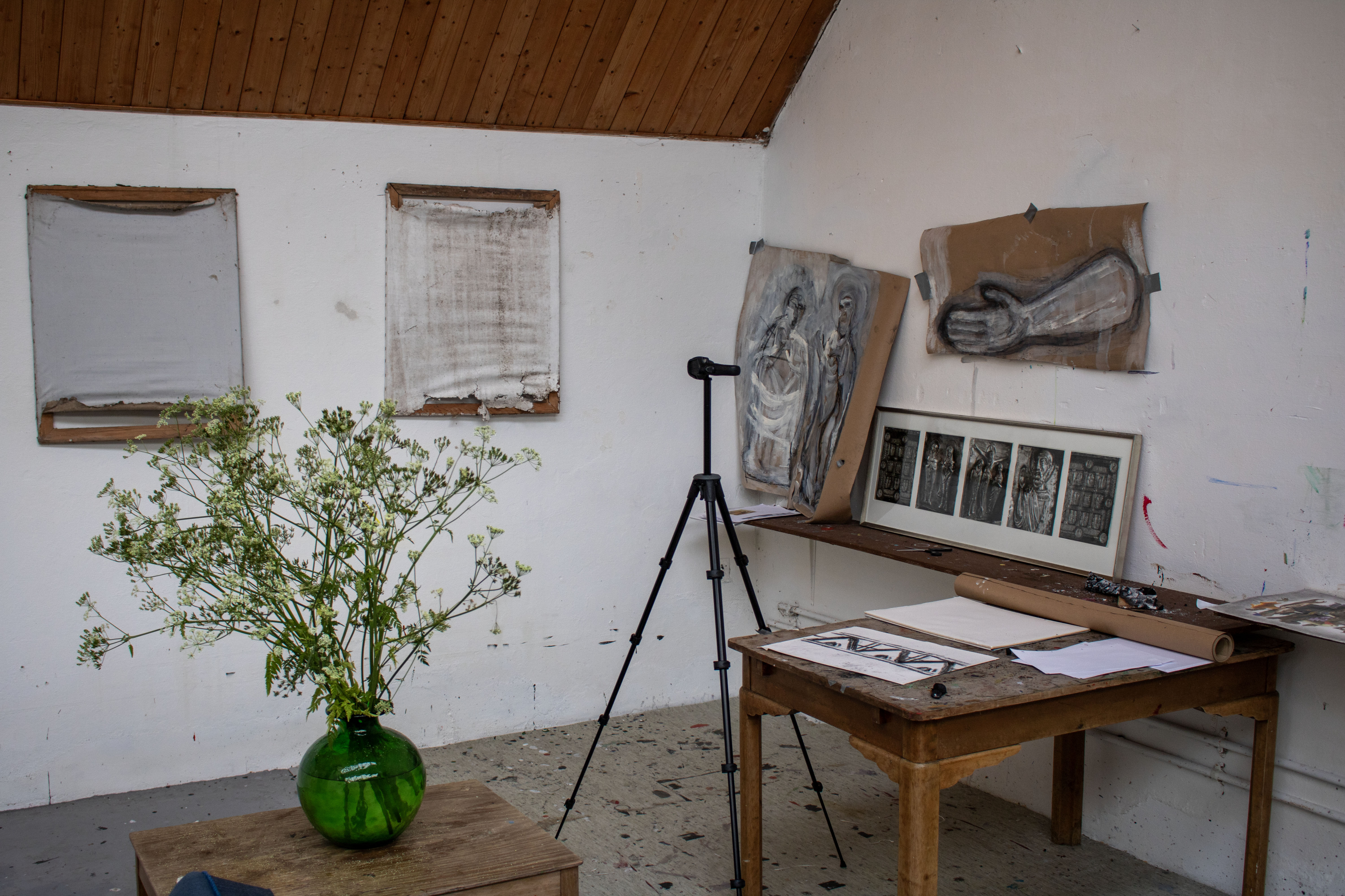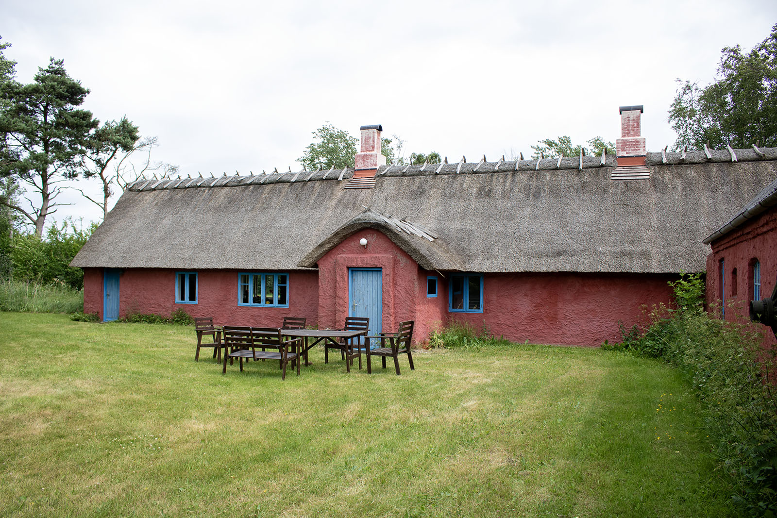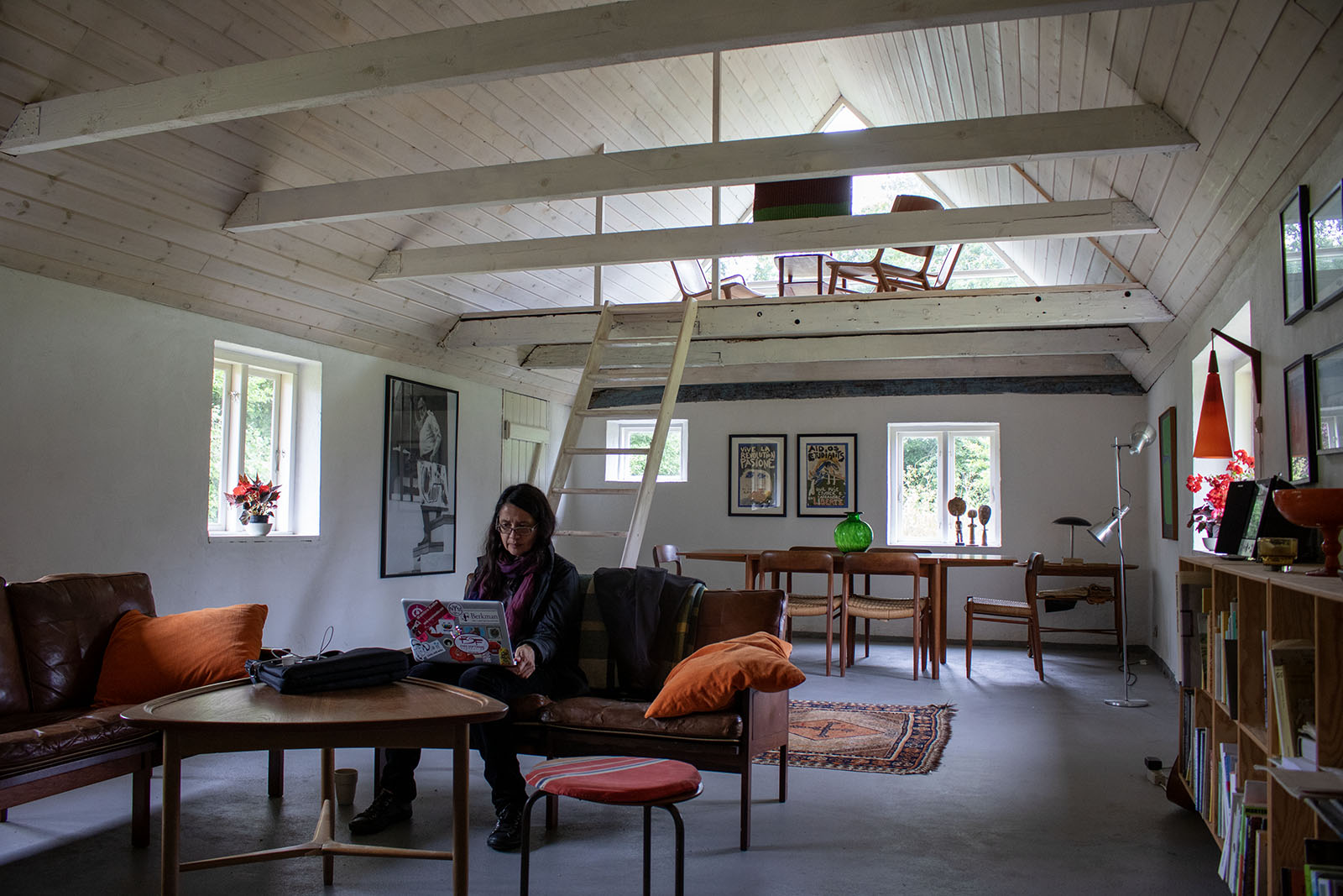 Bangsbohave consisted of two separate longhouses in poor condition, having stood uninhabited for years. Birch coordinated an extensive renovation using local craftsmen, transforming the former stable into a painting studio that rose to the full height of the ridge. In the eastern section, the original stable structures were preserved, including curved ceilings of moler brick, with bedrooms installed on each side and a small kitchenette in the center aisle. A garage was added on the south side to store stretcher frames, canvas rolls, and paint.
