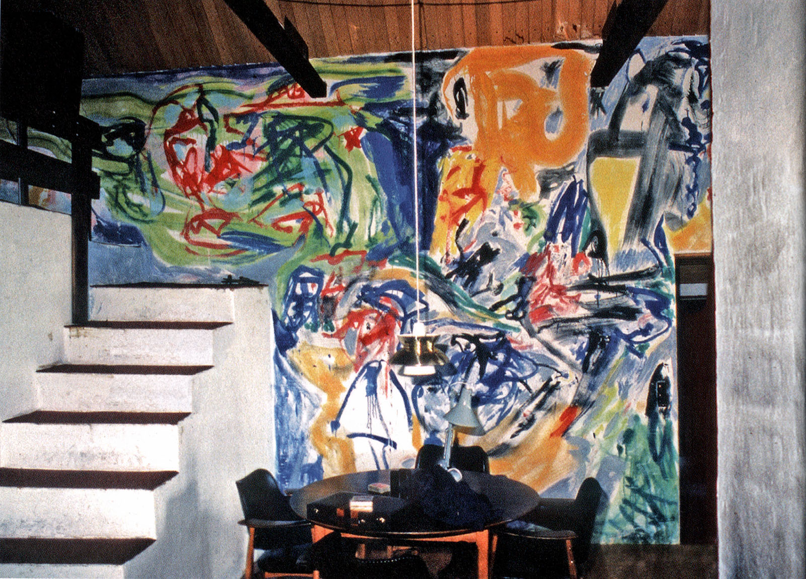 When Jorn finally took possession in 1968, he declared to Ekstra Bladet: “Strangely enough, this is actually the first studio I have that is arranged entirely according to my own ideas.” The layout reflected patterns Jorn had developed across his various residences: separate living quarters and studio spaces, canvases standing on low shelves, and north-facing windows providing consistent sidelight.
