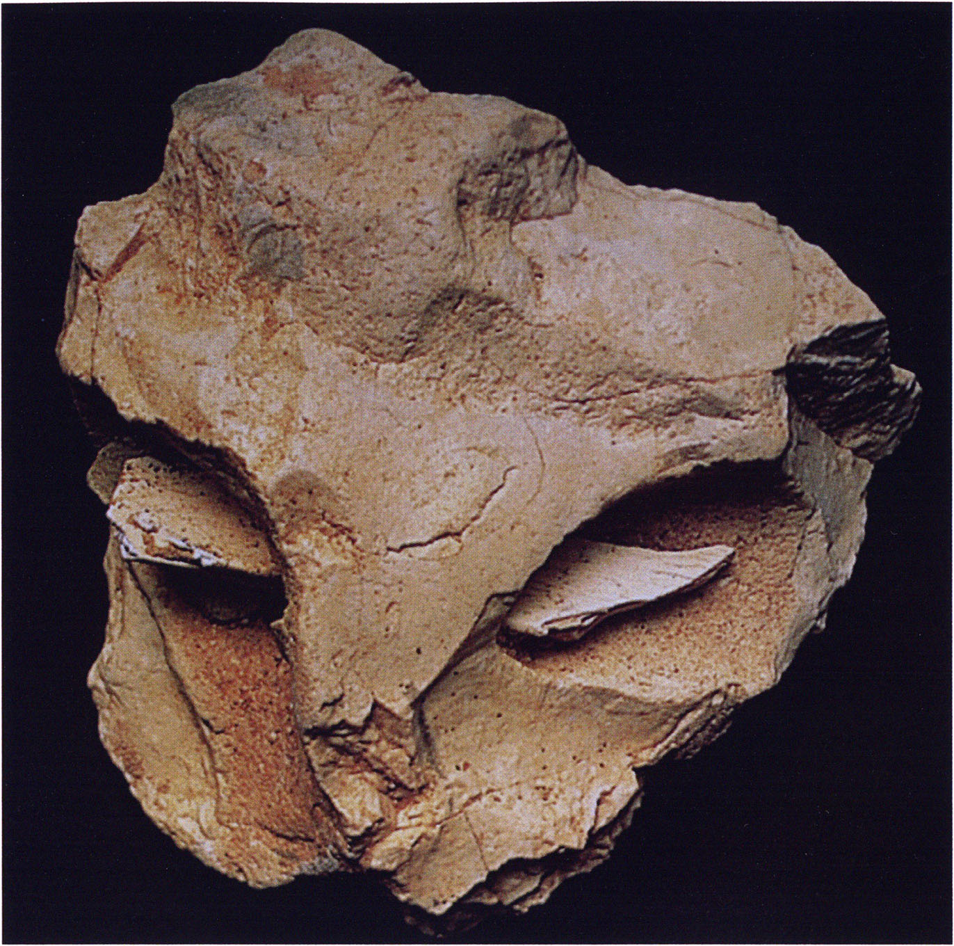 Symbolische, unvollständige Bilddarstellungen müssen wir also schon für die Zeit des europäischen Neandertaler-Menschen voraussetzen, ebenso entsprechende einfache Rituale, feierliche, regelmässig stattfindende Handlungen, die sich auf den immateriellen Bereich des Lebens bezogen. - So treffen wir symbolische Kunst in der sog. “Maske” von La Roche-Cotard an - Abb. 5, 18, die ihr Entdecker Jean-Claude Marquet - wie es scheint zu Recht - mit dem Neandertaler-Menschen in Verbindung gebracht hat (A Neanderthal face ? The proto-figurine from La Roche-Cotard. Antiquity, 77, 661-670). Es handelt sich dabei um einen flachen trapezförmigen, 93 x 105 (< 69) mm grossen Feuerstein, dessen eine Seite eine “Nasenbrücke” mit einer darunter horizontal verlaufenden Rinne aufweist, in die ein längliches Knochenfragment gestossen wurde. Das Knochenstück guckt auf beiden Seiten der “Brücke” heraus, beide sichtbaren Knochenteile wirken neben der “Nasenbrücke” wie Augen, das Ganze wirkt wie ein Gesicht resp. eine “Maske”. Der künstlerische Gehalt dieses geschaffenen Gesichtes ist sehr gering, aber auch gar nicht beabsichtigt. Allein die Symbolik stand im Vordergrund ! Welche ? Auch wenn sich der Entdecker diesbezüglich nicht äussert, liegt sie auf der Hand: Das Tote - der Knochen – wird zur Wiederherstellung des Lebens an den Ort des Lebens – symbolisiert durch die Augen – gelegt. Das Objekt erzählt uns die einfache rituelle Handlung, die der Mensch von La Roche-Cotard an ihm vollzog, und gleichzeitig repräsentiert es den Charakter jener bildsymbolischen Kunst, die vollständige, naturgetreue Abbildungen von Tieren, Menschen etc. noch meidet !