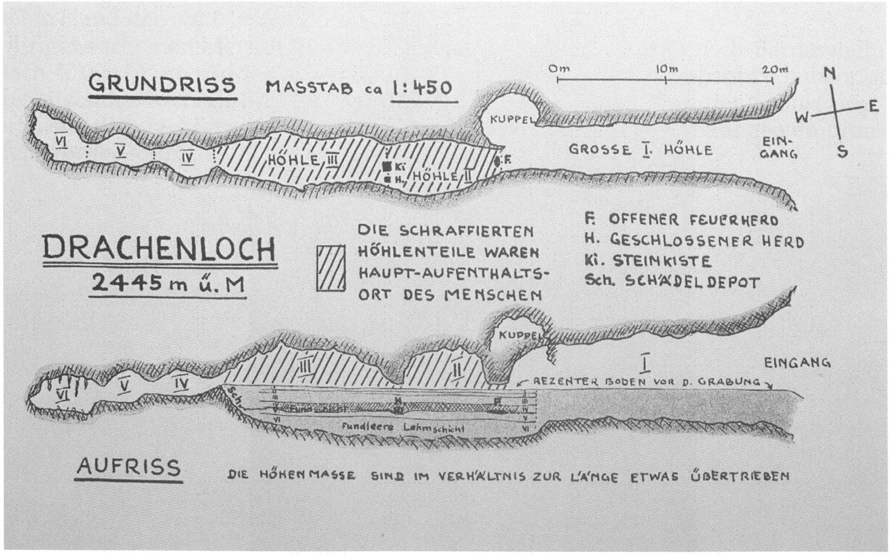 Der Leser staunt, wenn er liest, was Bächler wirklich direkt neben dem geschlossenen Herd angetroffen hatte ! Für ihn stand fest, dass er vor einem künstlichen, vom Menschen deponierten Lager von Höhlenbärenknochen stand (40 - 80 x 60 x 25 - 30 cm), wofür derselbe eine Grube ausgehoben und mit einer aus der Höhle stammenden, rechteckig zugehauenen Seewerkalkplatte von 90 x 60 x 5 - 8 cm zugedeckt hatte. ( Um der Vorstellung entgegenzutreten, dass es sich bei diesen Knochenlagern um während der Überwinterung verendete Bären handelte, die ein späterer Deckenbruch zugedeckt hätte, betonte er immer wieder, dass diese Lager nie die vollständigen Knochen eines einzelnen Individuums enthalten, nie nur einem Individuum und nie Individuen gleichen, sondern verschiedenen und u. z ausnahmslos jugendlichen Alters angehört hätten. Spontan ergänzte ich bei der Lektüre dieser Beteuerungen stets, dass ohne Vorhandensein einer künstlichen Grube oder eines oberflächlichen Schutzes bei einem Deckenbruch die Zertrümmerung der darunterliegenden Knochen total hätte sein müssen oder die Natur selbst hätte auf einen Schlag eine Steinkiste gebaut … – Ein Wasserfluss in diesem Ausmasse, dass er die Knochen durcheinandergewirbelt und teilweise fortgetragen hätte, war für eine Höhle mit einer Lage wie das Drachenloch am Fuss des Drachenberges auf 2427 m ü.M. - Abb. 2, S. 6 - hat, über alle Zeiten von vornherein auszuschliessen und Spuren von Tieren, die in den Knochen gewühlt, sie gefressen oder gar aus der Höhle entfernt hätten, existieren im Drachenloch ebenfalls keine !)