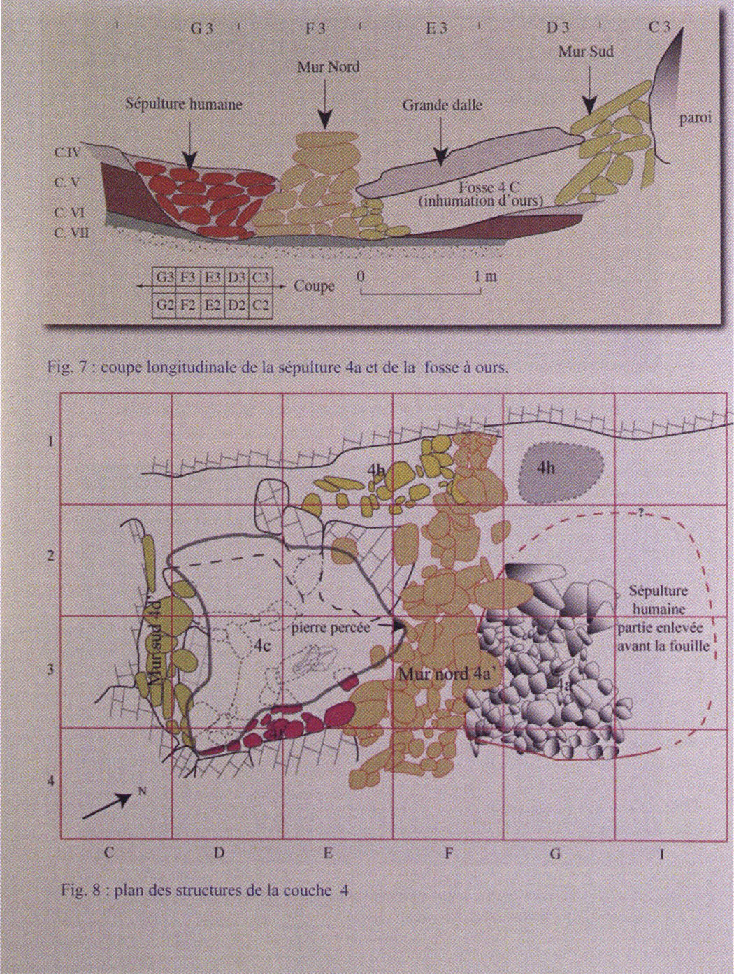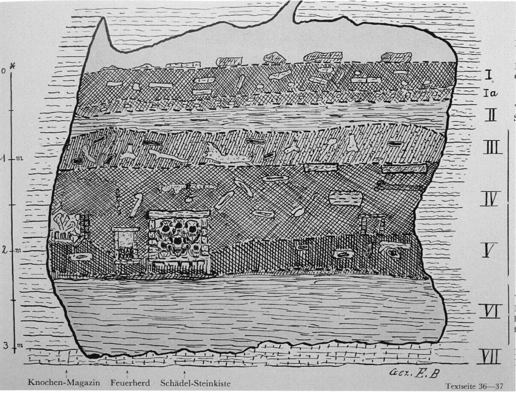 Fig. 159, p. 331: Right cave wall in section metres 5–7 of H III! — The niche indicated in the cross-section drawing (following figure) — which contained a large bone and skull deposit — has today disappeared behind the excavation rubble — see illustration!
