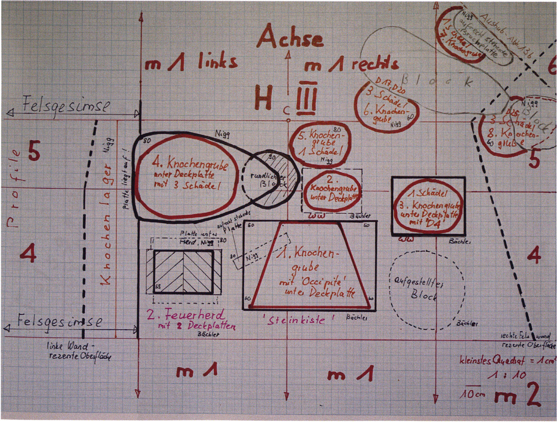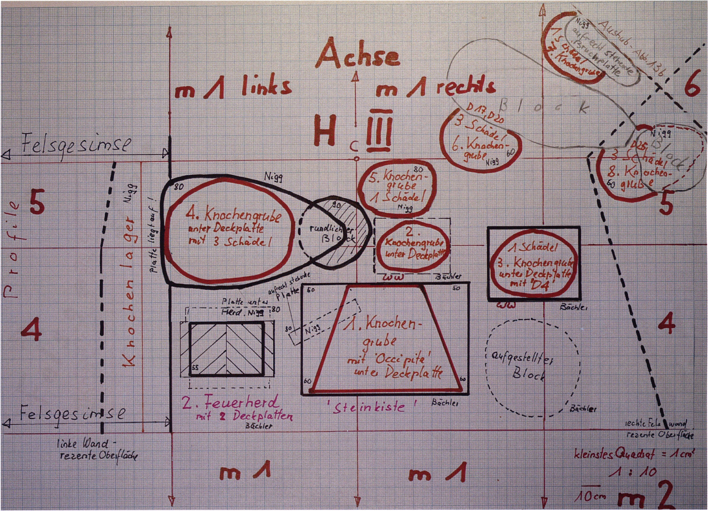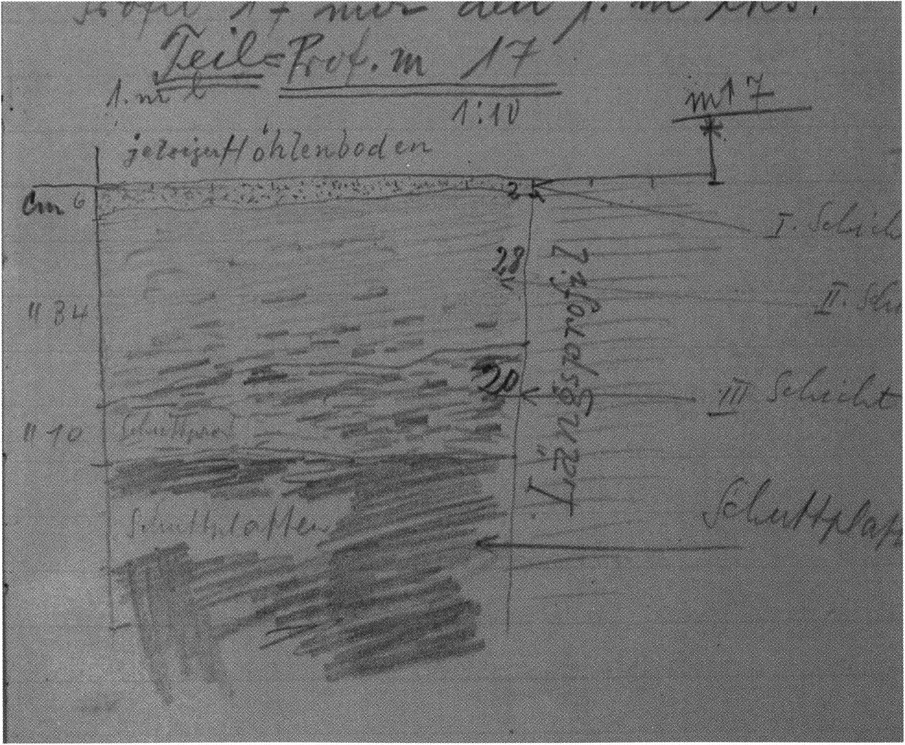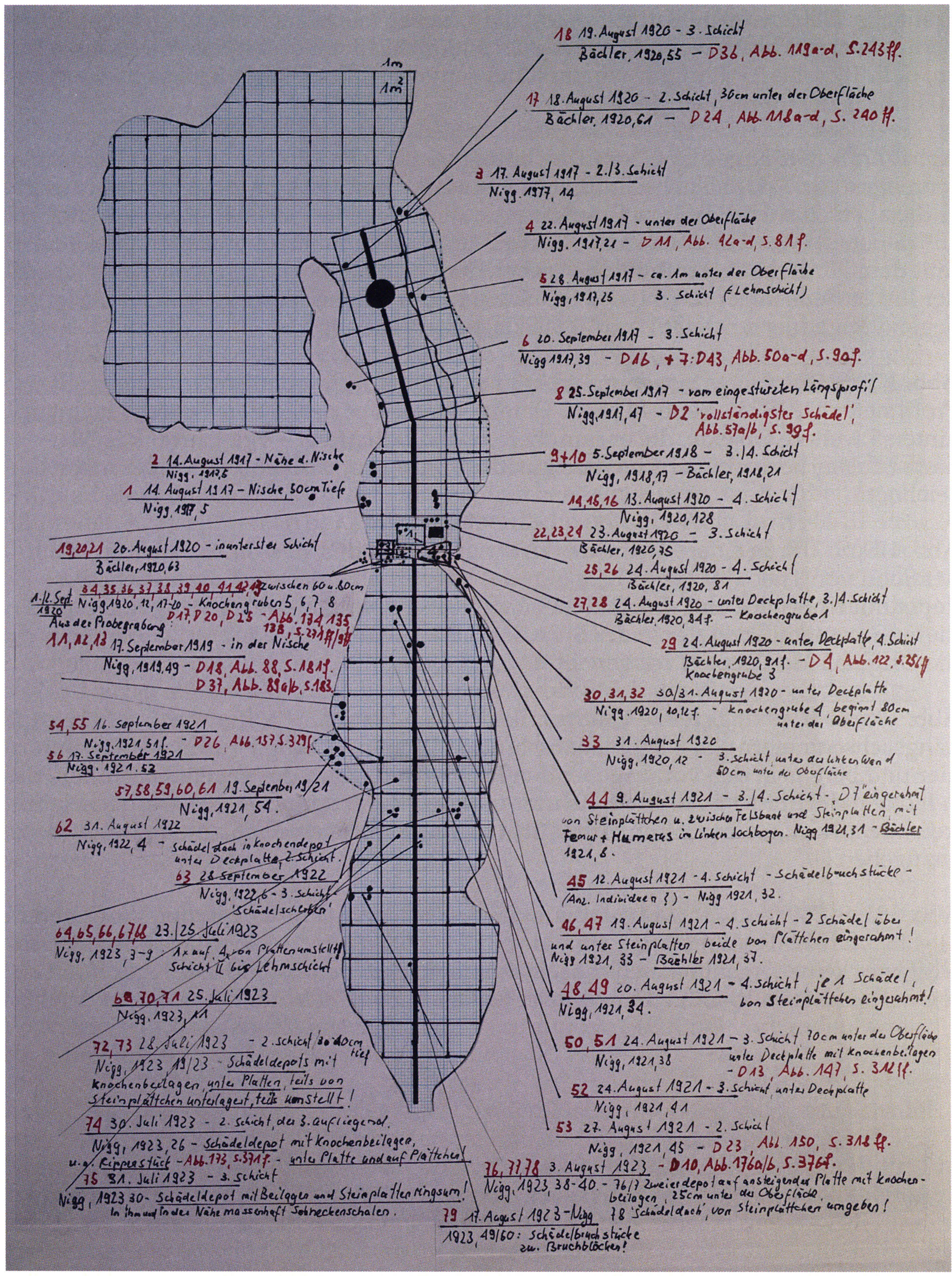 Fig. 178, p. 378: Nigg's situation sketch of the skull-roof depot in the 2nd m right, section metre 11, 1923 — p. 44 above. On it he sketches beside the skull roof from the rear 5 further objects — numbering and describing them — cf. Chronicle, p. 381; to these he adds a further 4that he only records, no longer drawing them!