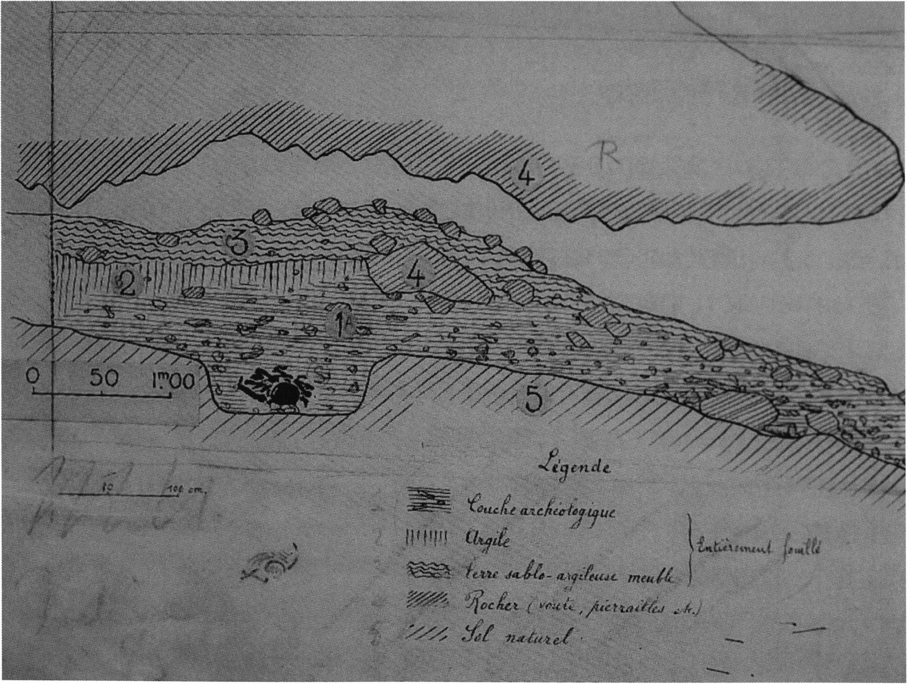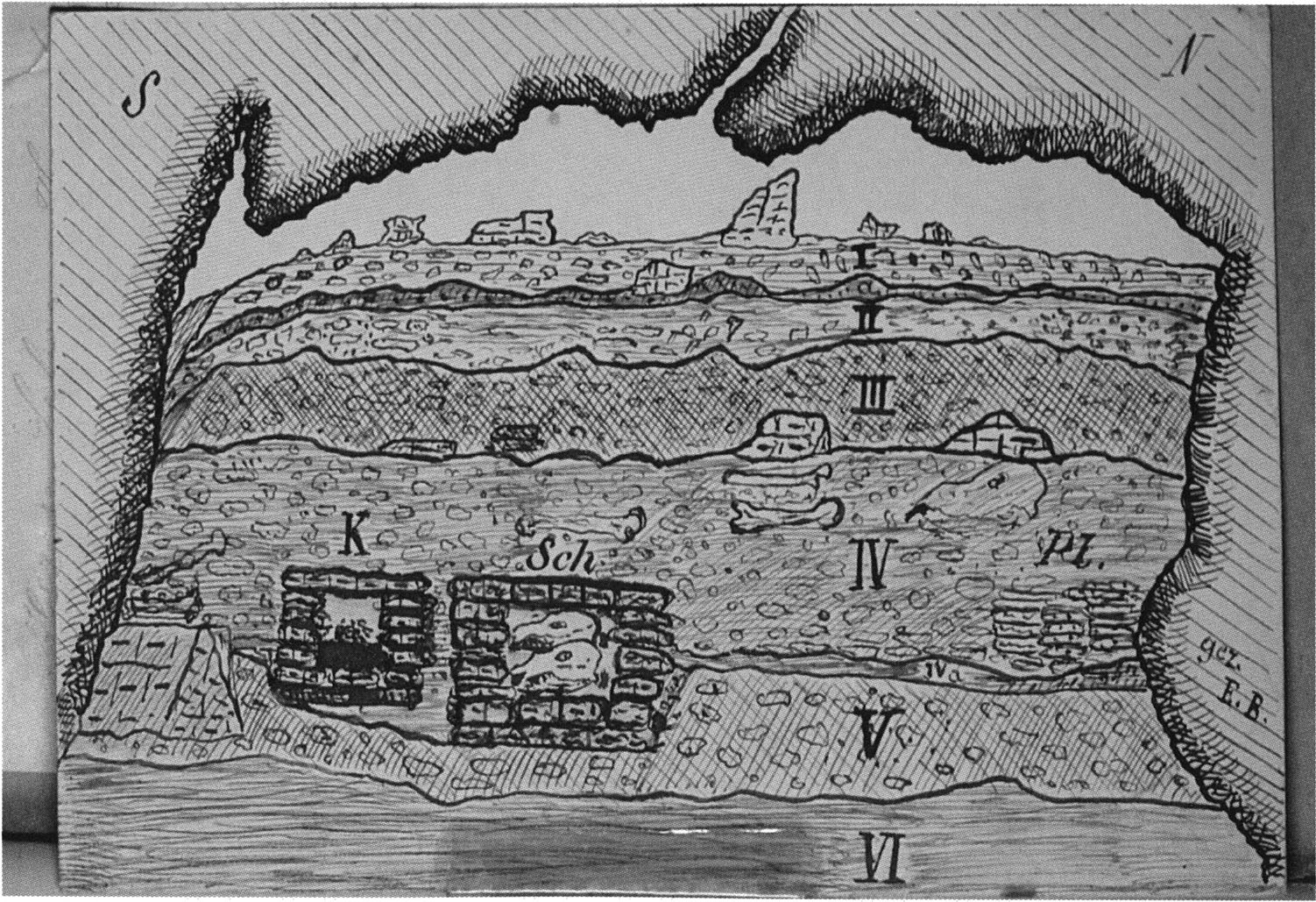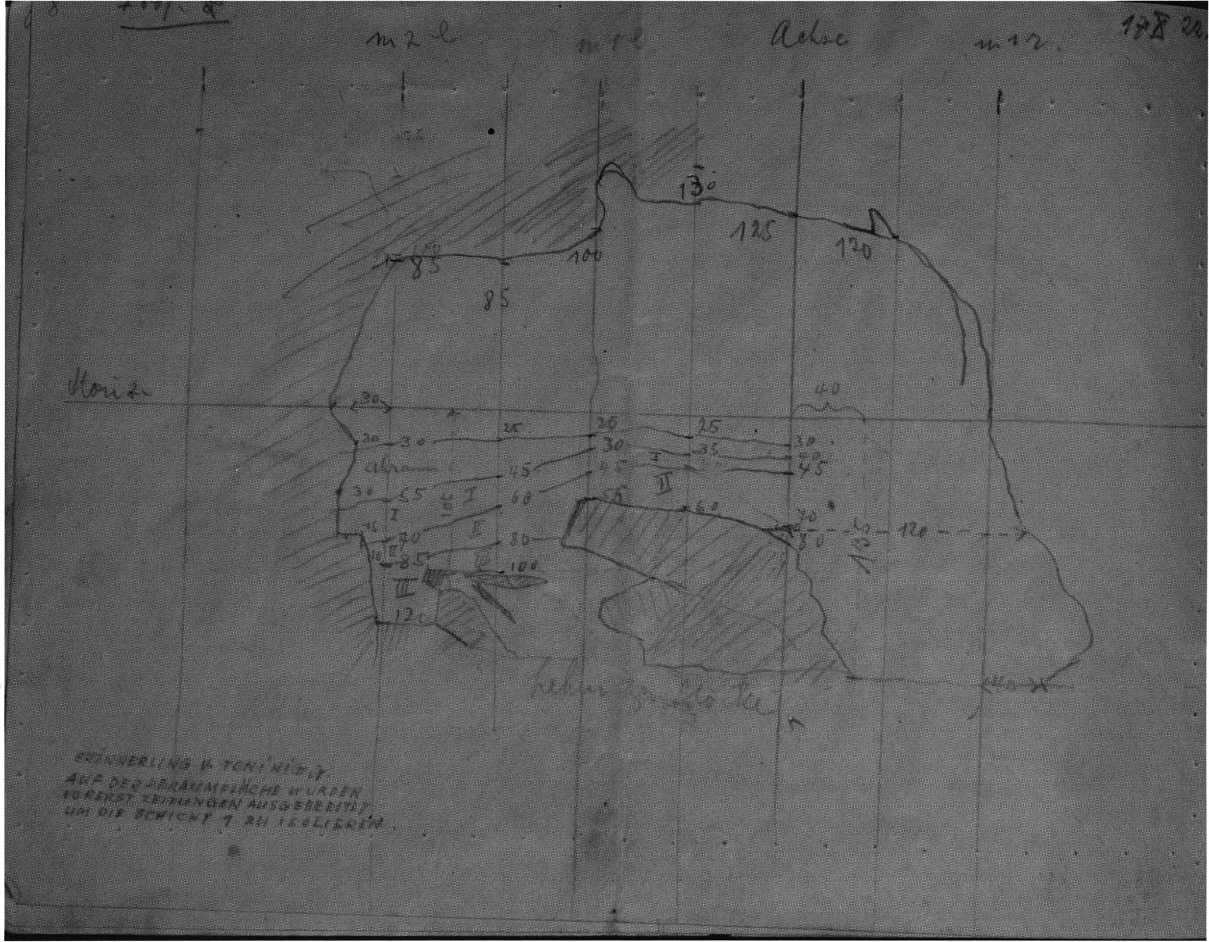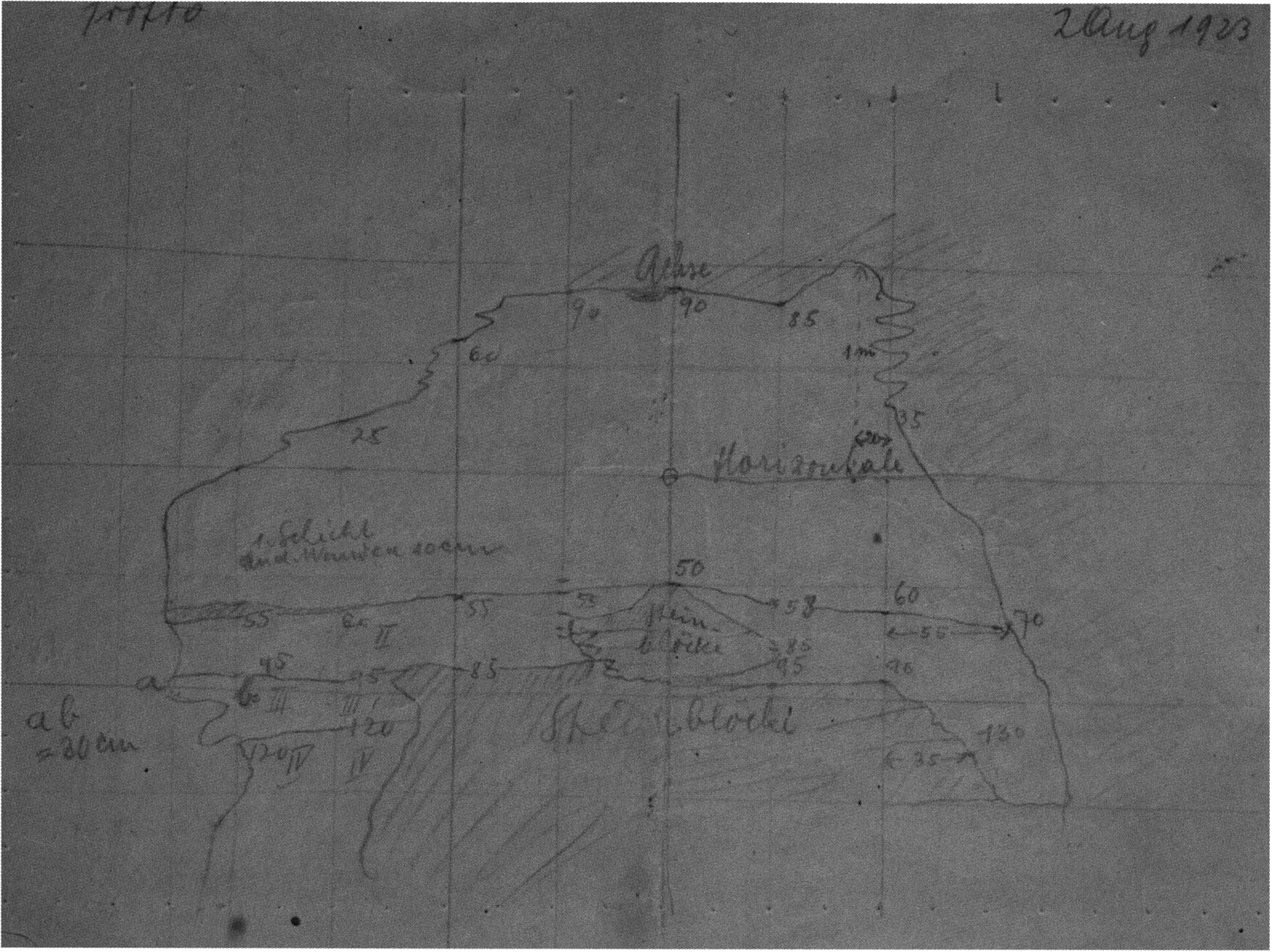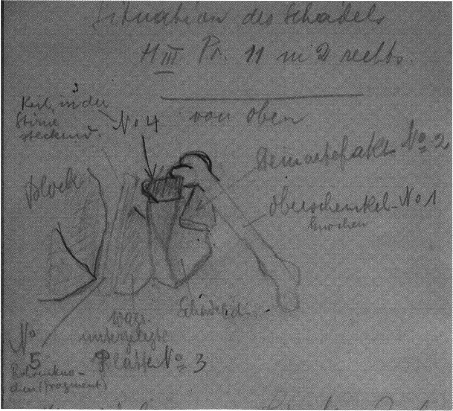Fig. 178, p. 378: Nigg's situation sketch of the skull-roof depot in the 2nd m right, section metre 11, 1923 — p. 44 above. On it he sketches beside the skull roof from the rear 5 further objects — numbering and describing them — cf. Chronicle, p. 381; to these he adds a further 4that he only records, no longer drawing them!