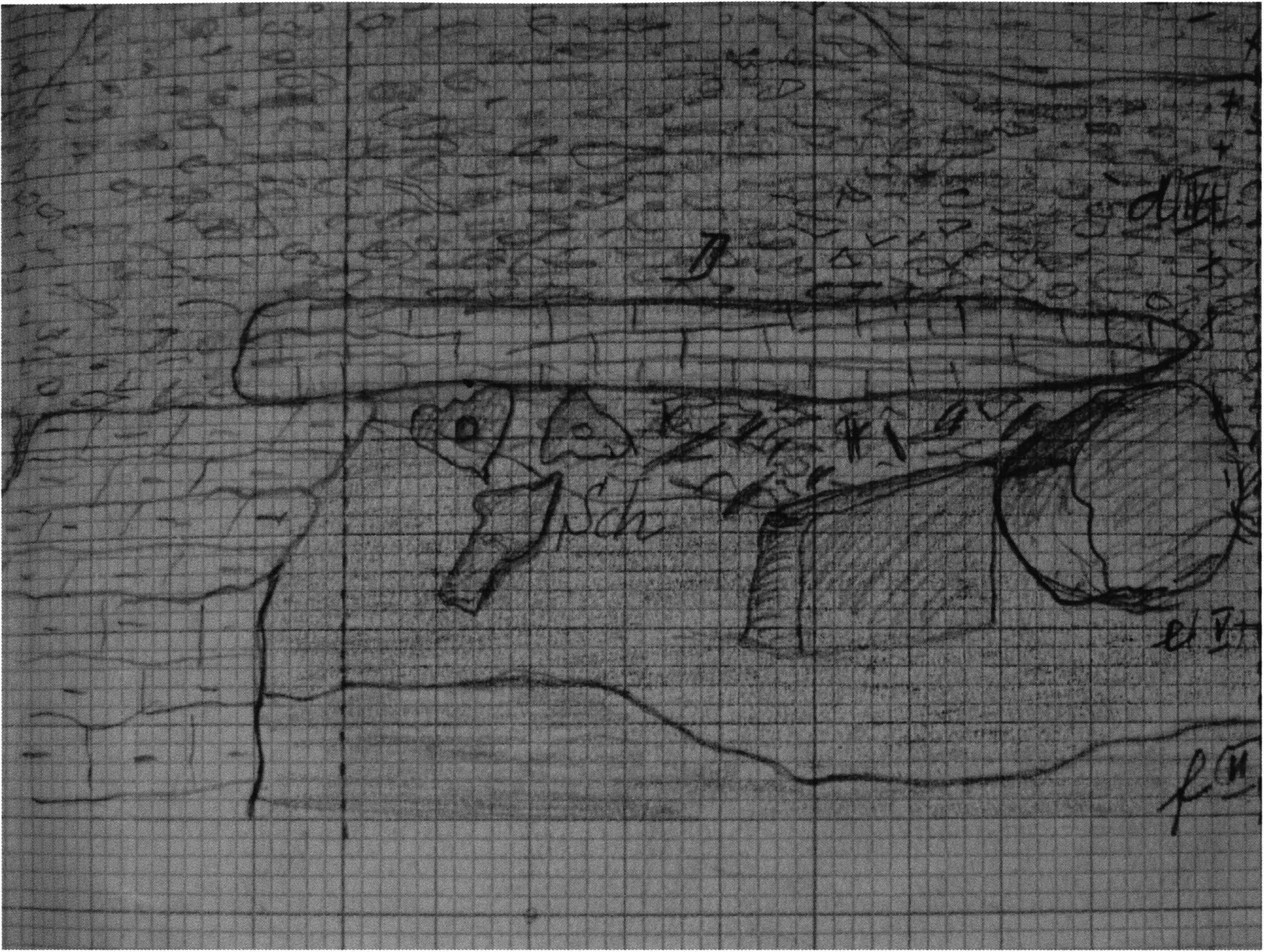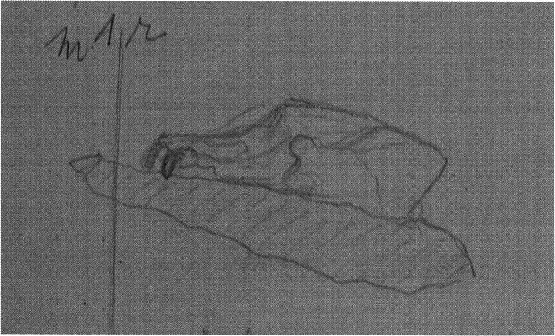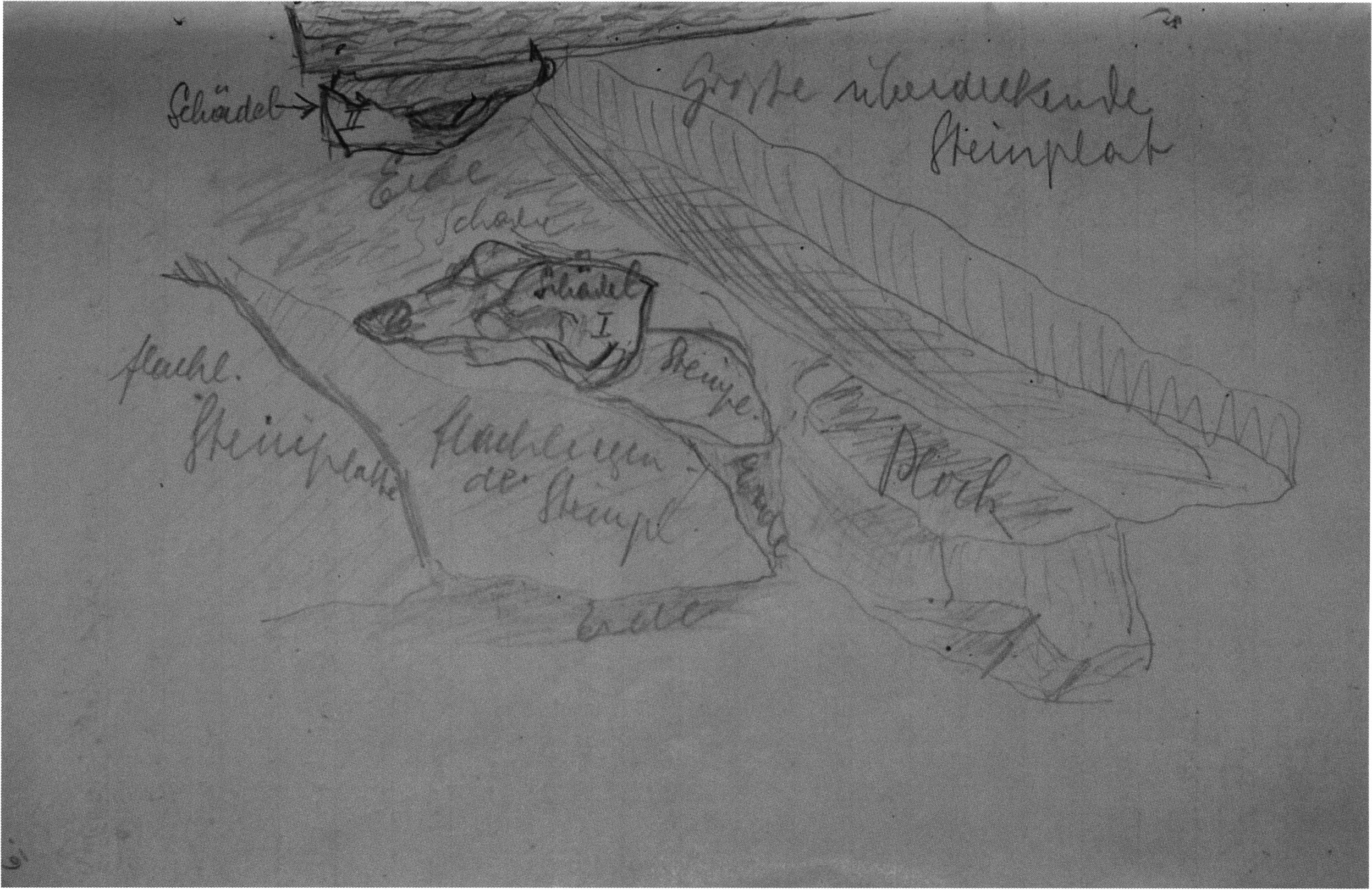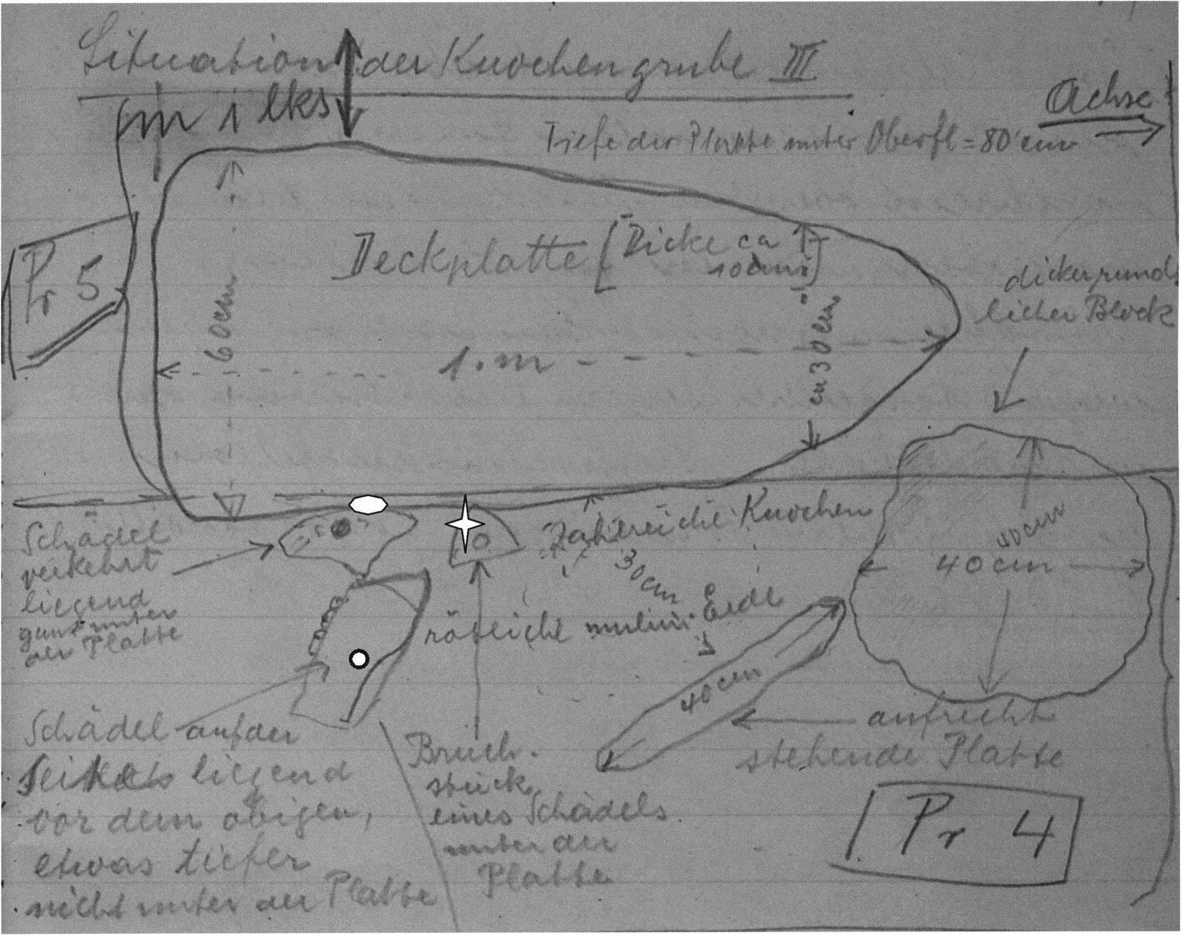 Fig. 158, p. 331: Nigg's simple situation sketch for the position of the skull and the bone deposit under a heavy, over 2 m long broken slab — 17 September 1921 — D V/6 5, 53.