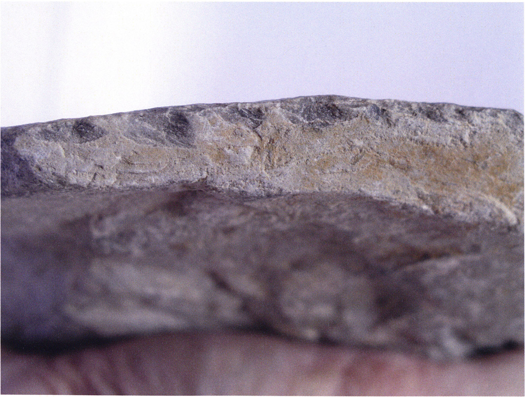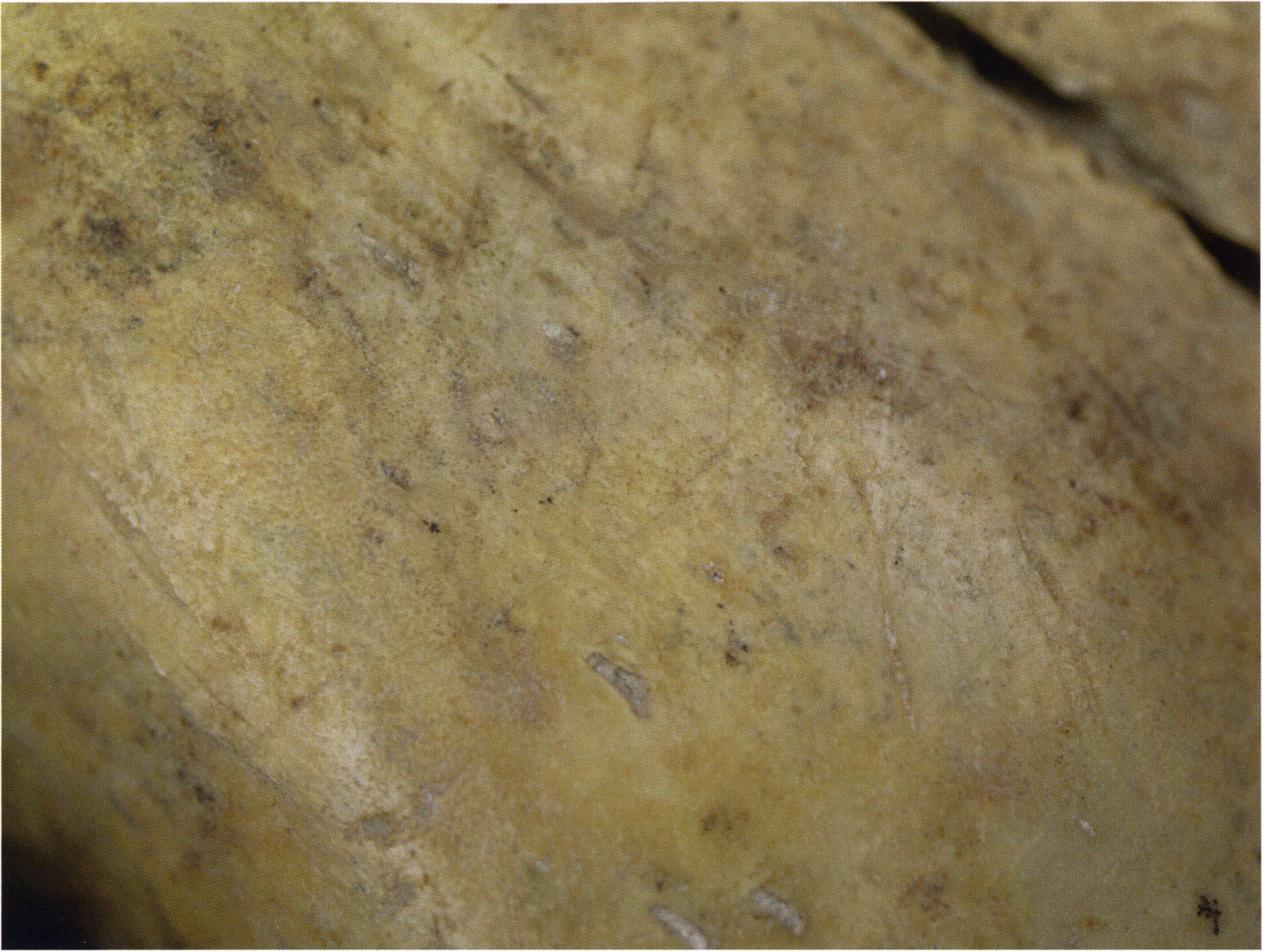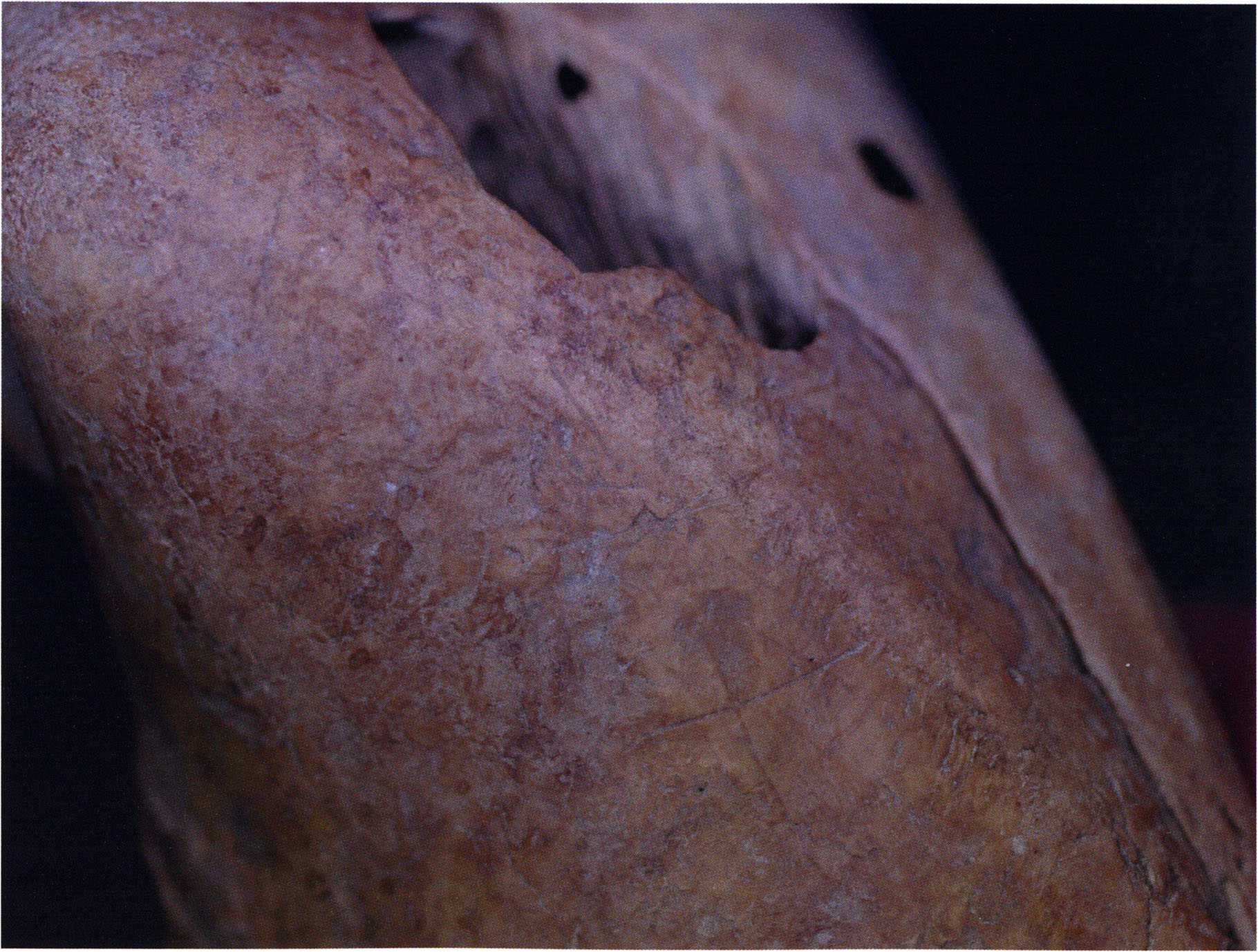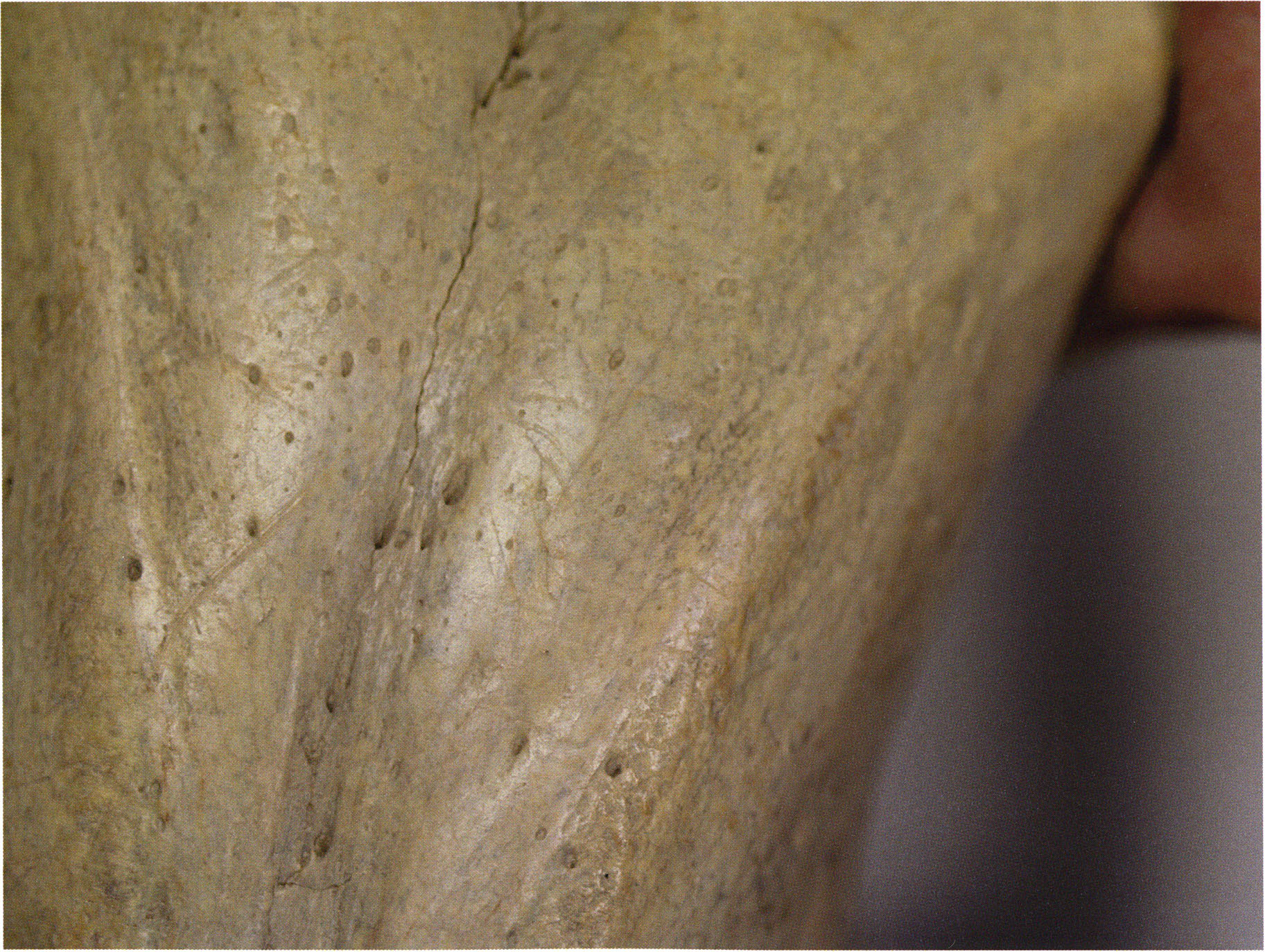 Steinskulpturen, wie hier eine vorzuliegen scheint, verlieren aber durch ihre Jahrtausende und Jahrzehntausende währende Einlagerung im Boden ihre einstmals vorhandenen, scharf kantigen Bearbeitungsspuren der Bildhauerarbeit und weisen an allen diesen Arbeitsstellen, insbesondere auch an den Rändern, eine abgeschliffene, gerundete Oberfläche auf. Die Natur wird gleichsam zur zweiten Bildhauerin und verleiht dem Kunstwerk eine Patina, die zu geben sie allein vermag ! An einem solchen Objekt nachzuweisen, dass es von Hand des Menschen stammt und kein rein zufälliges Produkt der Natur ist, ist nicht immer mehr möglich. Glücklicherweise lässt sich aber bei unserer Gebärenden vom Drachenloch an der Basis eine eindeutige Bearbeitungsstelle noch nachweisen: Von blossem Auge gut erkennbar hat der Bildhauer dort einen rechteckigen, rund 20 x 5 mm grossen Schlitz – wahrscheinlich die symbolische Darstellung des weiblichen Schosses - aus der hellen Seewerkalkoberflläche herausgemeisselt – Abb. 17 d, S. 26. Von dieser eindeutigen Bearbeitungsspur abgesehen machen aber allein schon die regelmässige, geometrische Form des Objektes und die modellierte Hinterkopfsilhouette mit der anschliessenden abgewinkelten, geraden Rückenlinie diesen Stein zu einer Figur, aus der unzweifelhaft der kreativ gestaltende Geist des Menschen spricht (und keine Hand des natürlichen Zufalls).