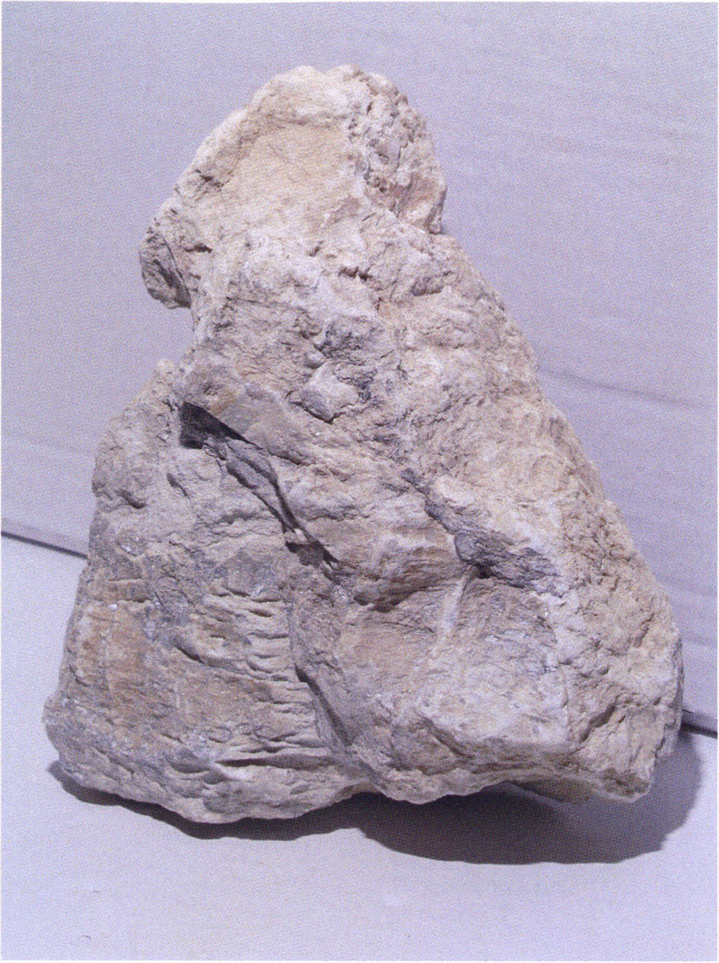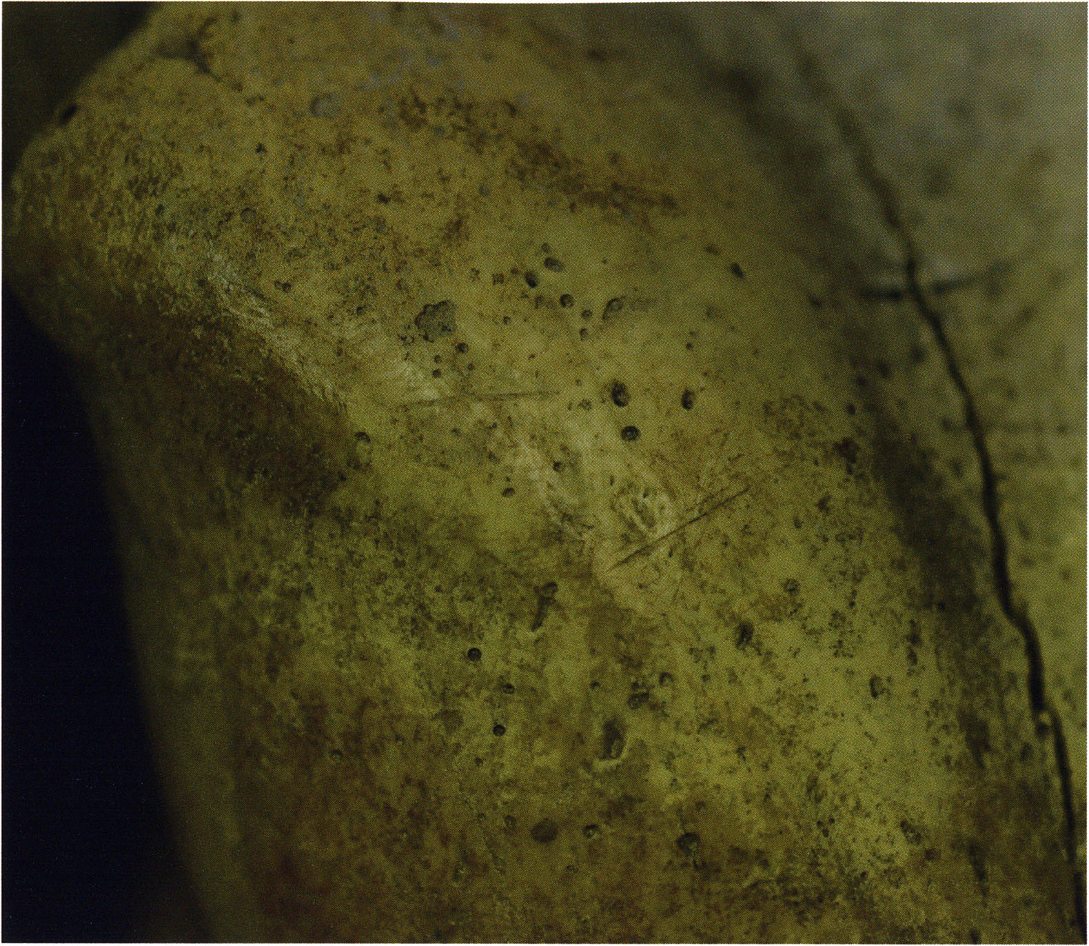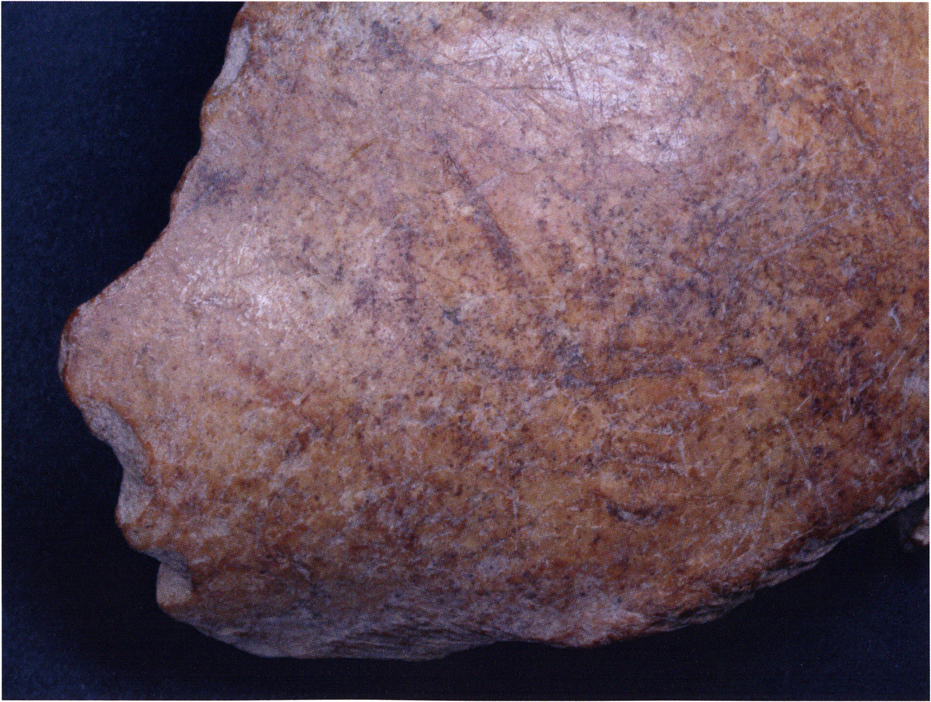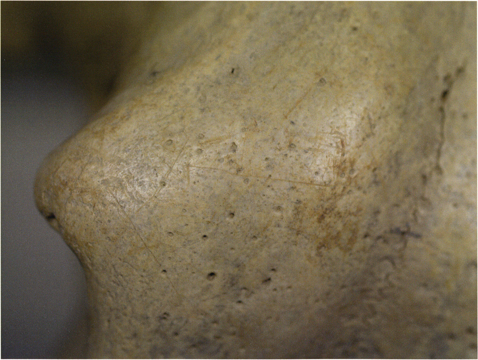 Steinskulpturen, wie hier eine vorzuliegen scheint, verlieren aber durch ihre Jahrtausende und Jahrzehntausende währende Einlagerung im Boden ihre einstmals vorhandenen, scharf kantigen Bearbeitungsspuren der Bildhauerarbeit und weisen an allen diesen Arbeitsstellen, insbesondere auch an den Rändern, eine abgeschliffene, gerundete Oberfläche auf. Die Natur wird gleichsam zur zweiten Bildhauerin und verleiht dem Kunstwerk eine Patina, die zu geben sie allein vermag ! An einem solchen Objekt nachzuweisen, dass es von Hand des Menschen stammt und kein rein zufälliges Produkt der Natur ist, ist nicht immer mehr möglich. Glücklicherweise lässt sich aber bei unserer Gebärenden vom Drachenloch an der Basis eine eindeutige Bearbeitungsstelle noch nachweisen: Von blossem Auge gut erkennbar hat der Bildhauer dort einen rechteckigen, rund 20 x 5 mm grossen Schlitz – wahrscheinlich die symbolische Darstellung des weiblichen Schosses - aus der hellen Seewerkalkoberflläche herausgemeisselt – Abb. 17 d, S. 26. Von dieser eindeutigen Bearbeitungsspur abgesehen machen aber allein schon die regelmässige, geometrische Form des Objektes und die modellierte Hinterkopfsilhouette mit der anschliessenden abgewinkelten, geraden Rückenlinie diesen Stein zu einer Figur, aus der unzweifelhaft der kreativ gestaltende Geist des Menschen spricht (und keine Hand des natürlichen Zufalls).