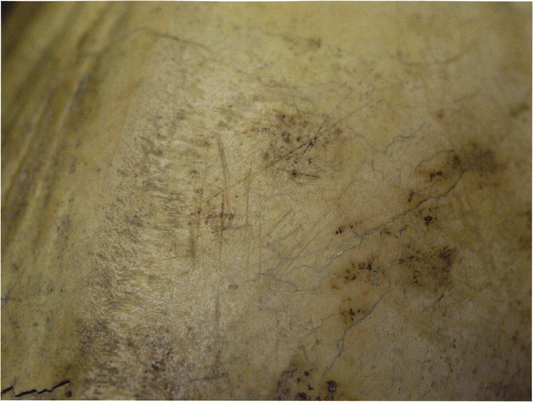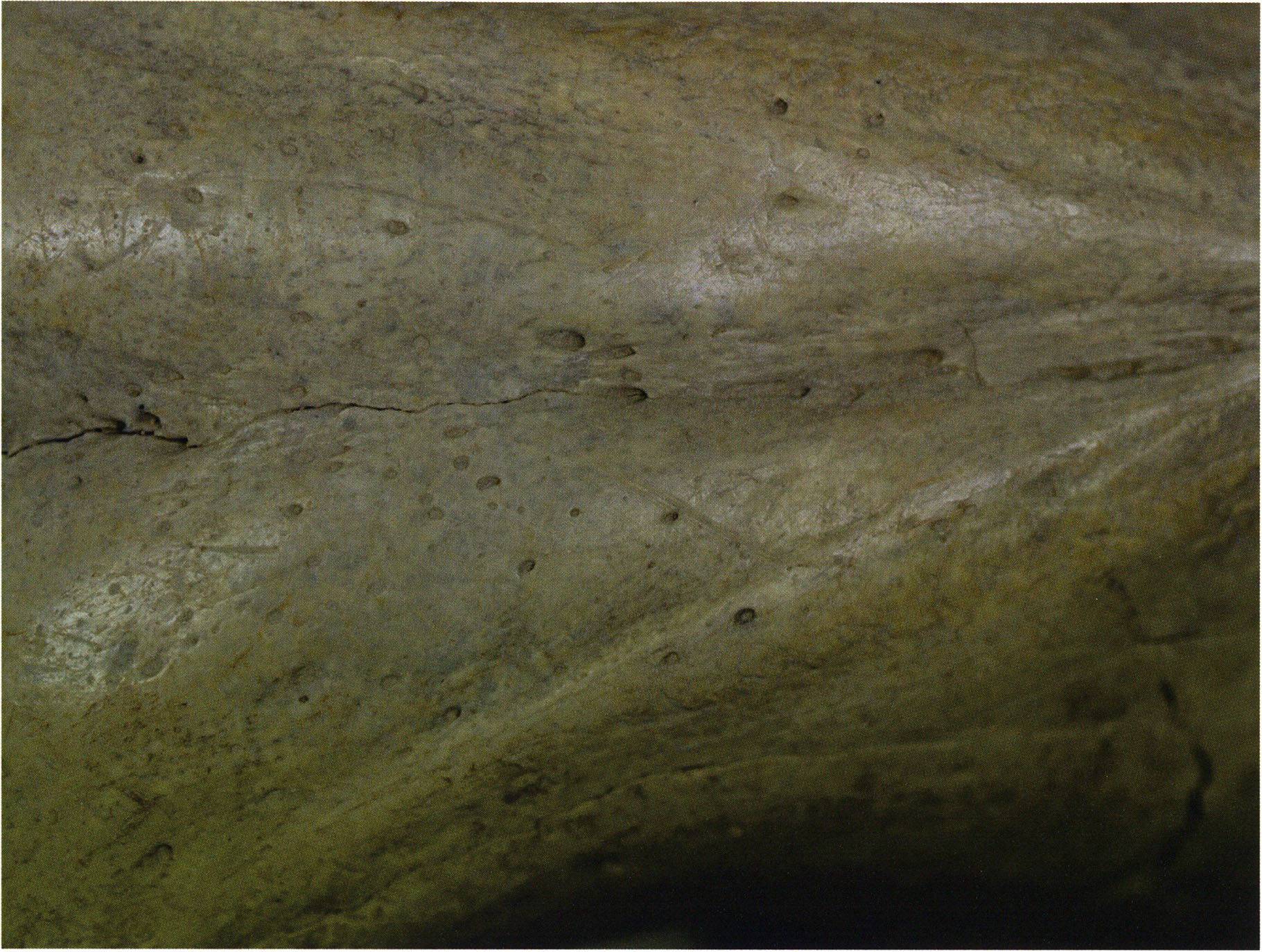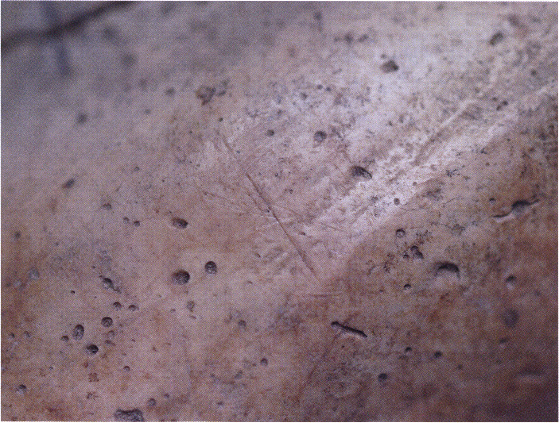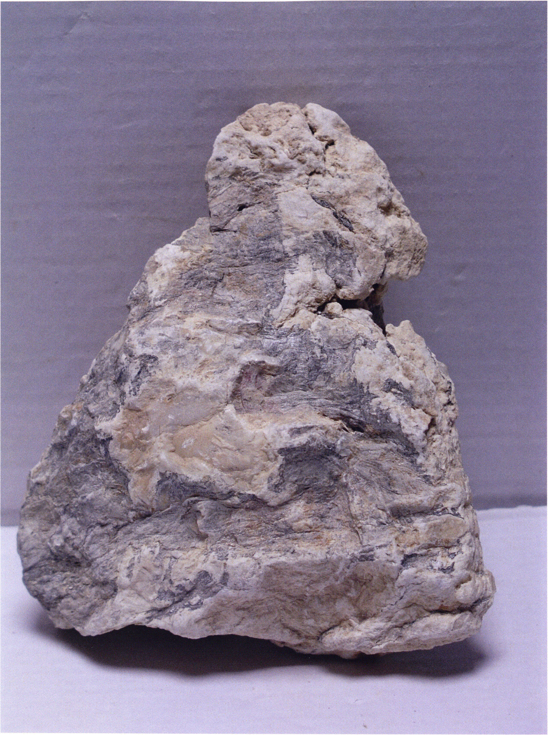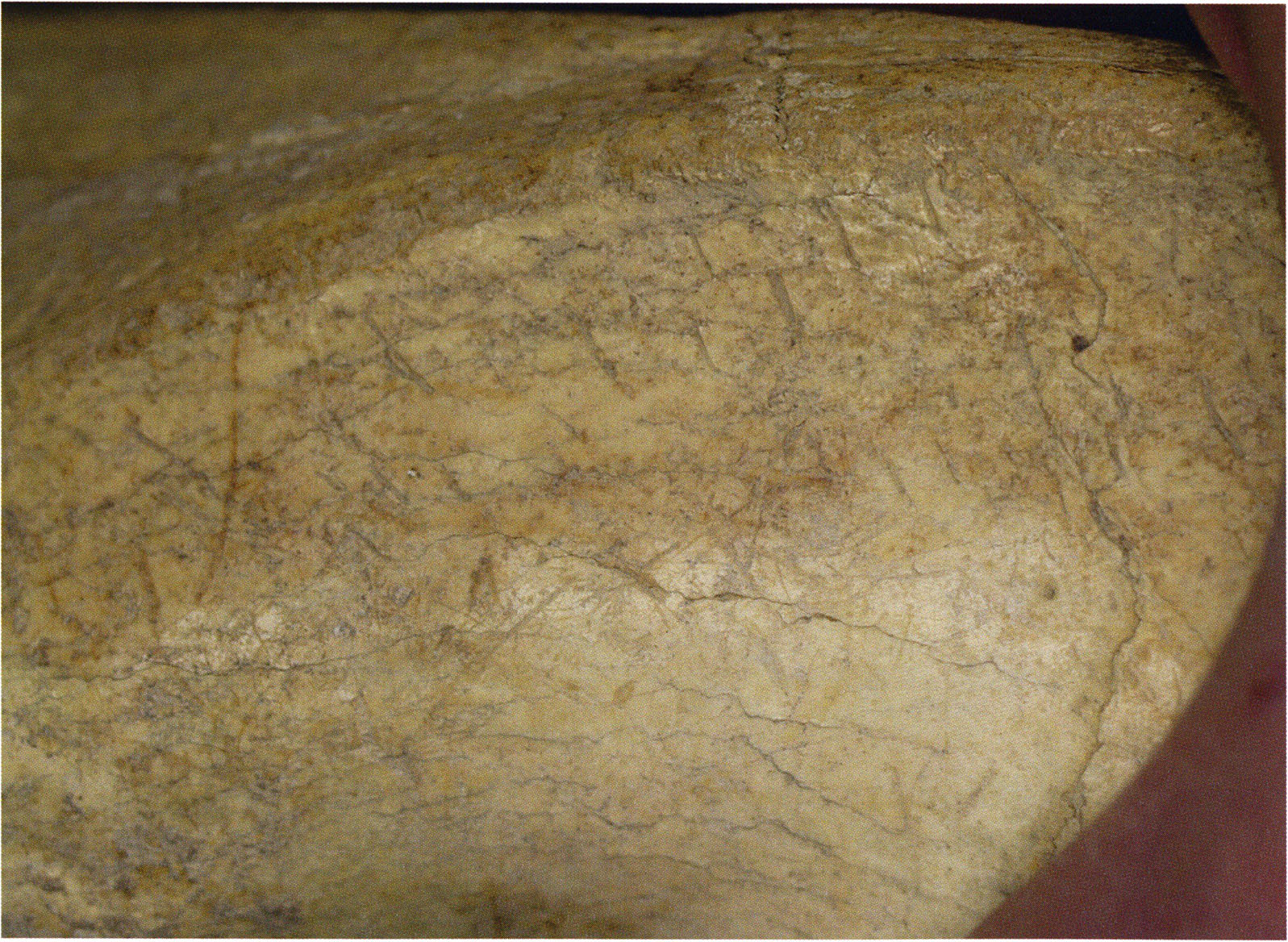 Steinskulpturen, wie hier eine vorzuliegen scheint, verlieren aber durch ihre Jahrtausende und Jahrzehntausende währende Einlagerung im Boden ihre einstmals vorhandenen, scharf kantigen Bearbeitungsspuren der Bildhauerarbeit und weisen an allen diesen Arbeitsstellen, insbesondere auch an den Rändern, eine abgeschliffene, gerundete Oberfläche auf. Die Natur wird gleichsam zur zweiten Bildhauerin und verleiht dem Kunstwerk eine Patina, die zu geben sie allein vermag ! An einem solchen Objekt nachzuweisen, dass es von Hand des Menschen stammt und kein rein zufälliges Produkt der Natur ist, ist nicht immer mehr möglich. Glücklicherweise lässt sich aber bei unserer Gebärenden vom Drachenloch an der Basis eine eindeutige Bearbeitungsstelle noch nachweisen: Von blossem Auge gut erkennbar hat der Bildhauer dort einen rechteckigen, rund 20 x 5 mm grossen Schlitz – wahrscheinlich die symbolische Darstellung des weiblichen Schosses - aus der hellen Seewerkalkoberflläche herausgemeisselt – Abb. 17 d, S. 26. Von dieser eindeutigen Bearbeitungsspur abgesehen machen aber allein schon die regelmässige, geometrische Form des Objektes und die modellierte Hinterkopfsilhouette mit der anschliessenden abgewinkelten, geraden Rückenlinie diesen Stein zu einer Figur, aus der unzweifelhaft der kreativ gestaltende Geist des Menschen spricht (und keine Hand des natürlichen Zufalls).