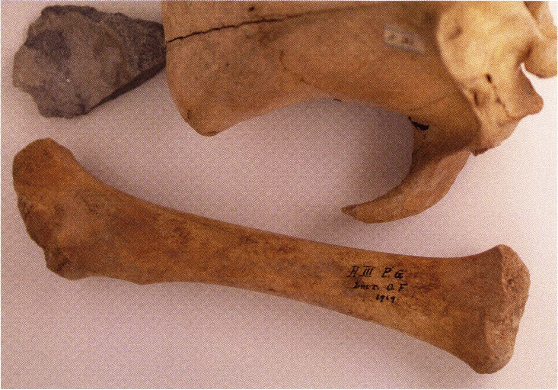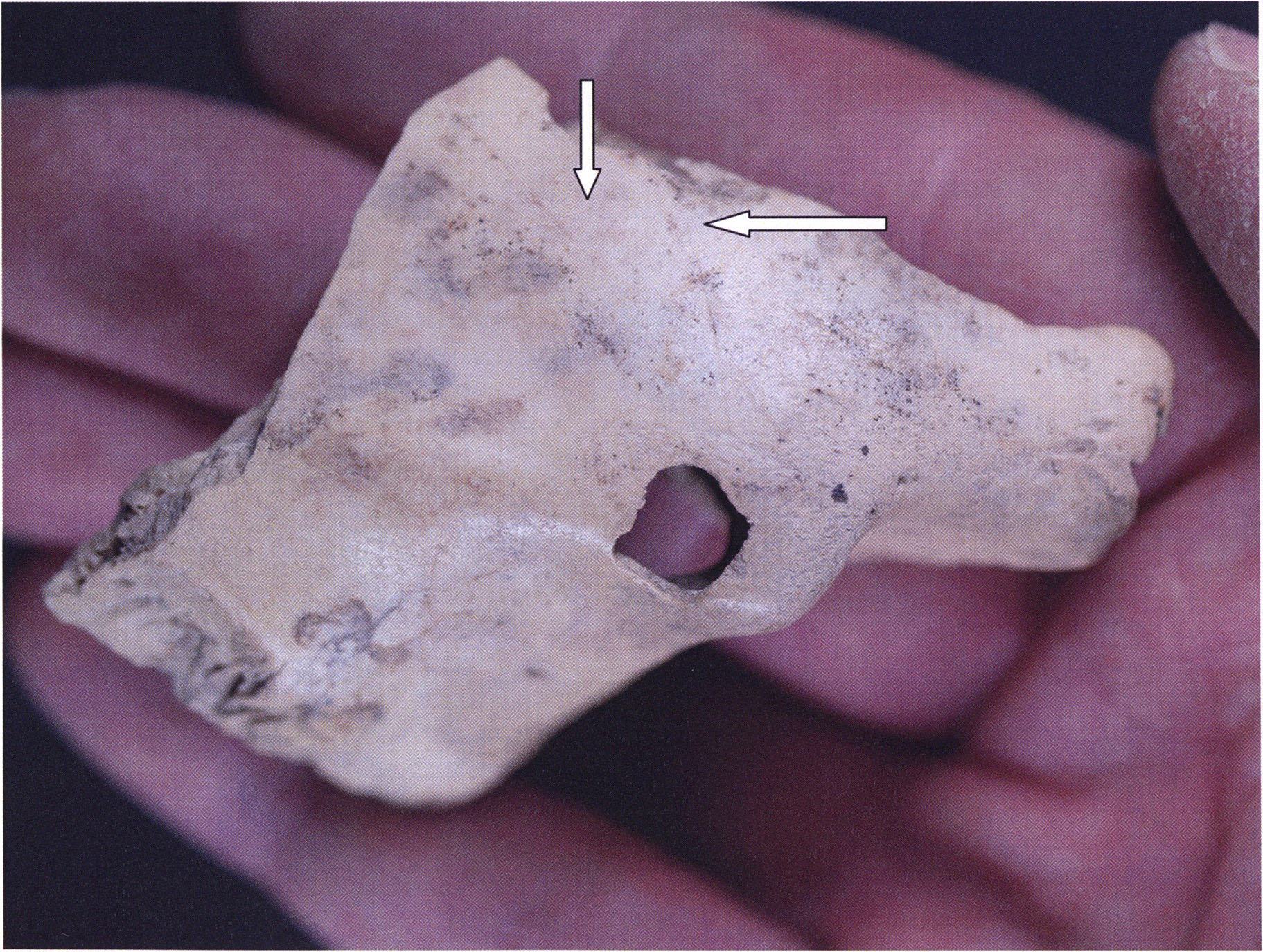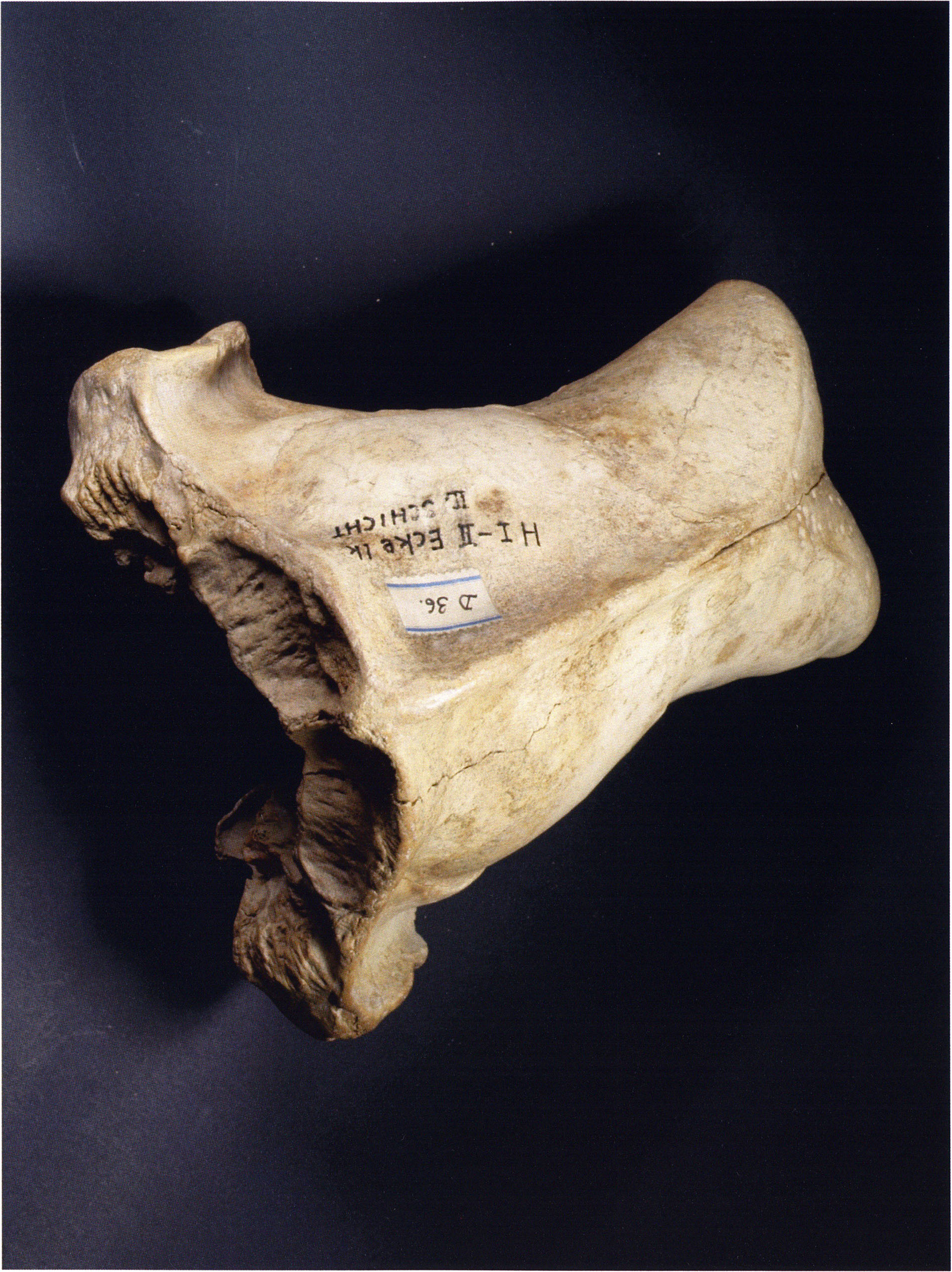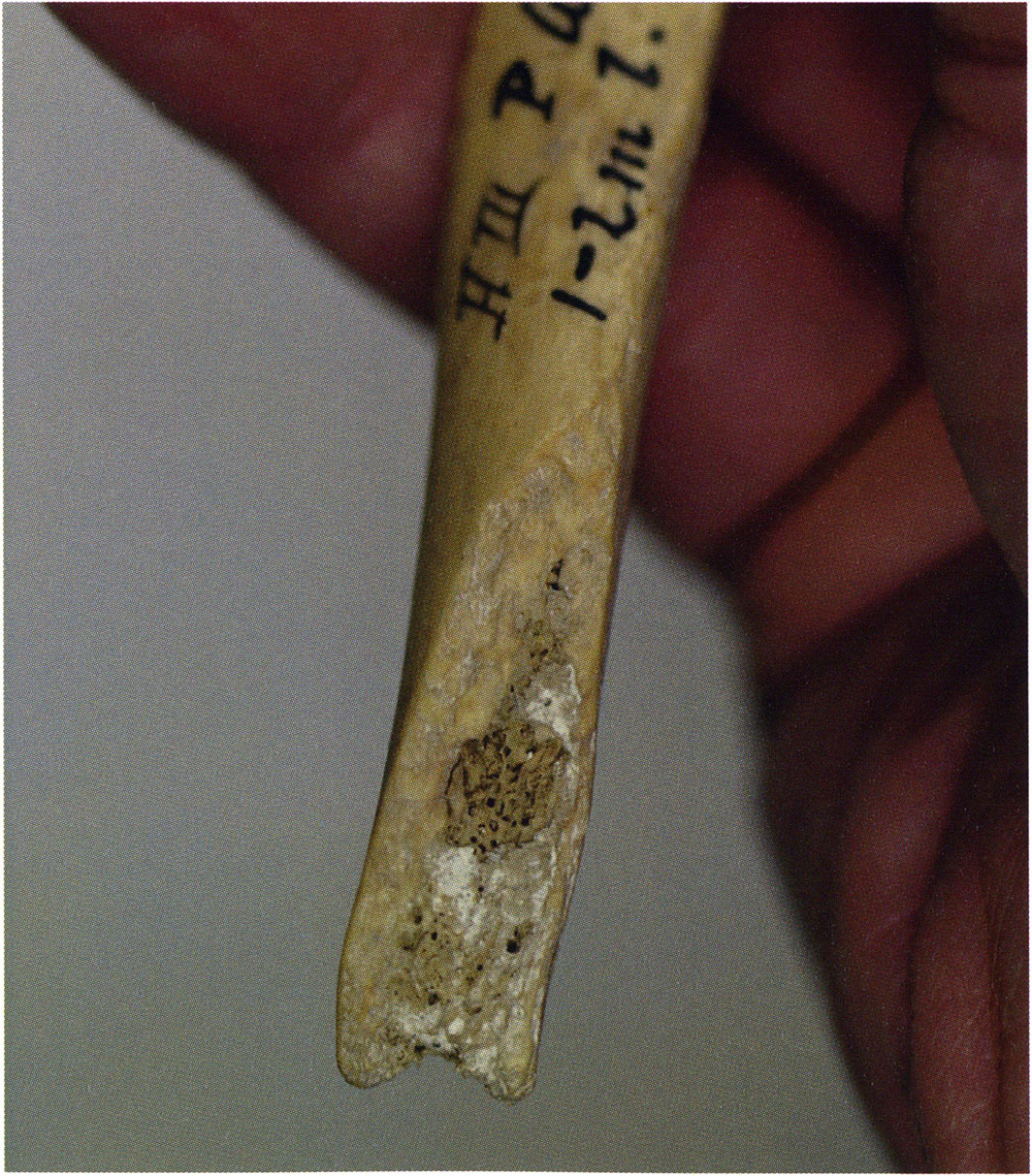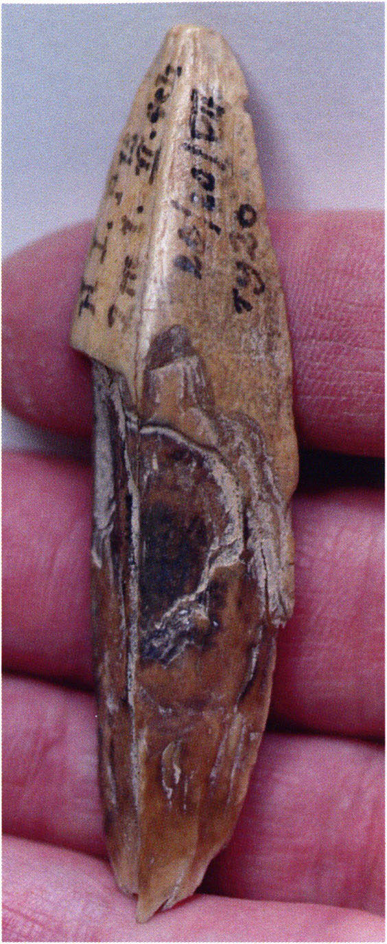 Two reasons presumably prompted Nigg's striking formulation "curious bone fragment" and his uncertainty "ibex?": The bone fragment could not be readily assigned — by its form and size — to the species practically exclusively represented in the Drachenloch, "Ursus spelaeus" (= cave bear), and moreover it was "perforated." Nigg wrote "perforated" and not "it had a hole" because he immediately thought of the activity of man! —
