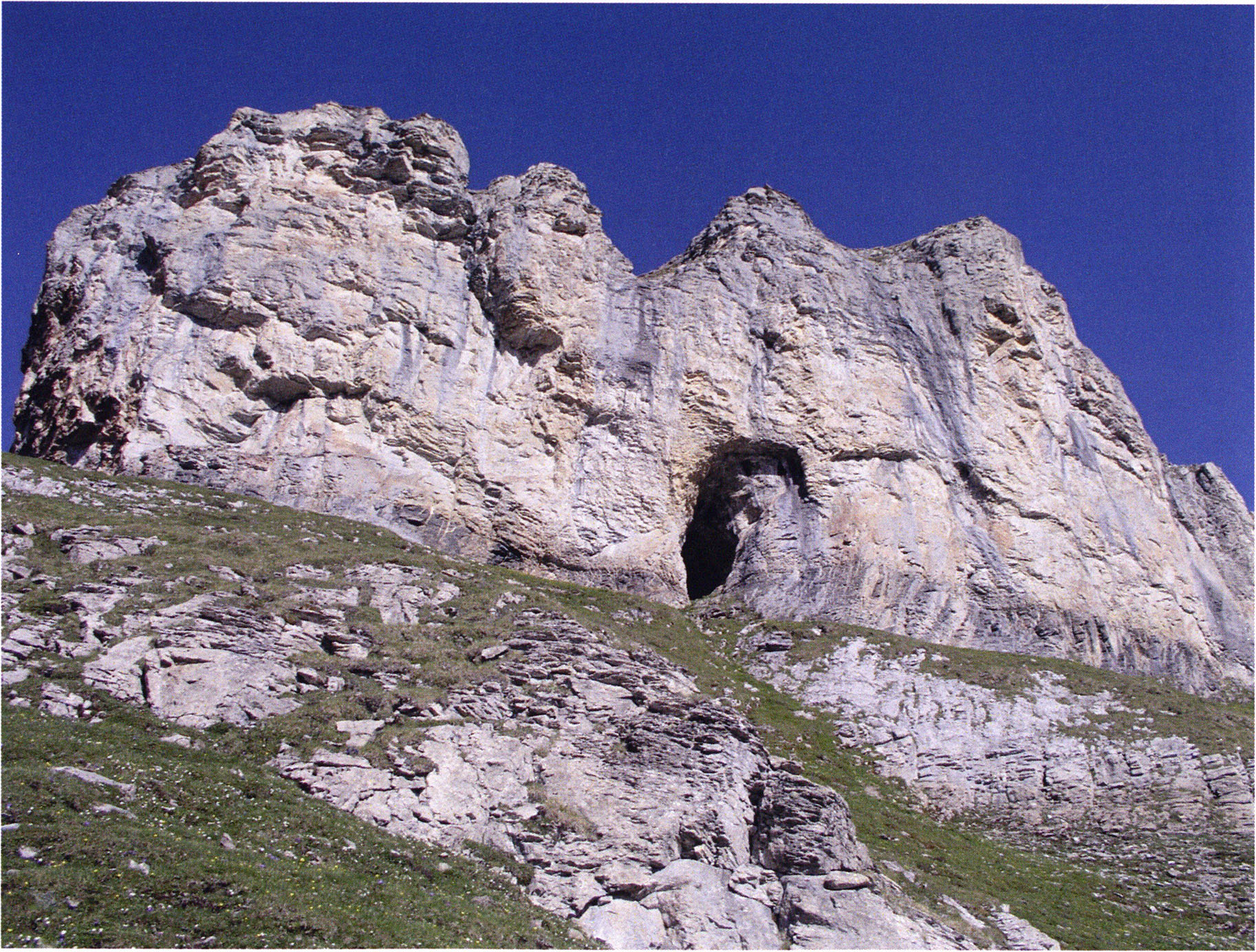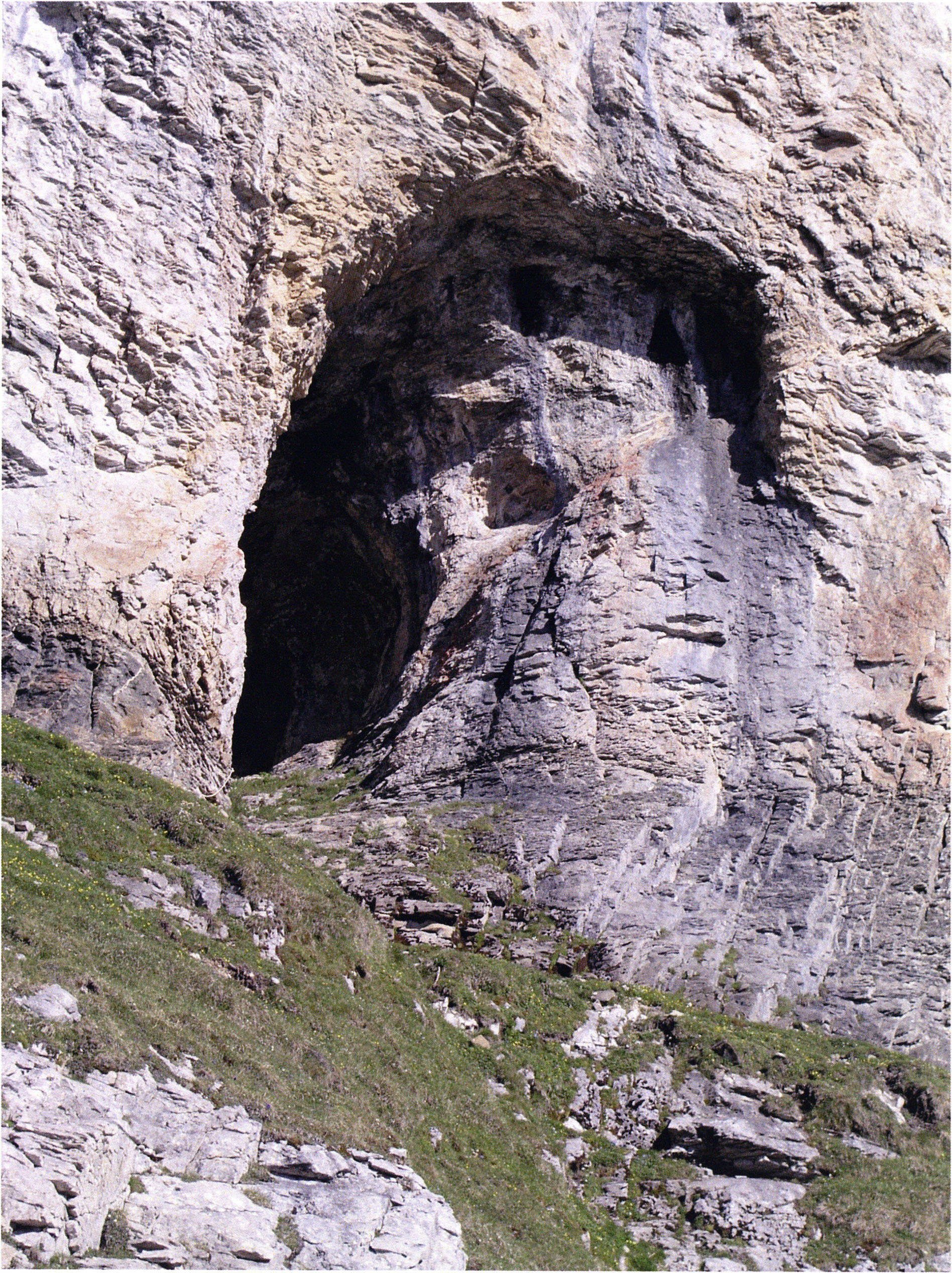 Die Tatsache, dass im Drachenloch unter den möglichen Jagdtieren des Neandertalers einzig dem Höhlenbären eine rituelle Entsorgung gleich einer B e s t a t t u n g durch denselben zuteil wurde, d. h. in dieser Höhle kein nennenswerter Abfall anderer Beutetiere aufgefunden worden war, macht das Drachenloch zu einem riesigen “O s s a r i u m d e s H ö h l e n b ä r e n”. Auf den Betrachter von heute wie von damals wirkt der Felsenkranz mit dem Höhleneingang in der Mitte - Abb. 16, S. 23 - wie ein mittelalterlicher Schoss. Auch dem Neandertaler-Menschen entging dieses augenfällige, symbolische Bild in der Natur des Drachenberges nicht; die Drachenloch-Höhle erschien ihm wie geschaffen für seinen B e s t a t t u n g s r i t u s der Knochen und Schädel seiner getöteten Höhlenbären. Derselbe zielte wie gesagt ganz offensichtlich auf die Geburt neuer Höhlenbären aus dem mütterlichen Schoss des Drachenlochs !