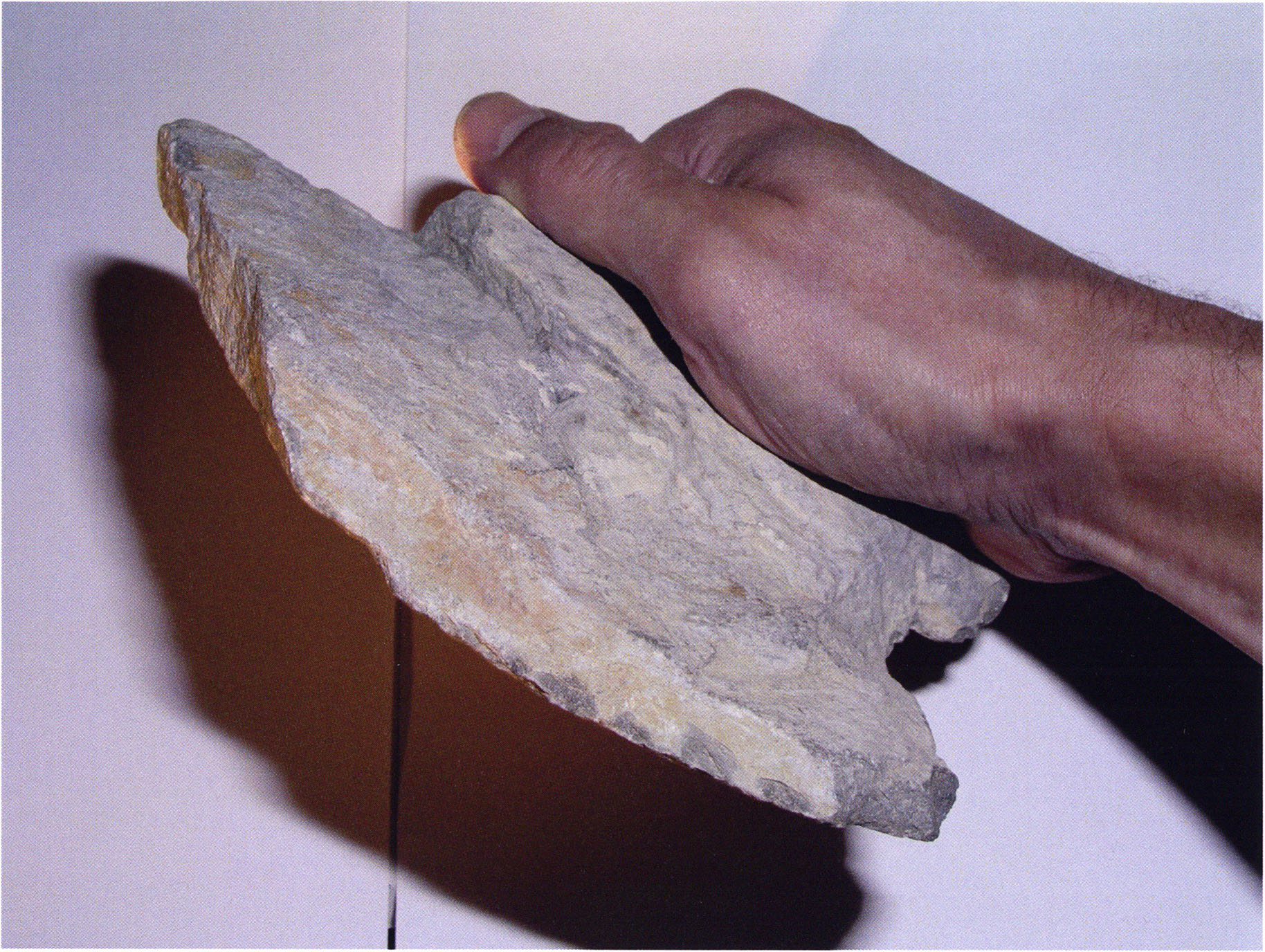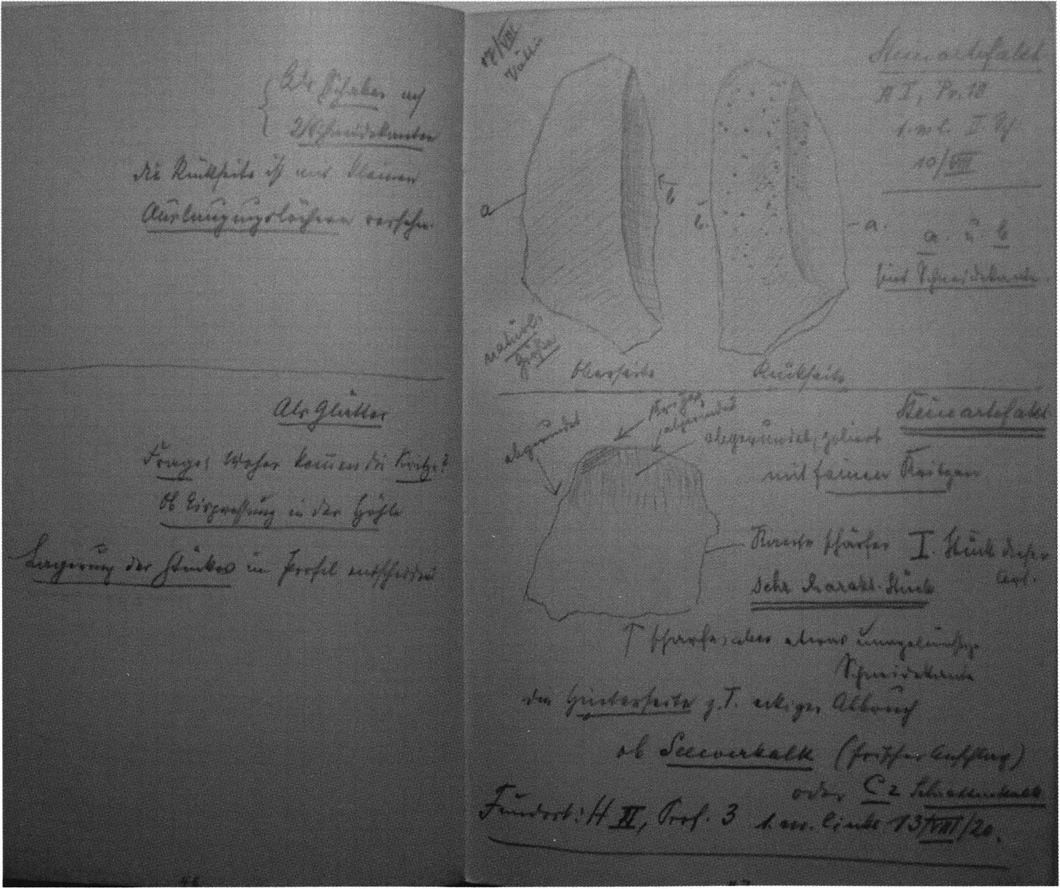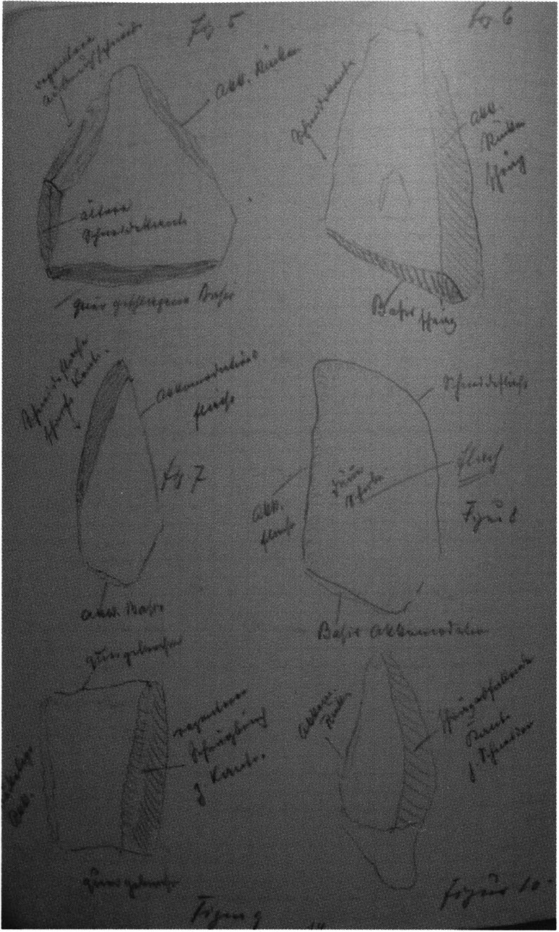 Figs. 165 and 166 a/b, pp. 360 f.: In a drawer of the east wall cabinet in the Drachenloch room of the Kirchhofer house there lie in a wooden cigar box Seewerkalk pieces — among them the artefacts illustrated here — and a slip of paper giving their provenance: "H III section 9, 1st m left, 2nd/3rd layer — suspicious material on stone slab, 23 July 1923." These details accord with RECORD NIGG of 23 July 1923, see p. 356: " In the 2nd and (partly) 3rd layer — m 1 left — I dig down to the slab in section 8 and toward the rear to the face of the slab projecting from the floor" — i.e. into section 9, since the "face" of the second-named slab — resting slightly on the first — lies there. The former slab is the one resting on a block and situated at axis height and in the 1st m left of it in section 8 — projecting still partly into section 9 — cf. sections 8 and 9, Figs. 161 and 168, pp. 357 and 362! — Even though the writer of the slip uses only the phrase "suspicious material" — Nigg's characteristic (over-) cautious formulation of his first impression, which recurs again and again in his records! — the artefact character of both objects illustrated here is beyond question: Fig. 165 — handy, simple chopper with 1 worked cutting edge bearing a slight notch in the middle; Fig. 166 a/b — front and back of a handy, typical Mousterian wedge (of Neanderthal culture) with point, cutting edge, and back! (On the smoothly polished base — Fig. 166 a, lower left, p. 360 — innumerable fine scratch marks running in all directions, which in this conspicuous form can only come from the hand of man!)