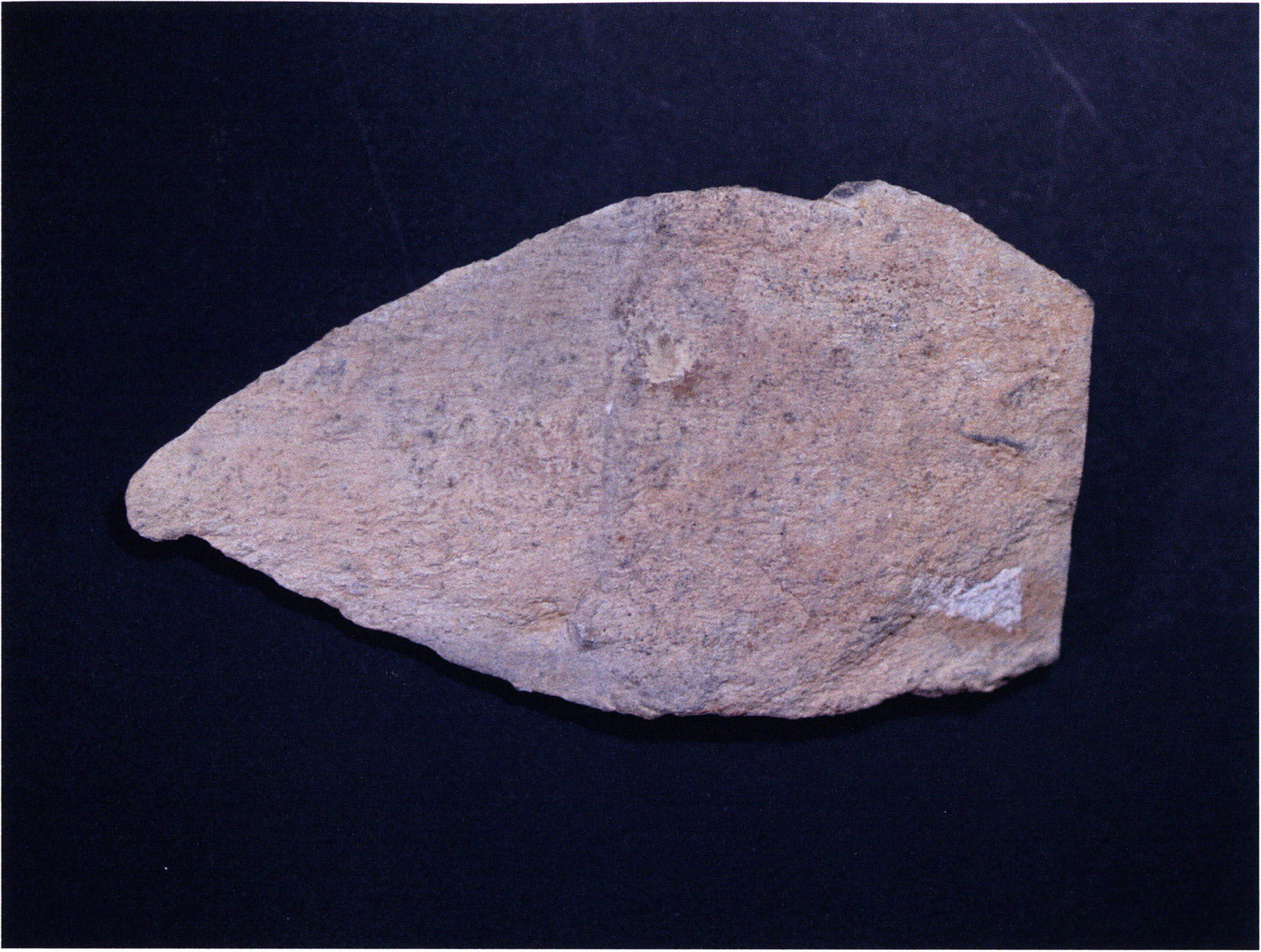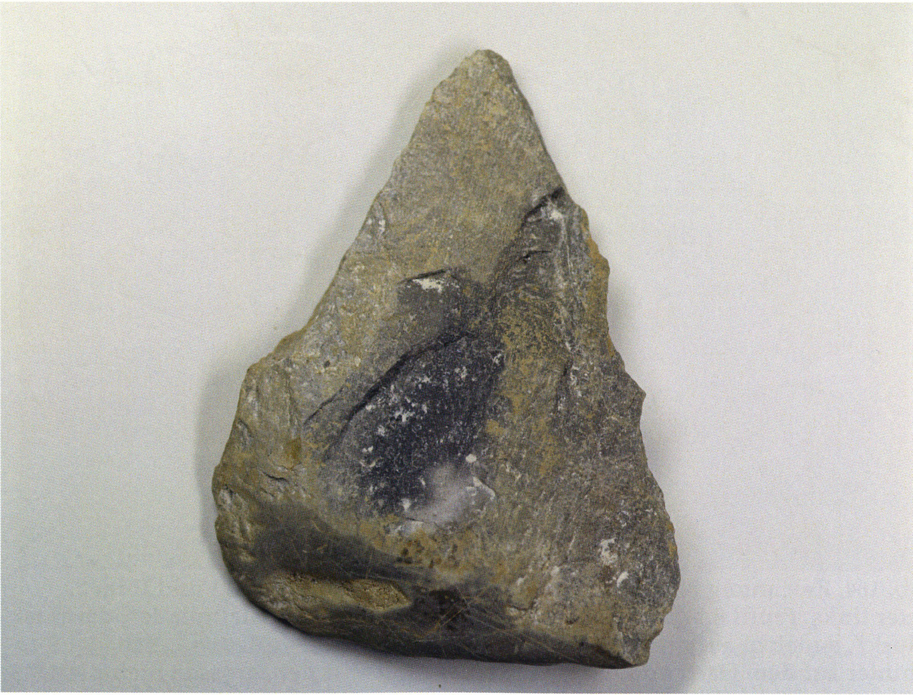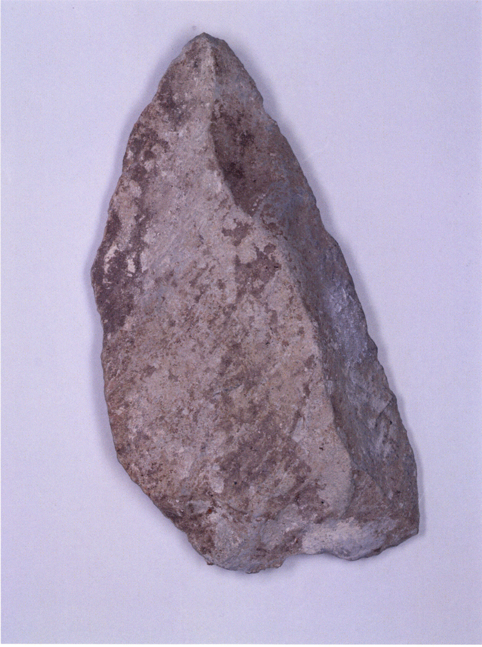 Figs. 165 and 166 a/b, pp. 360 f.: In a drawer of the east wall cabinet in the Drachenloch room of the Kirchhofer house there lie in a wooden cigar box Seewerkalk pieces — among them the artefacts illustrated here — and a slip of paper giving their provenance: "H III section 9, 1st m left, 2nd/3rd layer — suspicious material on stone slab, 23 July 1923." These details accord with RECORD NIGG of 23 July 1923, see p. 356: " In the 2nd and (partly) 3rd layer — m 1 left — I dig down to the slab in section 8 and toward the rear to the face of the slab projecting from the floor" — i.e. into section 9, since the "face" of the second-named slab — resting slightly on the first — lies there. The former slab is the one resting on a block and situated at axis height and in the 1st m left of it in section 8 — projecting still partly into section 9 — cf. sections 8 and 9, Figs. 161 and 168, pp. 357 and 362! — Even though the writer of the slip uses only the phrase "suspicious material" — Nigg's characteristic (over-) cautious formulation of his first impression, which recurs again and again in his records! — the artefact character of both objects illustrated here is beyond question: Fig. 165 — handy, simple chopper with 1 worked cutting edge bearing a slight notch in the middle; Fig. 166 a/b — front and back of a handy, typical Mousterian wedge (of Neanderthal culture) with point, cutting edge, and back! (On the smoothly polished base — Fig. 166 a, lower left, p. 360 — innumerable fine scratch marks running in all directions, which in this conspicuous form can only come from the hand of man!)