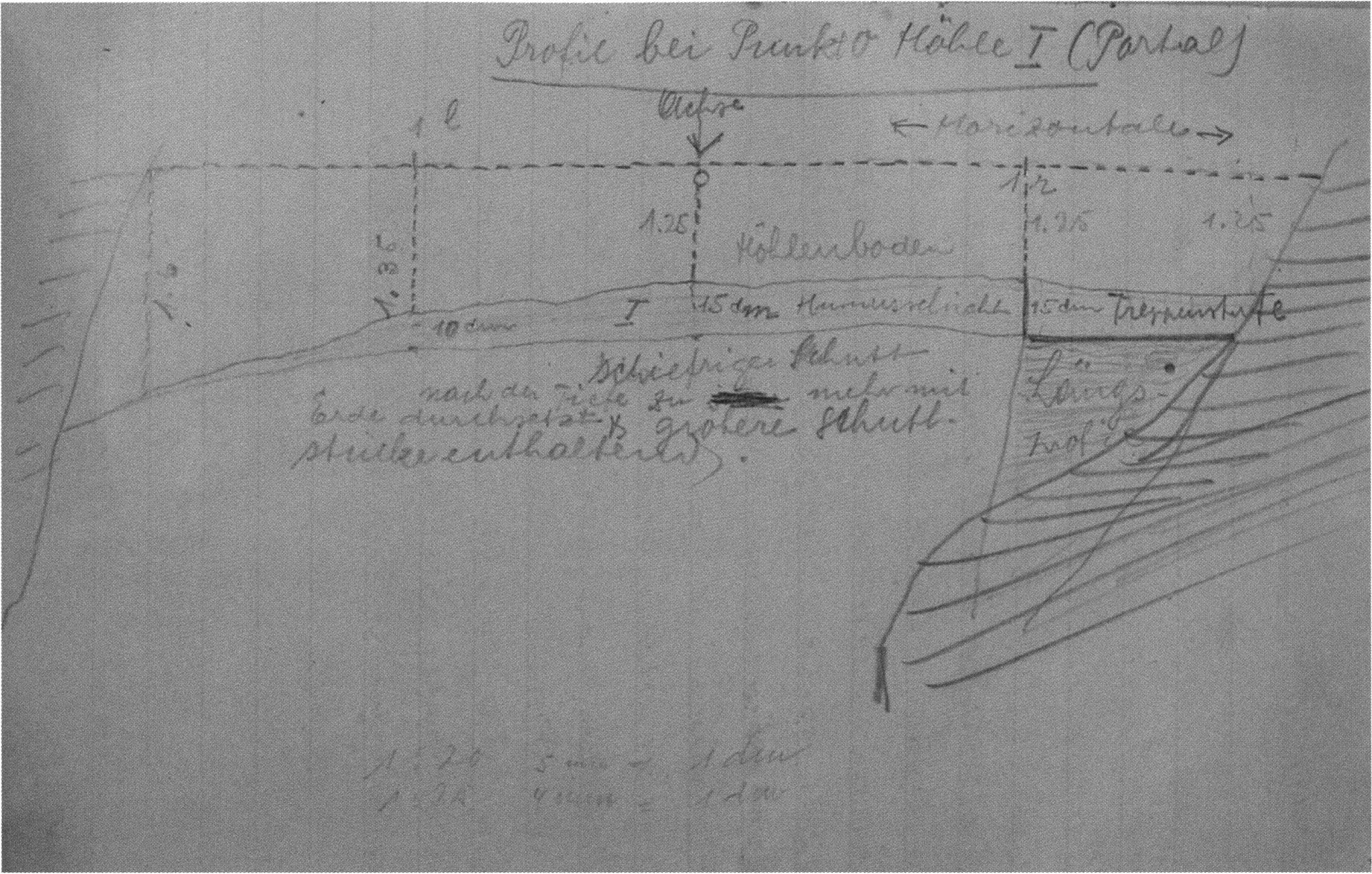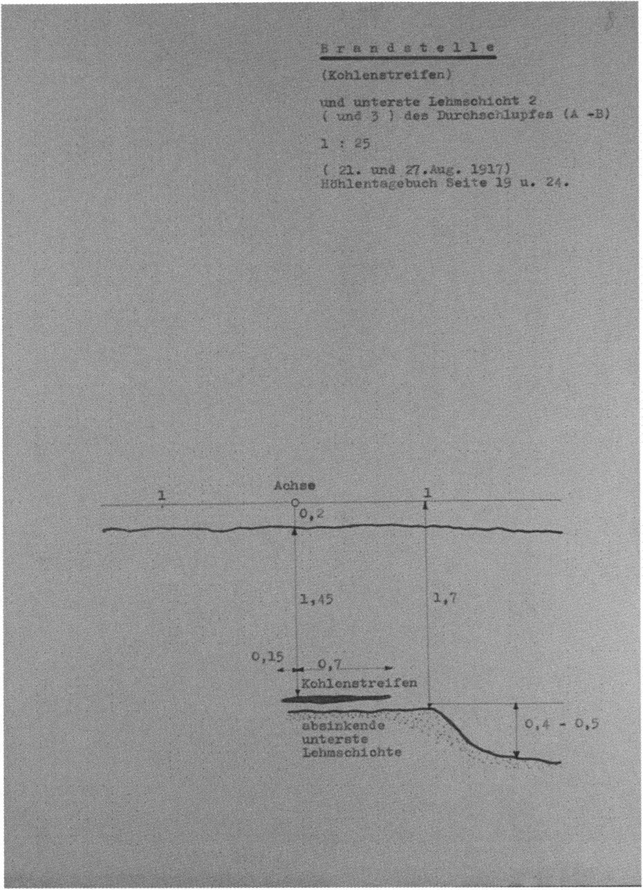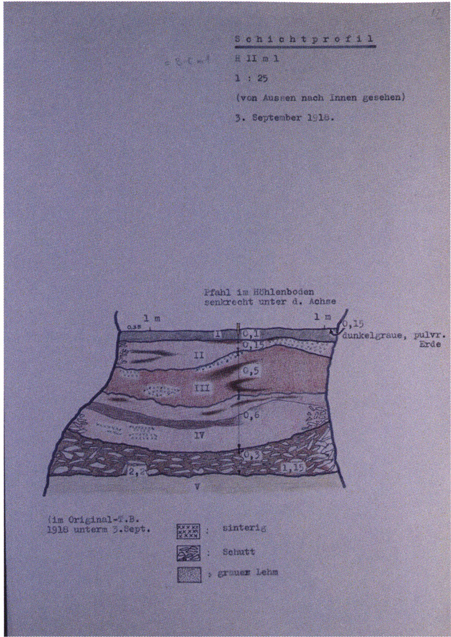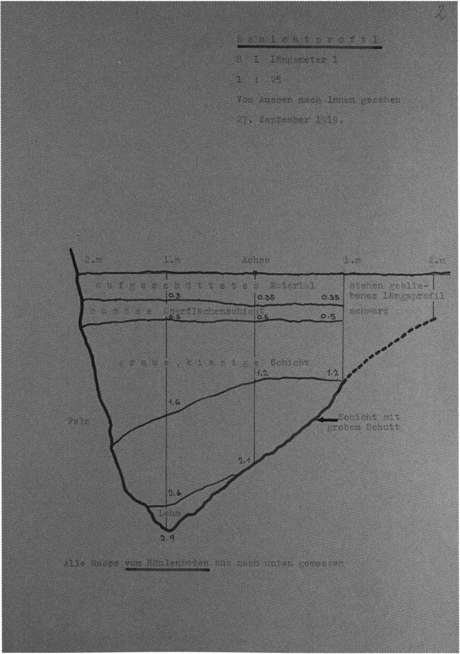 Fig. 145, p. 311: The first cross-section drawing preserved from H III and the second executed in this cave section — carried out on 22 August 1921 by Nigg, D V/6 sketchbook (S) I, p. 2. The section is recorded 2 m inward in H III at the beginning of the third section metre!