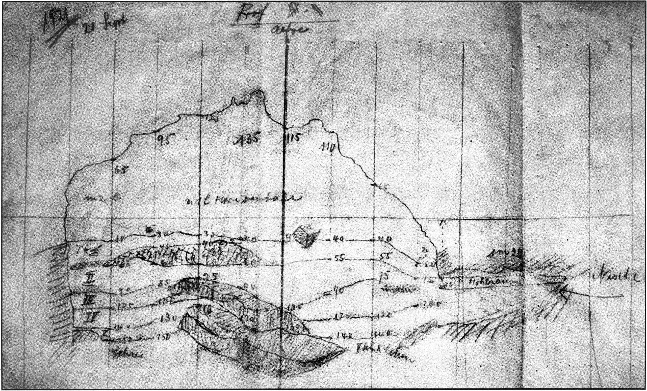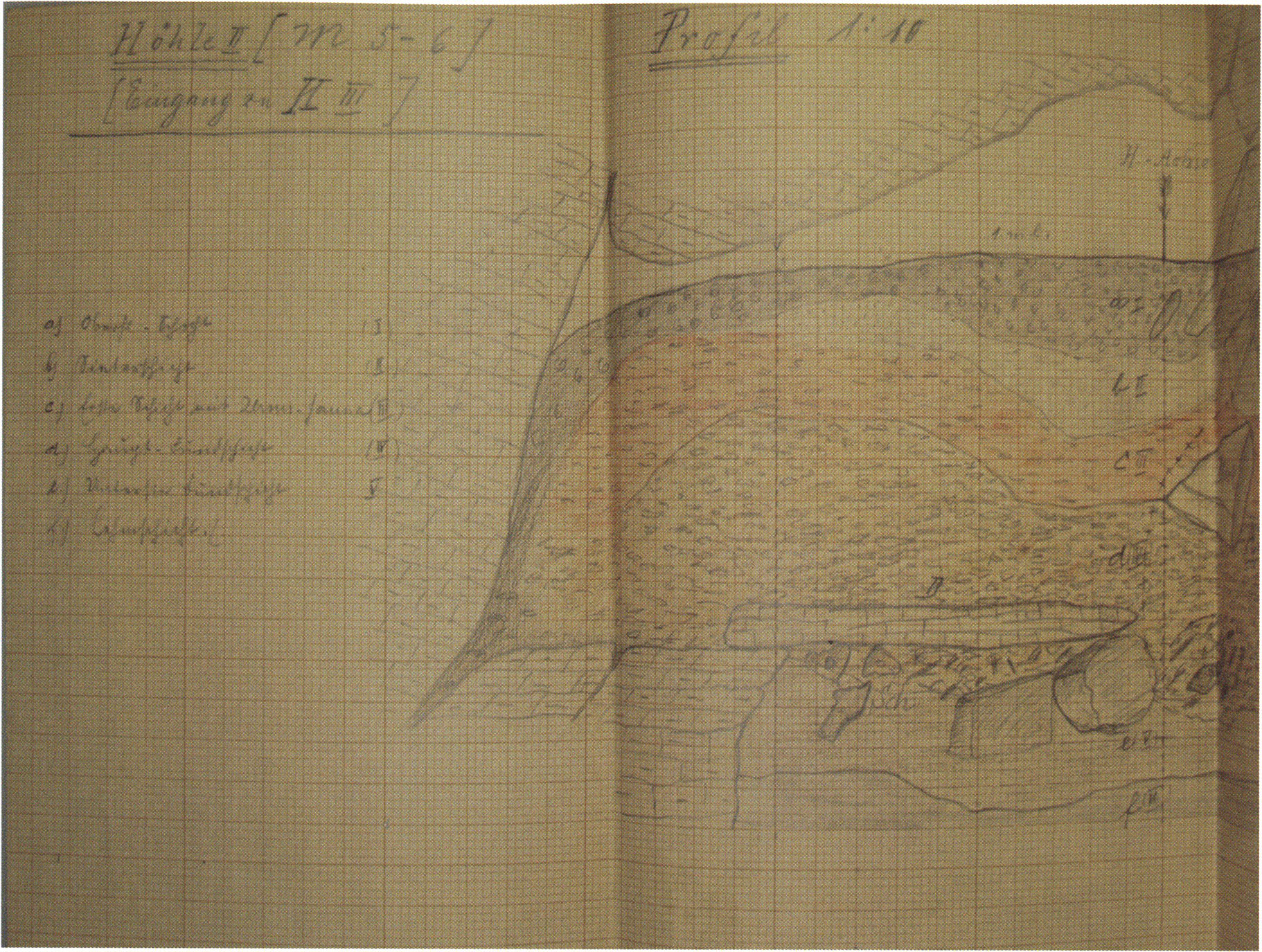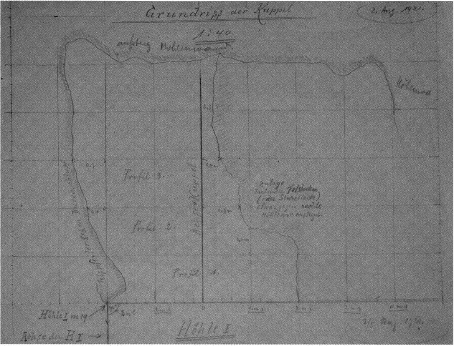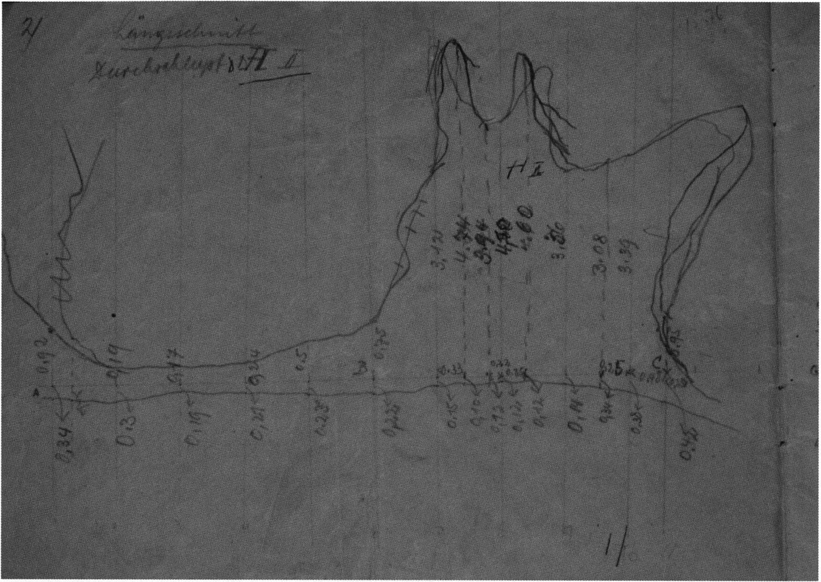 Fig. 145, p. 311: The first cross-section drawing preserved from H III and the second executed in this cave section — carried out on 22 August 1921 by Nigg, D V/6 sketchbook (S) I, p. 2. The section is recorded 2 m inward in H III at the beginning of the third section metre!