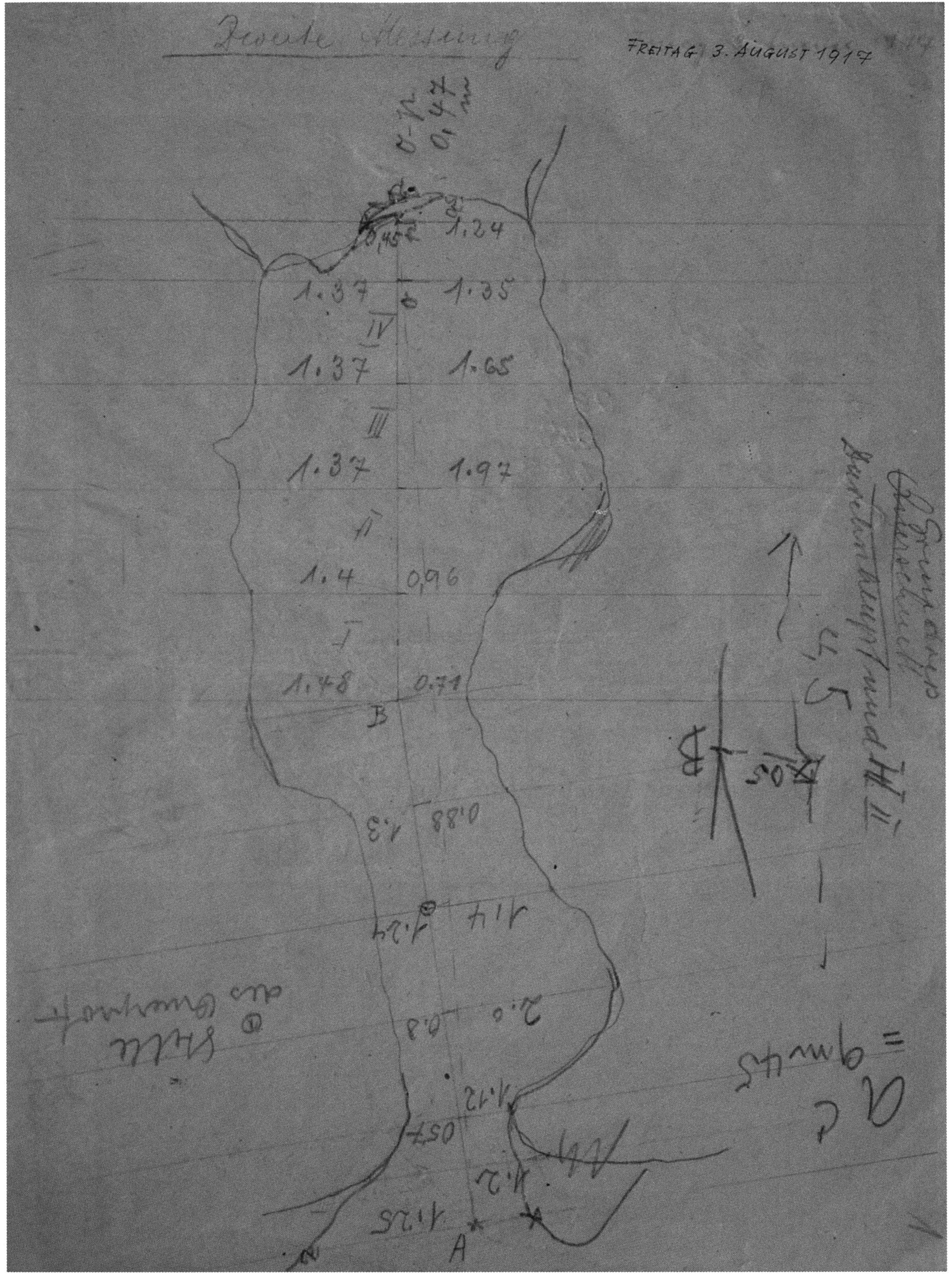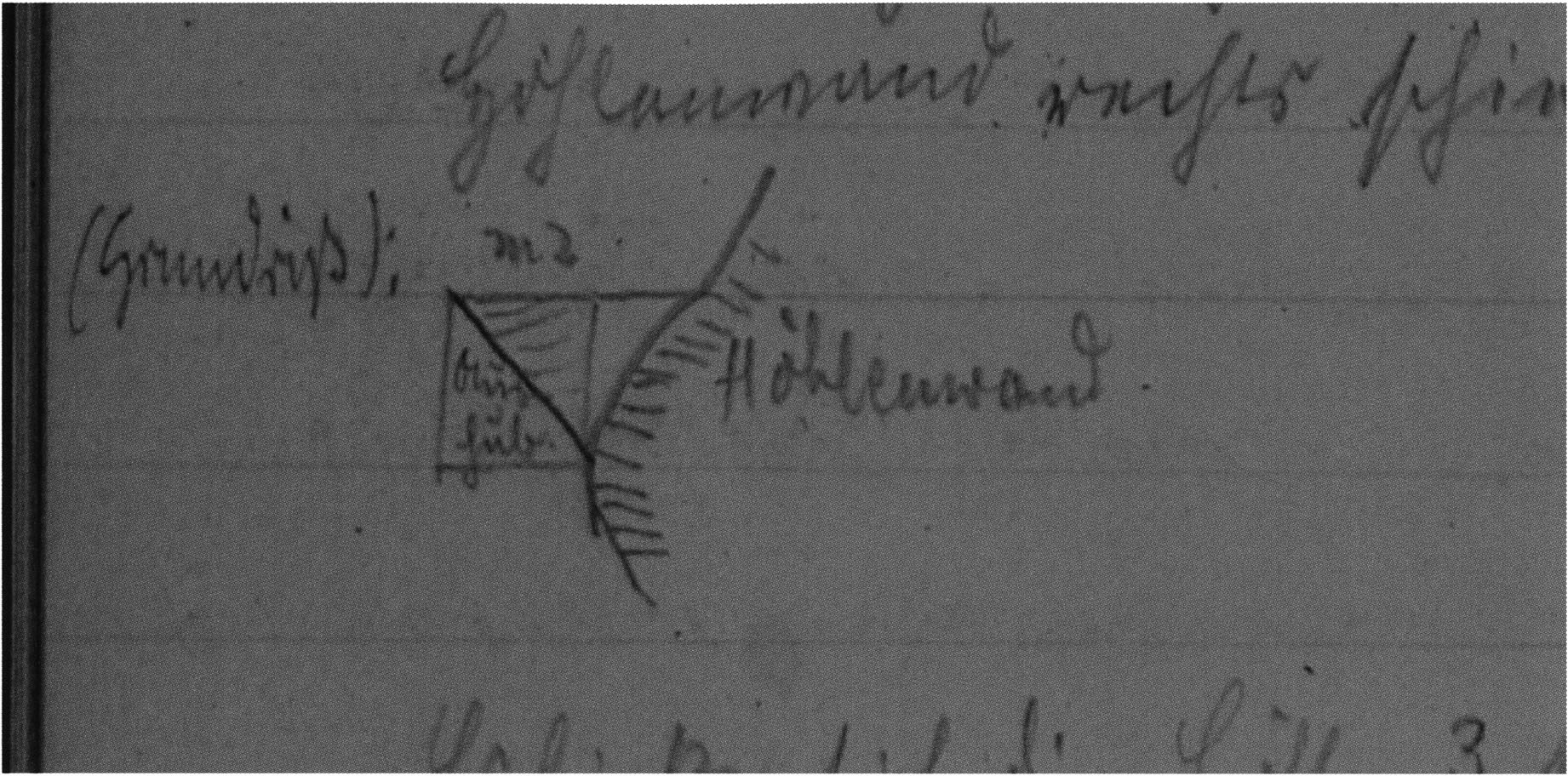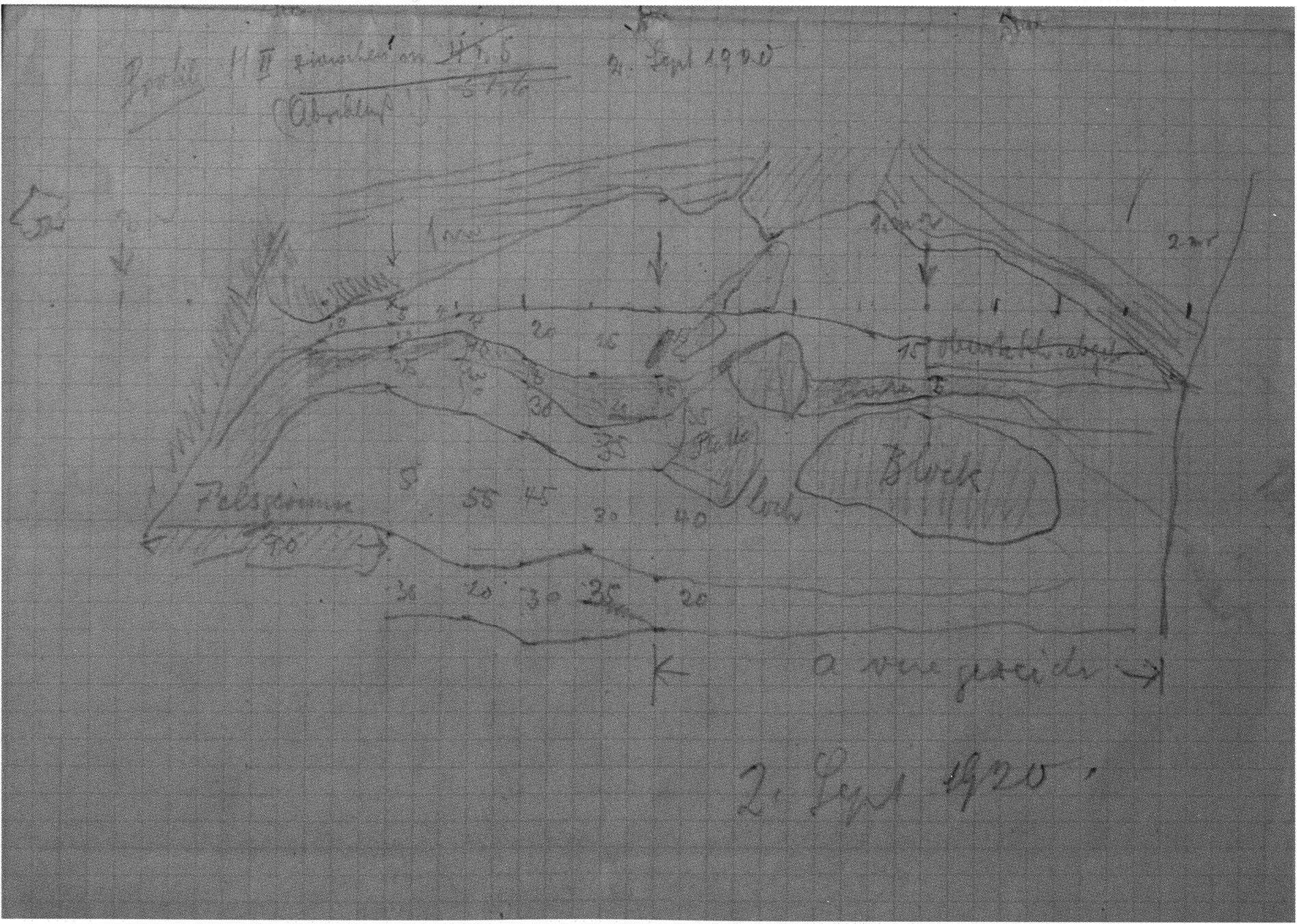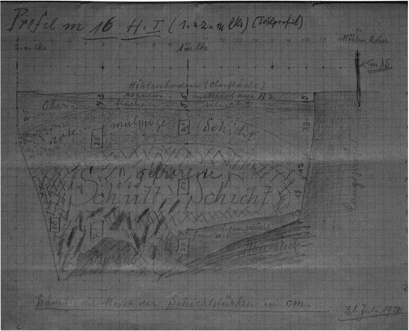 Fig. 145, p. 311: The first cross-section drawing preserved from H III and the second executed in this cave section — carried out on 22 August 1921 by Nigg, D V/6 sketchbook (S) I, p. 2. The section is recorded 2 m inward in H III at the beginning of the third section metre!