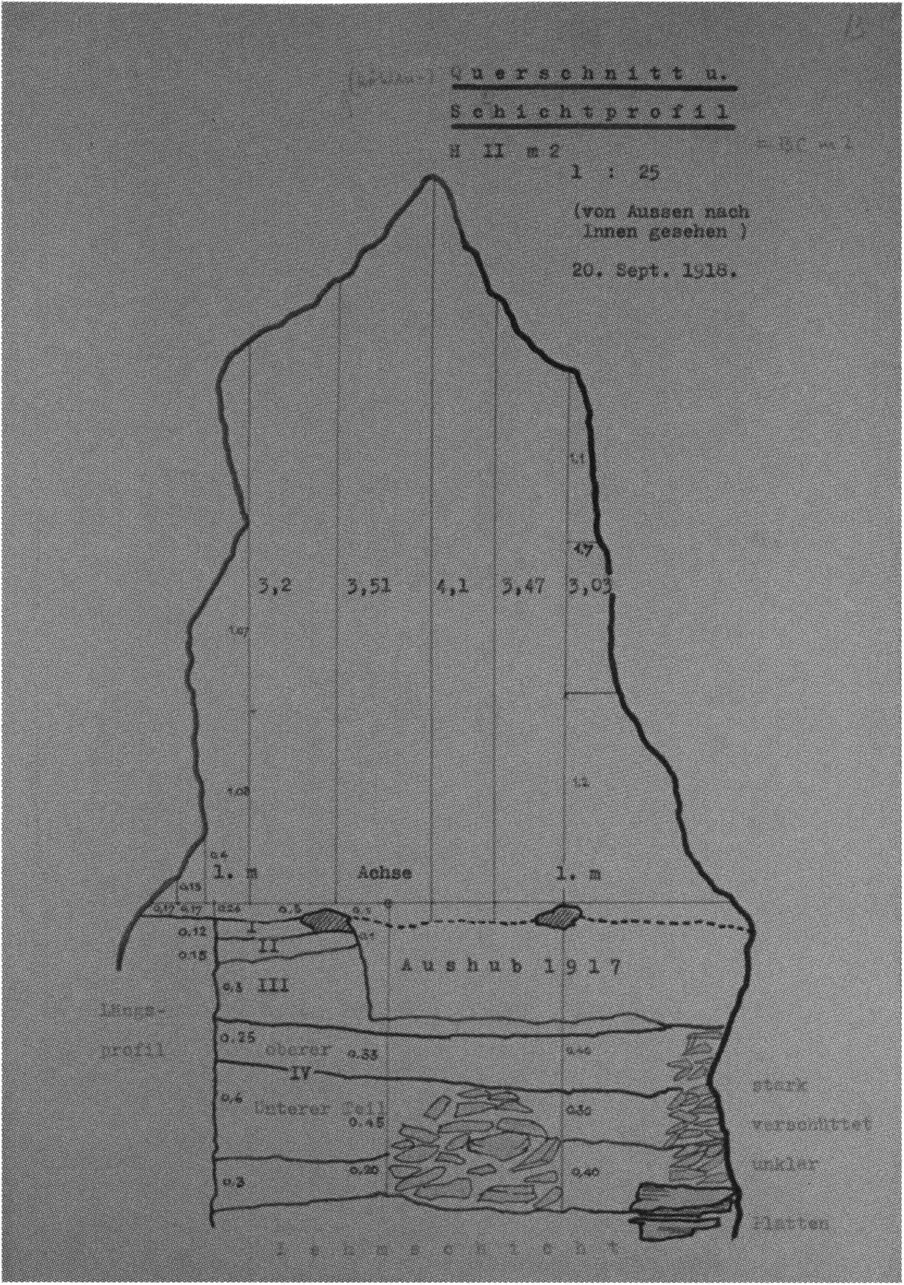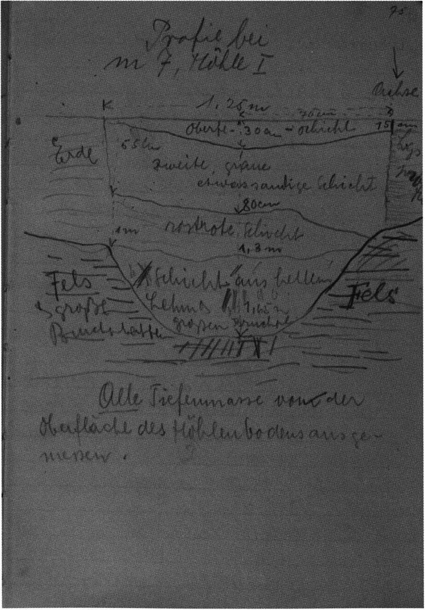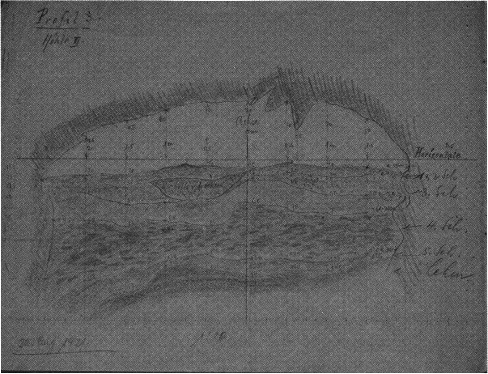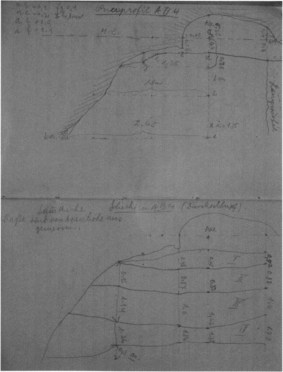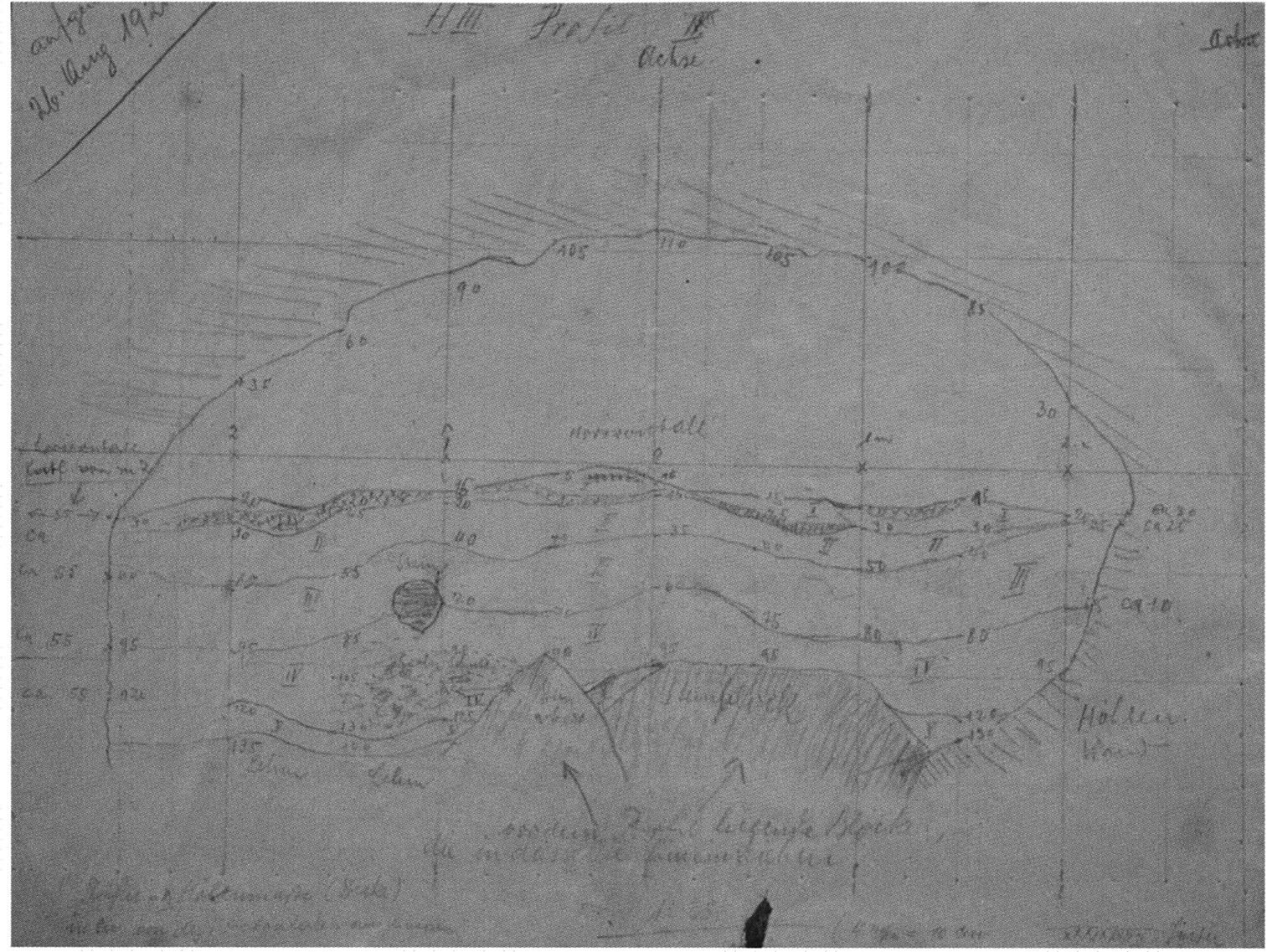 Fig. 149, p. 318: Nigg's cross-section drawing of 26 August 1921 of section 4 at 3 metres in H III — D V/6 sketchbook (S) II, p. 4!