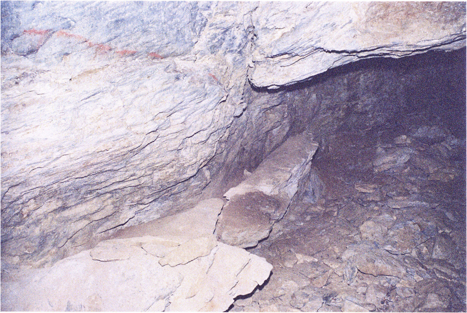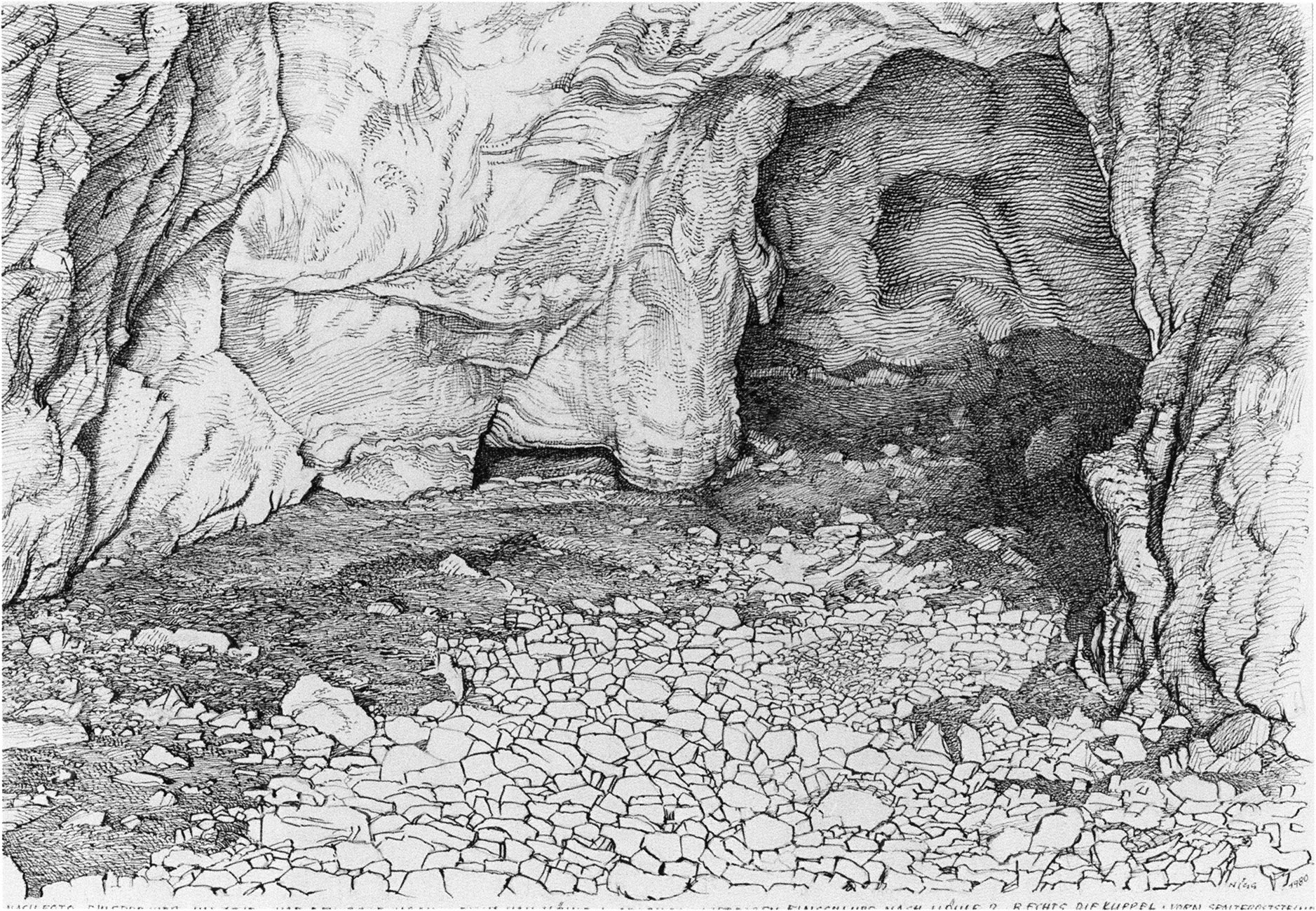 Fig. 151, p. 321: Ceiling and left cave wall of H III; on the floor — increasingly toward the rear — conspicuously many broken slabs. According to Bächler's statement, many of them appeared during the excavation already at the recent surface!