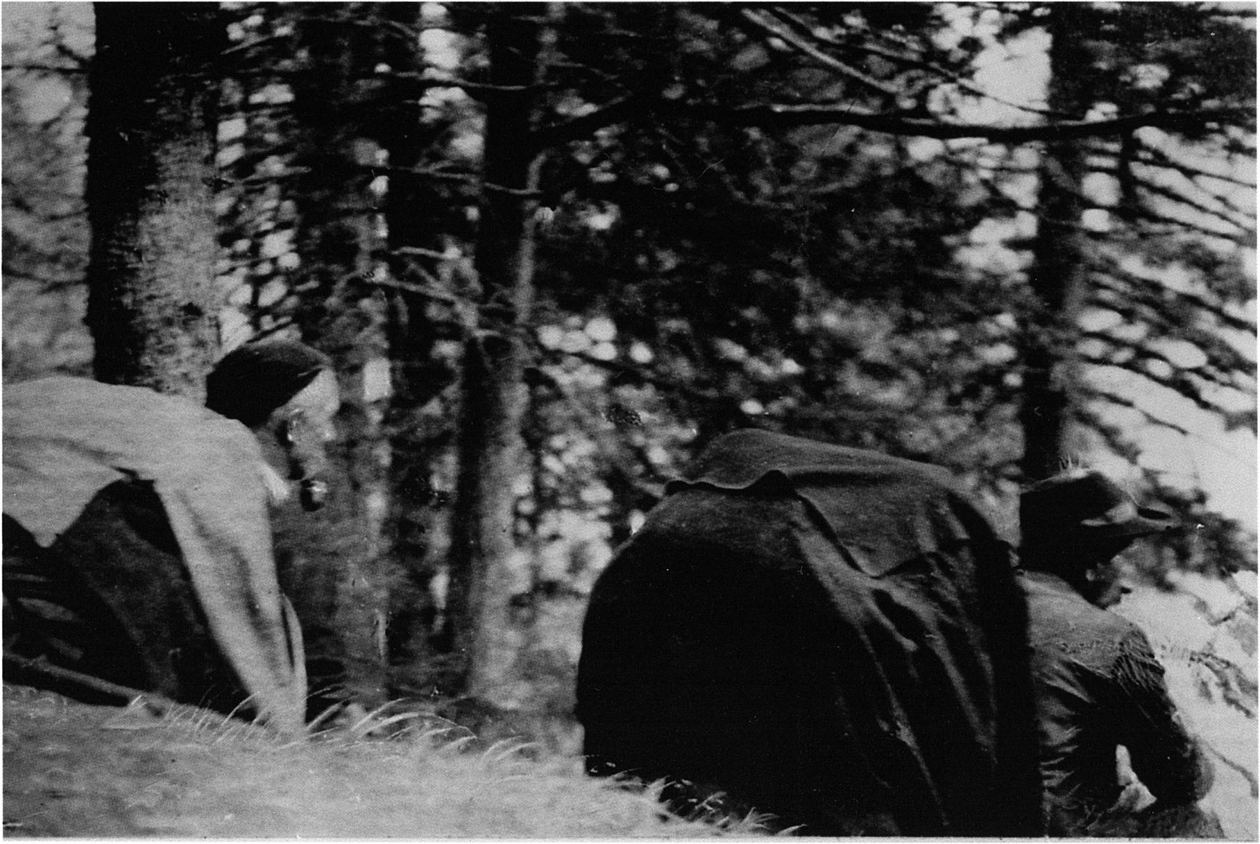 Bemerkenswert ist, dass die Ewenken früher ihre eigenen Verstorbenen in derselben Weise wie die getöteten Bären bestatteten. Der Bär gilt und galt seit jeher bei allen Bärenjagdvölkern Nordeurasiens und Nordamerikas als Urahne und Urverwandter des Menschen. Es sprechen keine Gründe dagegen, dass dies ältesten Traditionen und Vorstellungen entspricht und seine Wurzeln im frühsten und urtümlichsten Bärenjägertum hat, d. h. bereits in jenem des Neandertalers im Drachenloch und anderswo. Derselbe hat hier rund um den gedeckten Feuerherd Knochen des Höhlenbären in ähnlicher Weise rituell in Gruben “entsorgt”, wie er es an anderer Stelle, etwa in der kleinen Höhle von La Chapelle-aux-Saints – s. Abb. 10, S. 20 - mit seinen Verstorbenen zu tun pflegte. Man findet in Europa an Orten mit Spuren des Neandertalers keinerlei Belege, dass den Knochen irgendeines anderen Jagdtieres als des (Höhlen)bären in selben Ausmasse rituelle “Entsorgungen” gleich denen der eigenen Verstorbenen zuteil geworden wären. - Eugène Bonifay, der Ausgräber von Regourdou, konnte eine eigentliche Doppelbestattung eines Neandertaler-Menschen neben einem Braunbären nachweisen - s. Abb. 11, S. 21. In Regourdou scheinen auch Teile eines anderen Jagdtieres, des Hirsches , u. z. Schädel und Geweihstange, rituell “entsorgt” worden zu sein. Allerdings nimmt der weitaus grössten Teil und der rituell “entsorgten” Knochen der Braunbär ein. Die Befunde im Drachenloch und im 1000 km entfernten Regourdou legen die Vermutung nahe, dass der Bär im Kosmos des Neandertaler-Menschen im Vergleich zu anderen Jagdtieren eine besondere, u. z. verwandtschaftliche Stellung eingenommen und die “Entsorgung seiner Knochen” deshalb eine besondere Bedeutung für ihn hatte.