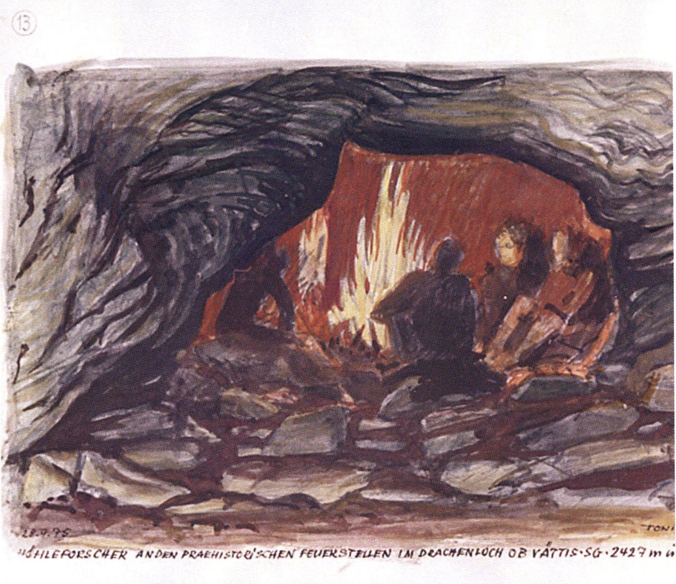 Dabei hatte Bächler selbst während seinen sporadischen Besuchen der Ausgrabungen Hund angelegt und täglich seine Beobachtungen an Ort und Stelle oder spätestens abends in der Gelbberghütte rund 500 m unterhalb des Drachenloch präzisest protokolliert und skizziert. Sämtliche seiner Erstaufzeichnungen wie auch die Protokolle des Ausgräbers Theophil Nigg insgesamt sind vertrauenswürdig und für die Forschung noch heute von gültigem Wert !