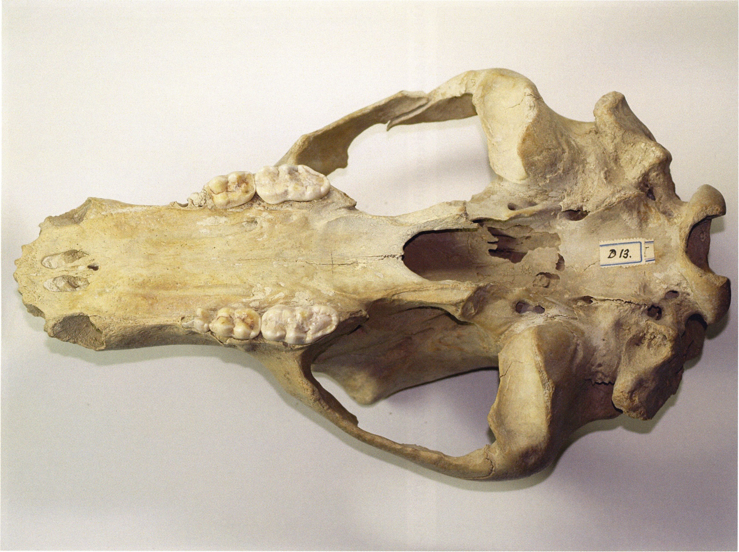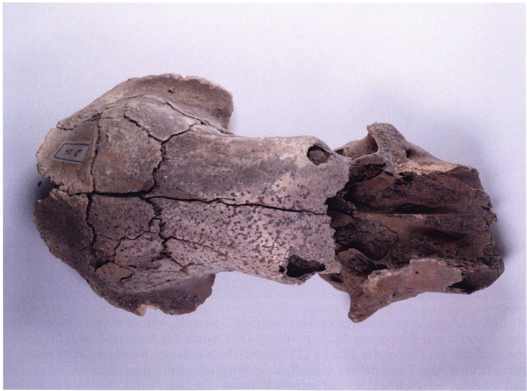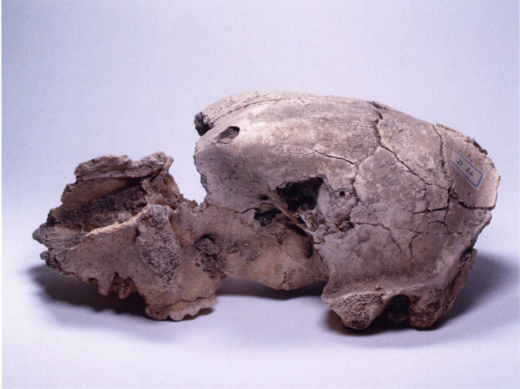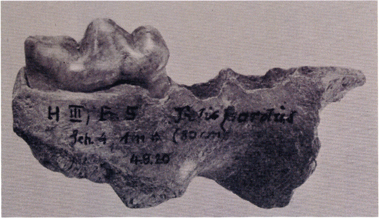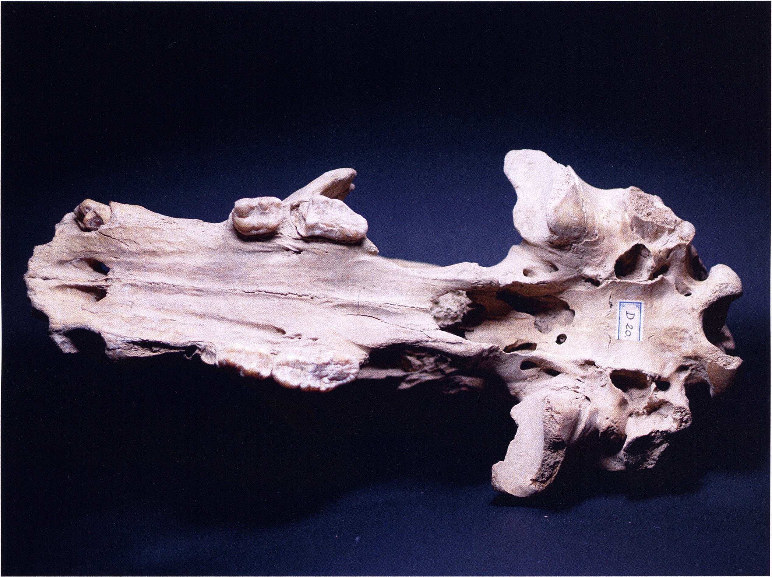 "D 20" shows large openings in the temple region on both sides throughout, and above them on the right side of the skull roof a smaller hole of approximately 3 cm in diameter; the zygomatic arches are absent; otherwise "D 20" is somewhat more complete than "D 17" — the upper jaw has, alongside 4½ molars, the left canine — though peculiarly mutilated — and bears the same traces of human activity as "D 17"! — Profile length: 380 mm.