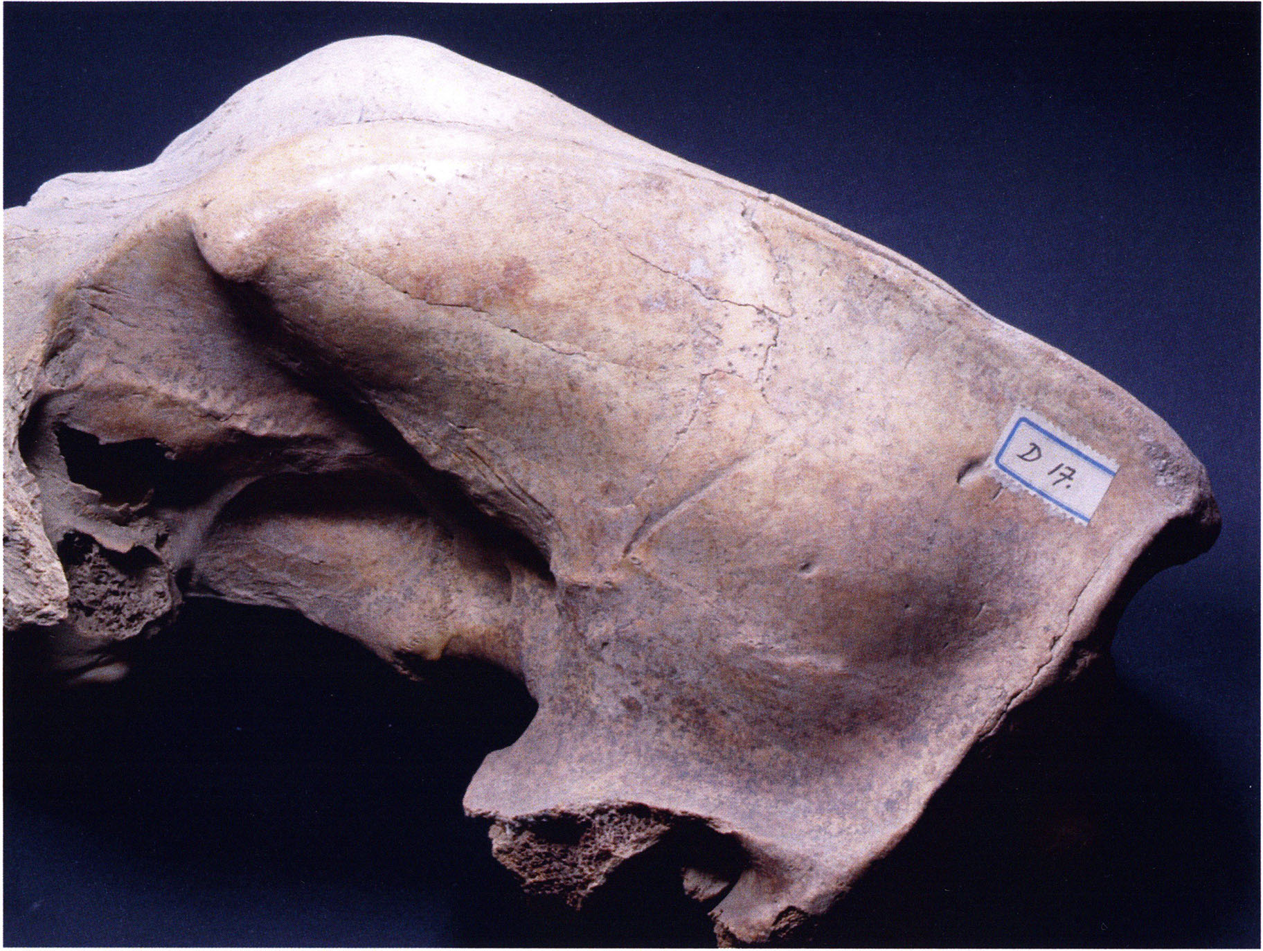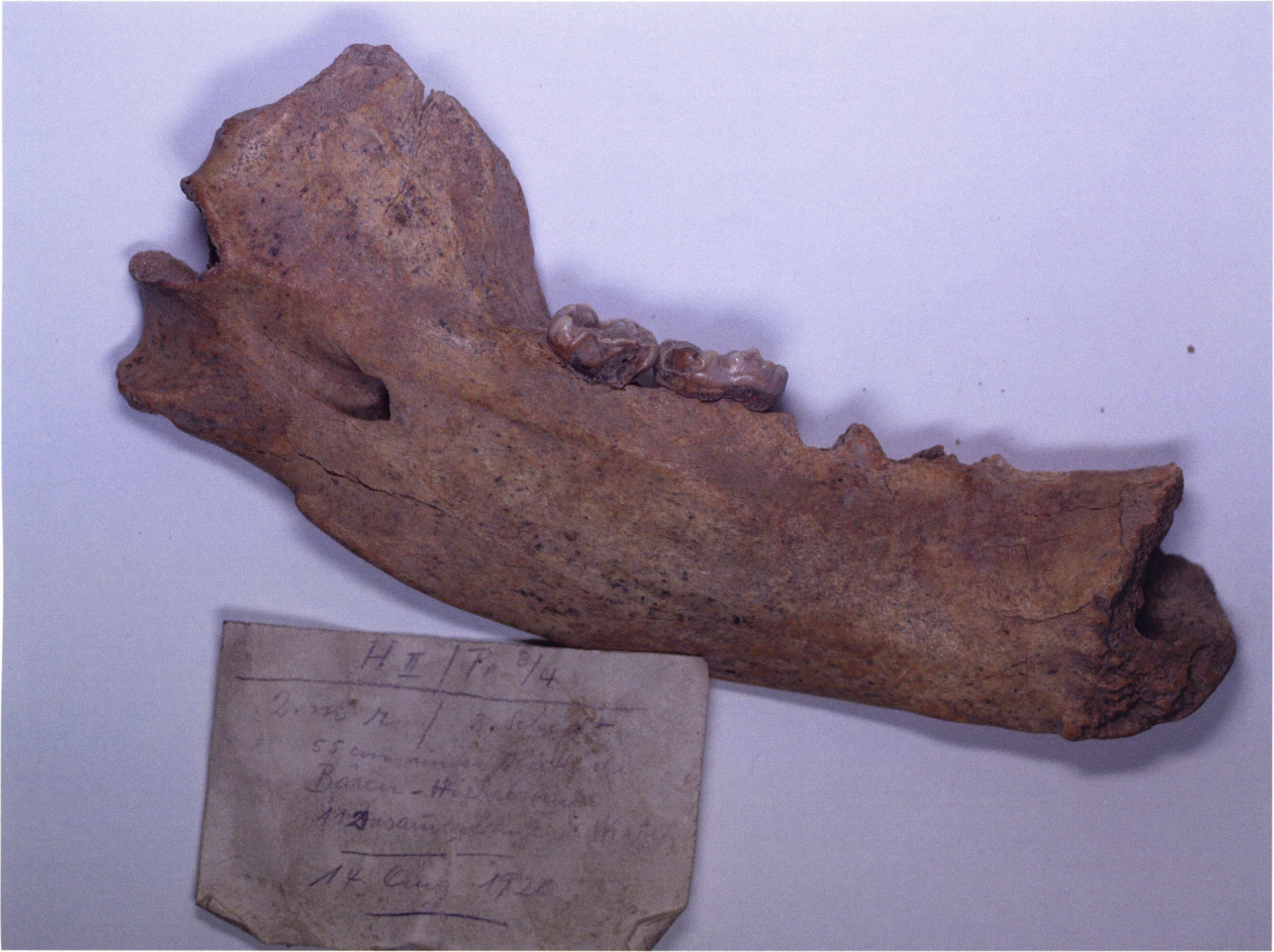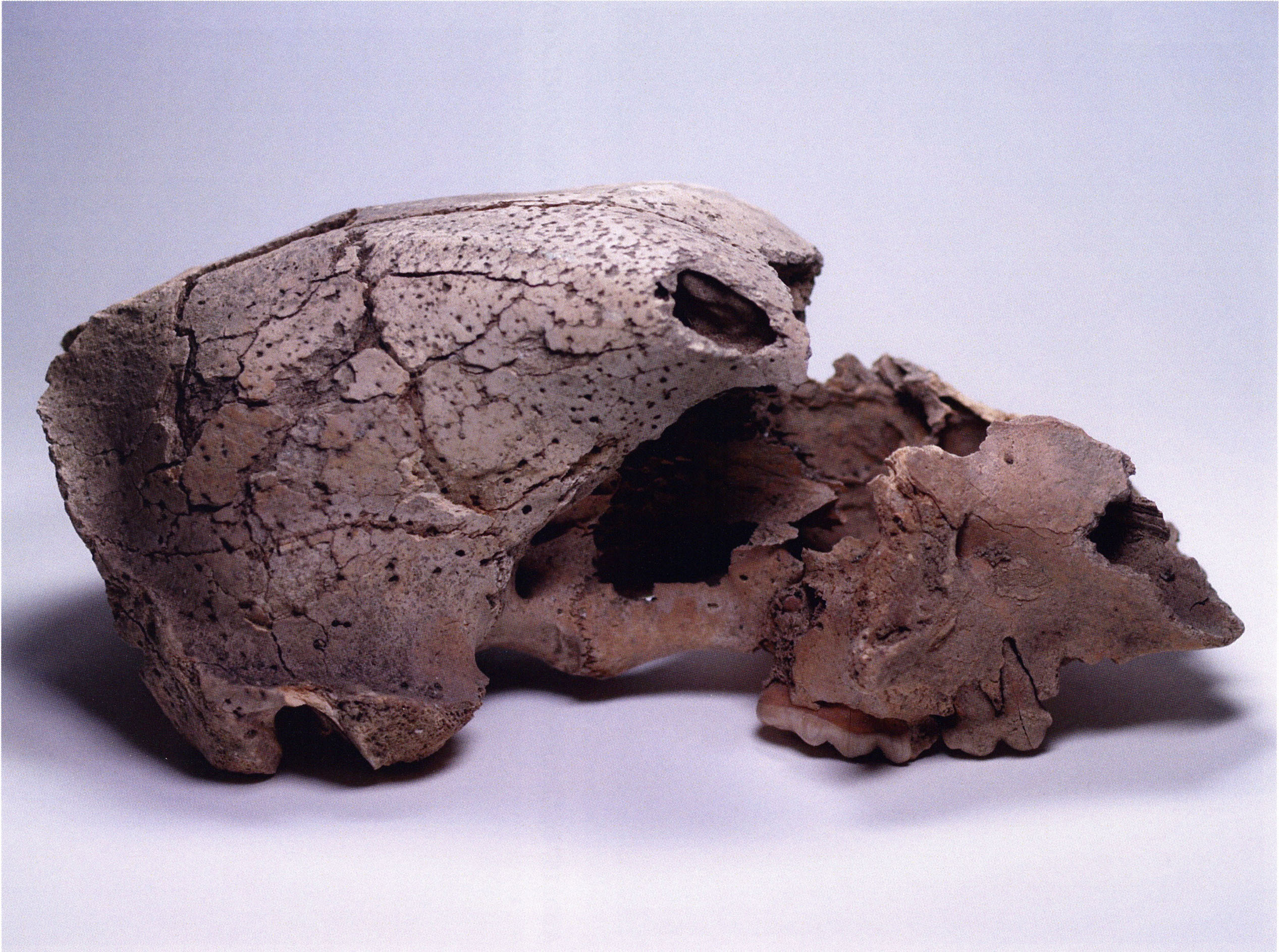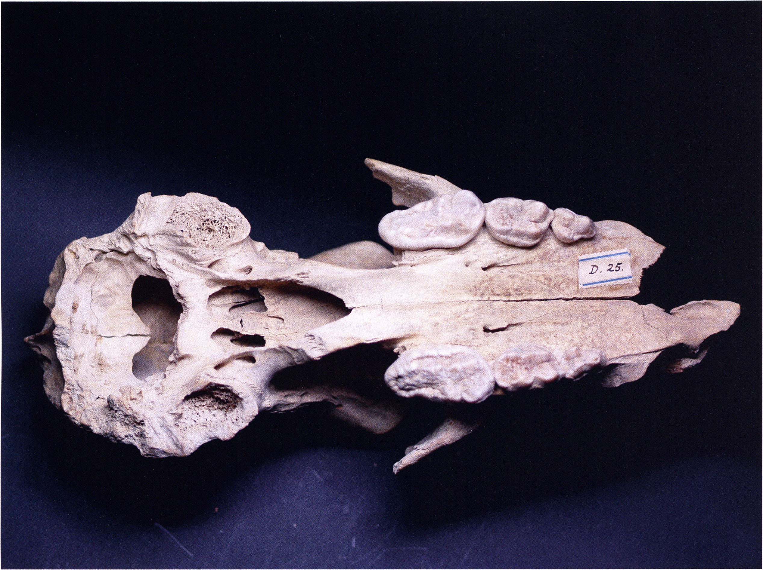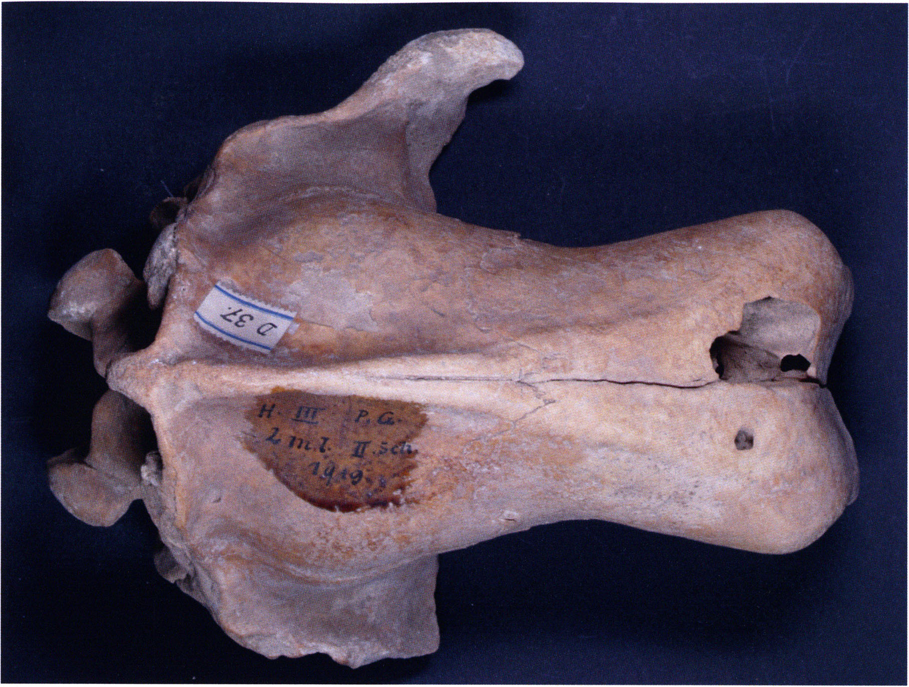 "D 20" shows large openings in the temple region on both sides throughout, and above them on the right side of the skull roof a smaller hole of approximately 3 cm in diameter; the zygomatic arches are absent; otherwise "D 20" is somewhat more complete than "D 17" — the upper jaw has, alongside 4½ molars, the left canine — though peculiarly mutilated — and bears the same traces of human activity as "D 17"! — Profile length: 380 mm.