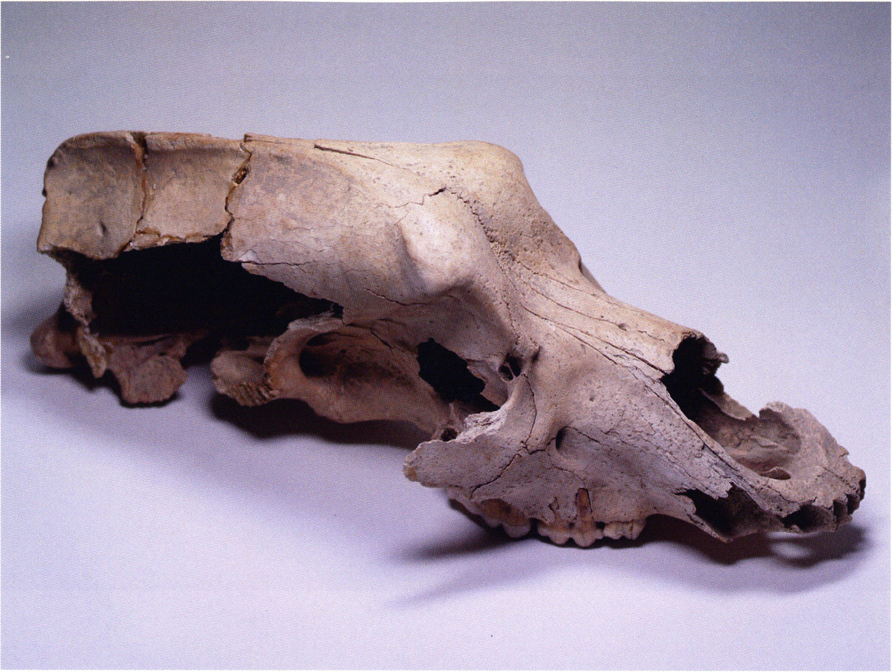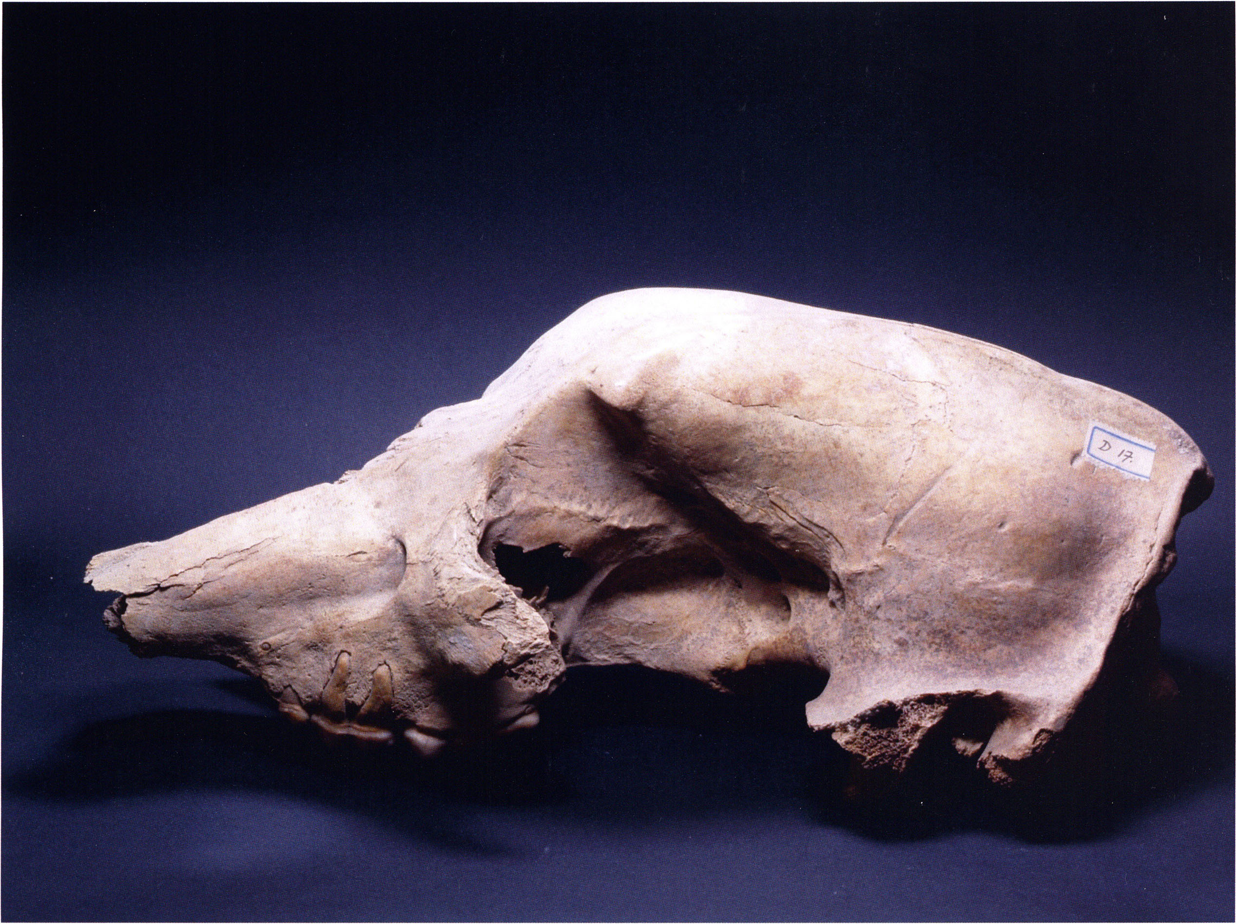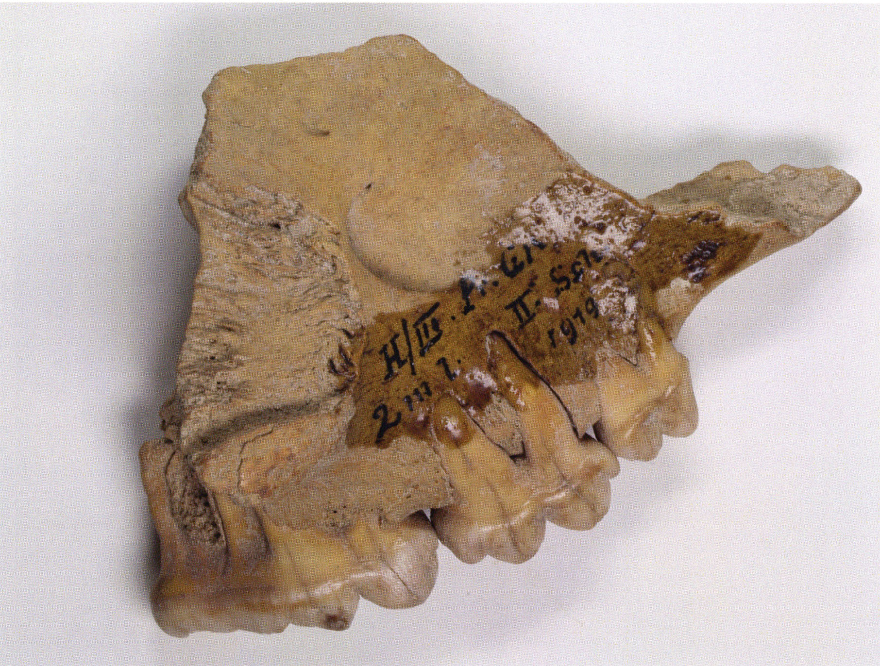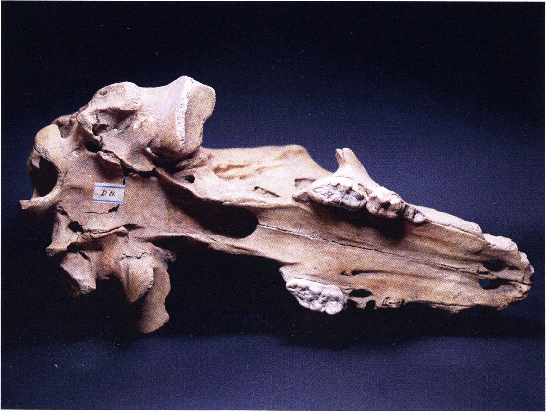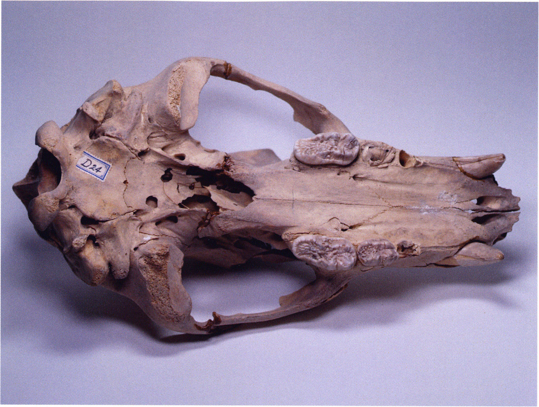 "D 20" shows large openings in the temple region on both sides throughout, and above them on the right side of the skull roof a smaller hole of approximately 3 cm in diameter; the zygomatic arches are absent; otherwise "D 20" is somewhat more complete than "D 17" — the upper jaw has, alongside 4½ molars, the left canine — though peculiarly mutilated — and bears the same traces of human activity as "D 17"! — Profile length: 380 mm.