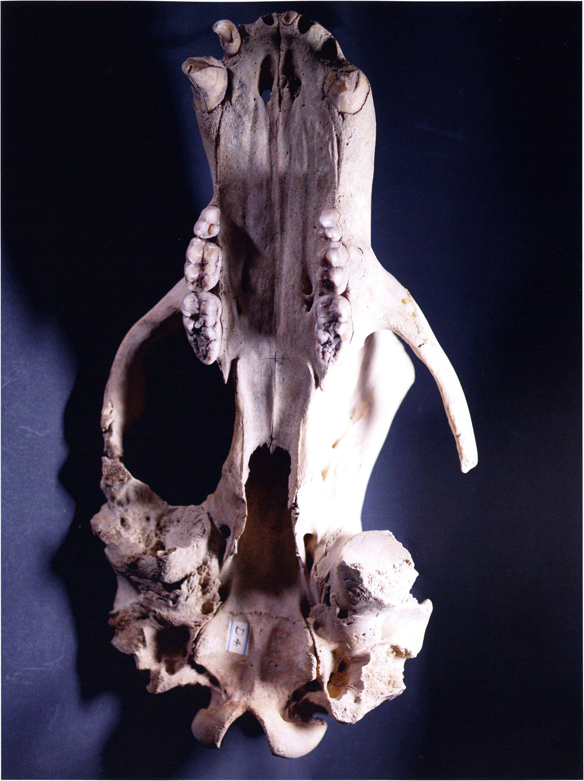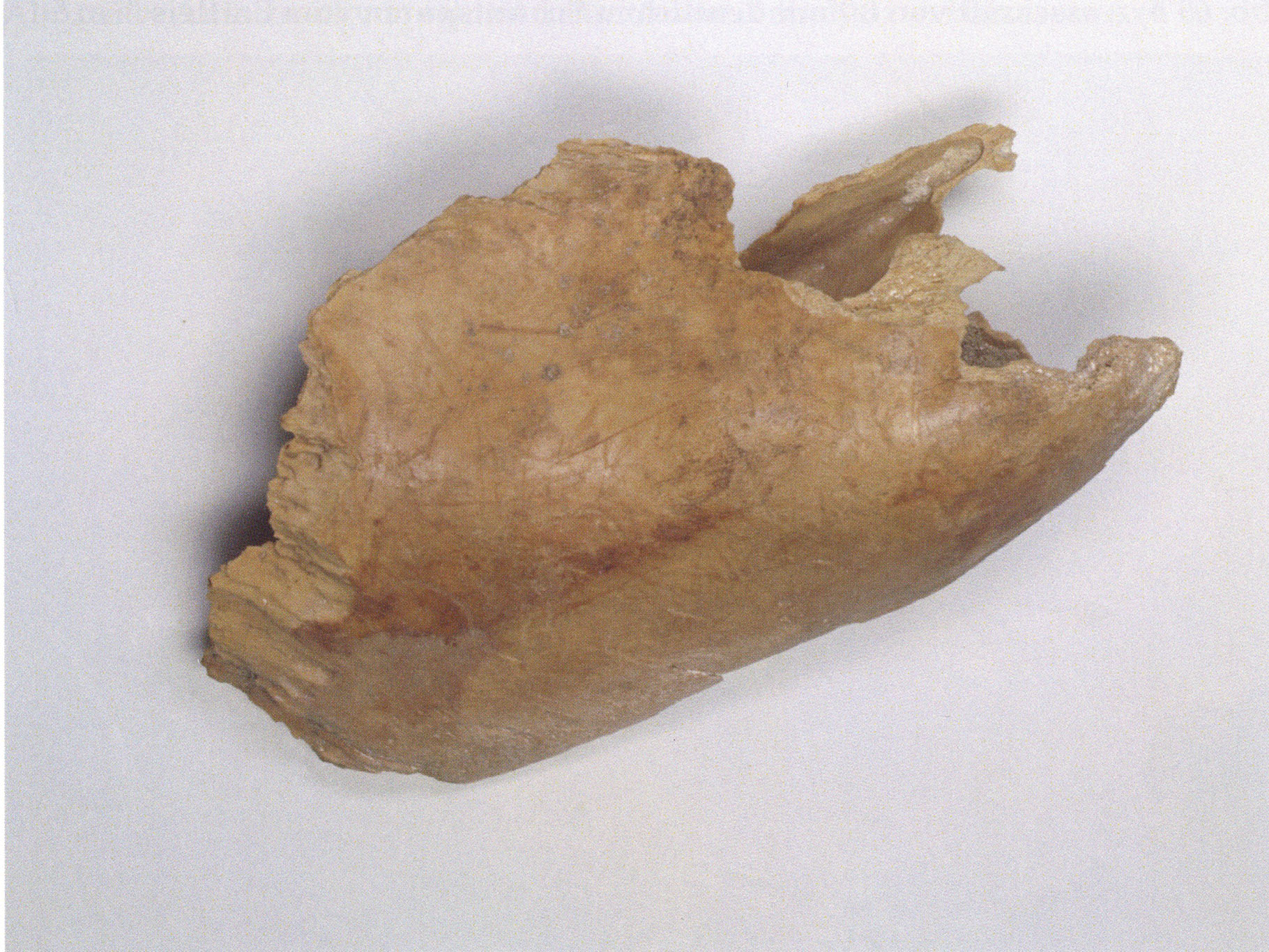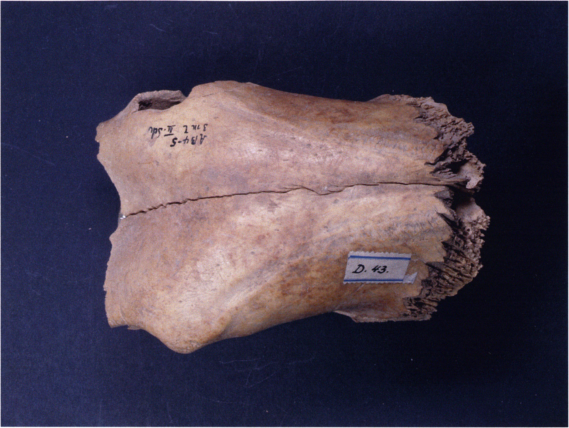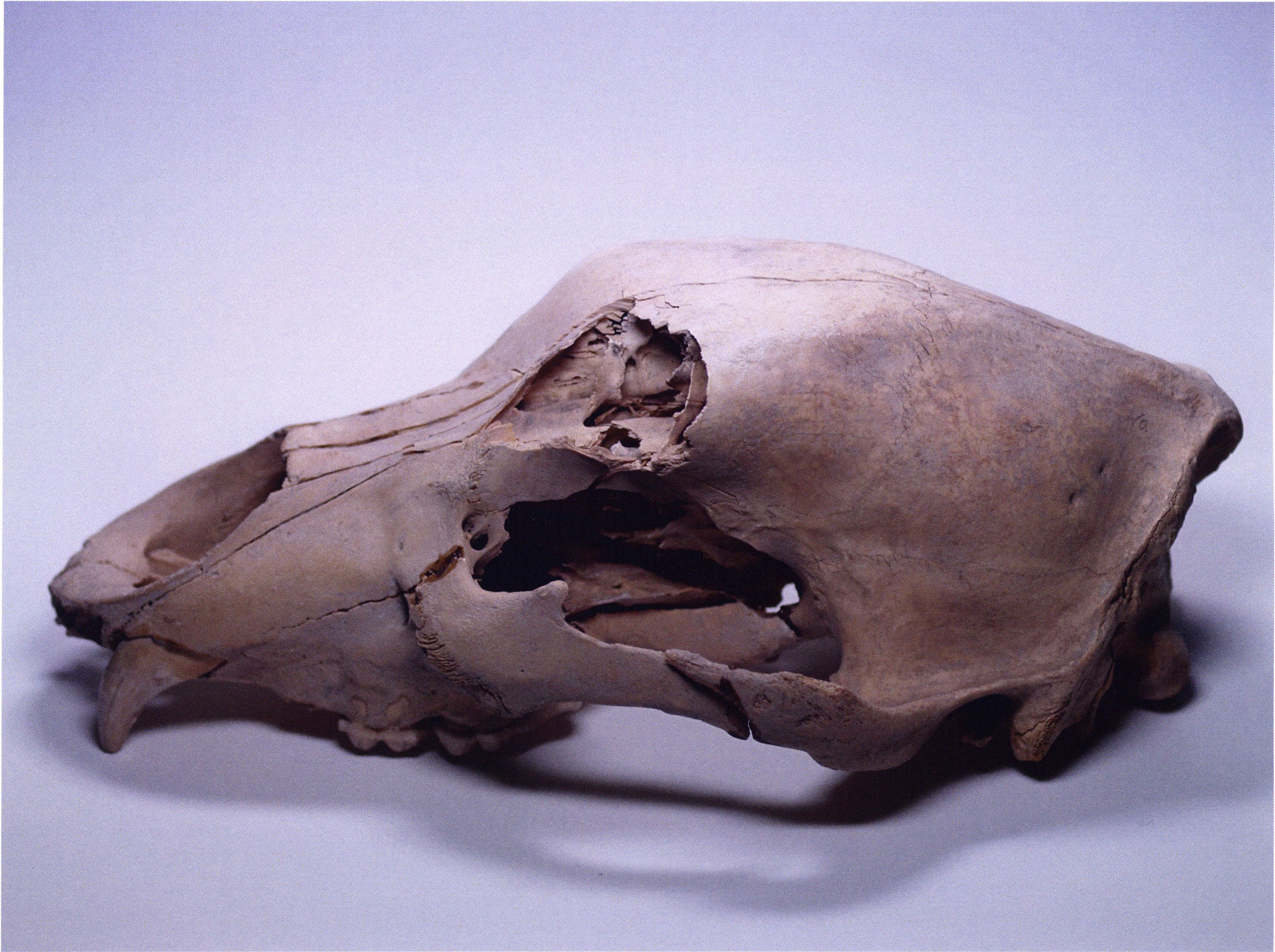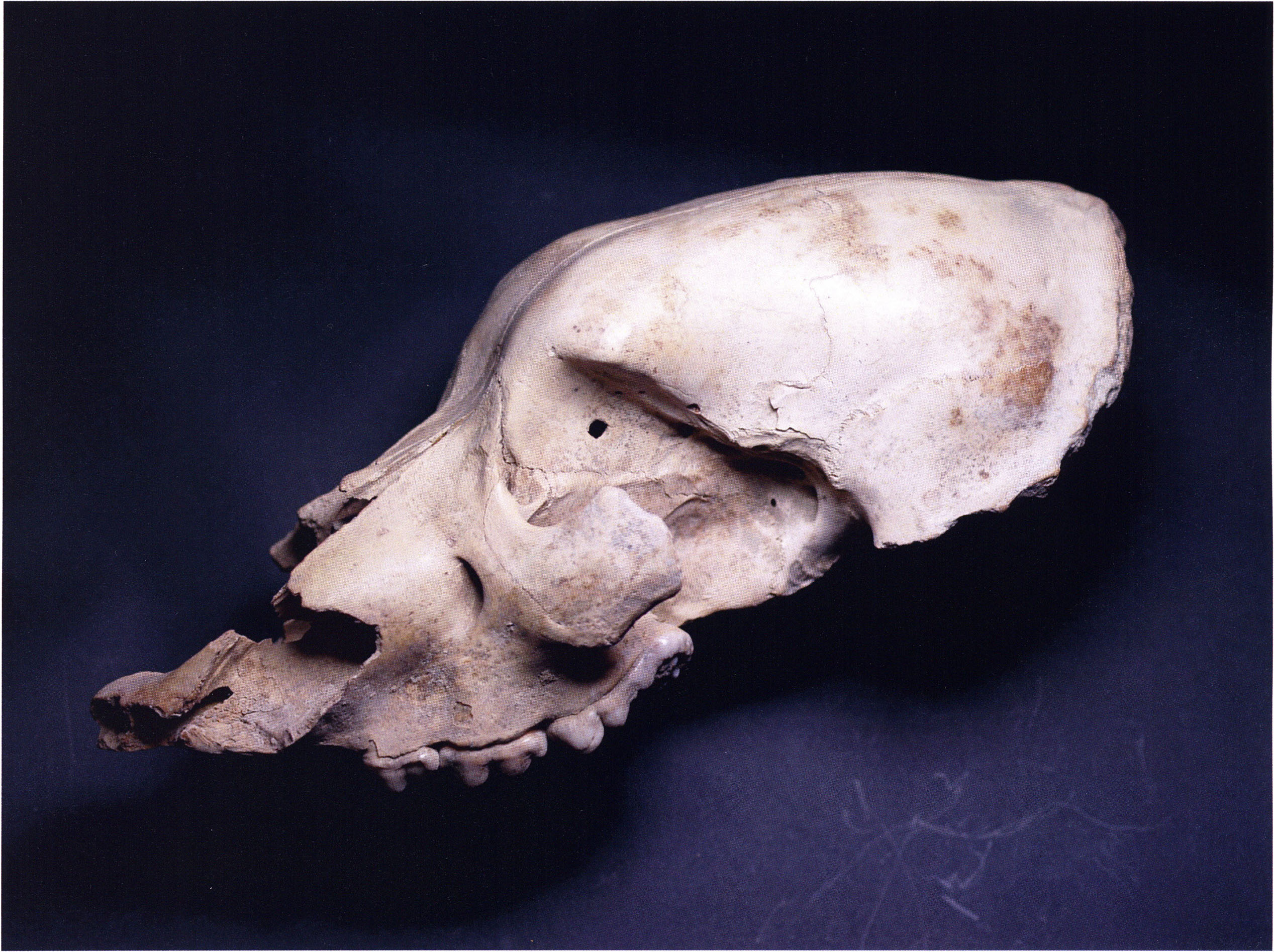 "D 20" shows large openings in the temple region on both sides throughout, and above them on the right side of the skull roof a smaller hole of approximately 3 cm in diameter; the zygomatic arches are absent; otherwise "D 20" is somewhat more complete than "D 17" — the upper jaw has, alongside 4½ molars, the left canine — though peculiarly mutilated — and bears the same traces of human activity as "D 17"! — Profile length: 380 mm.