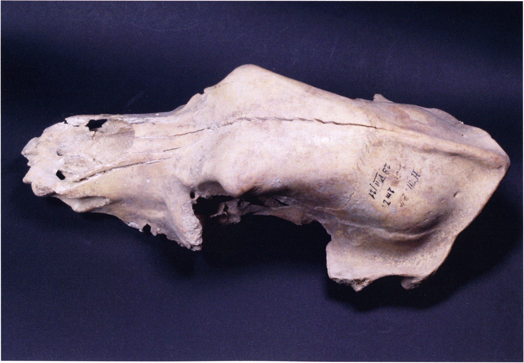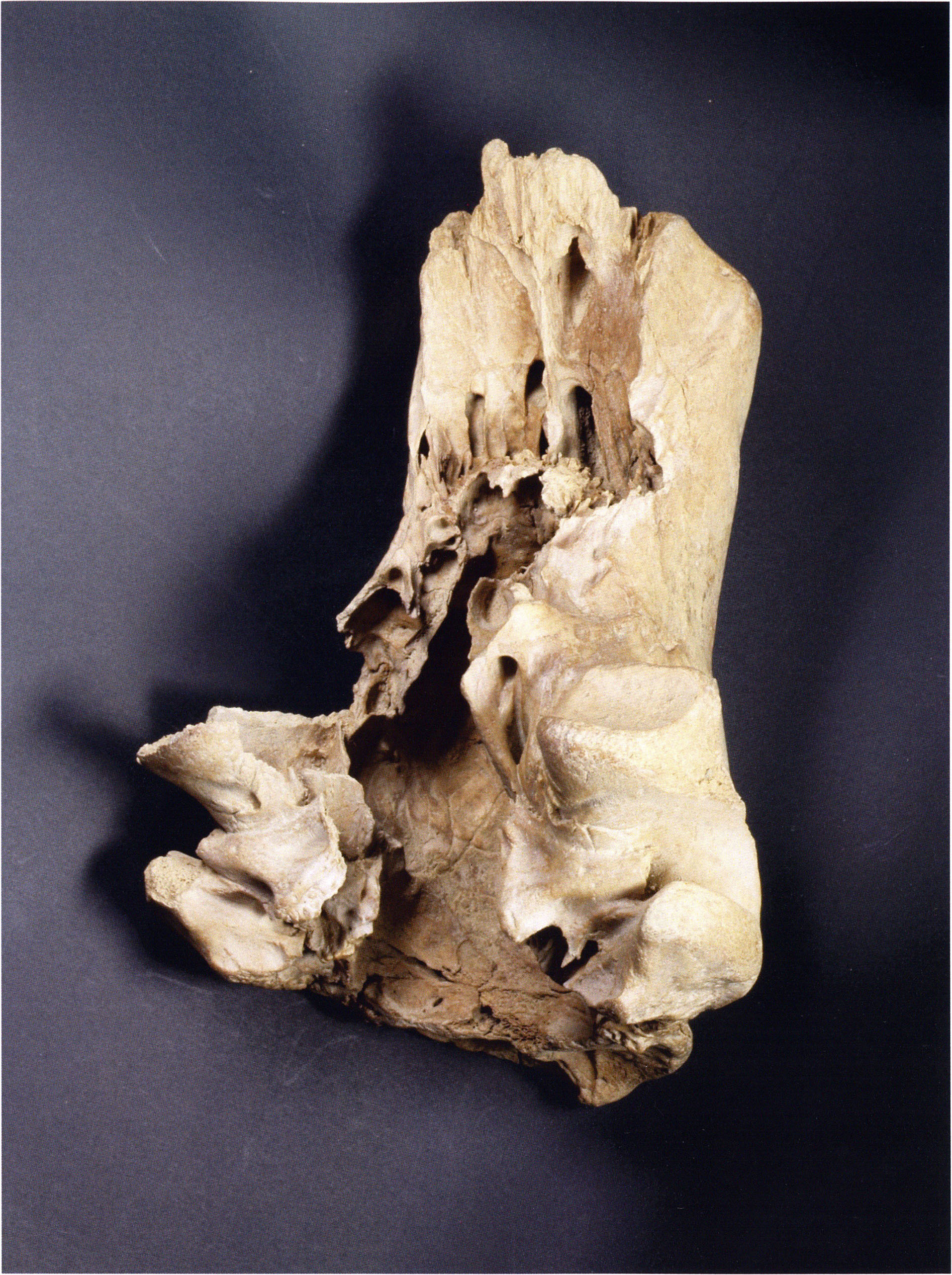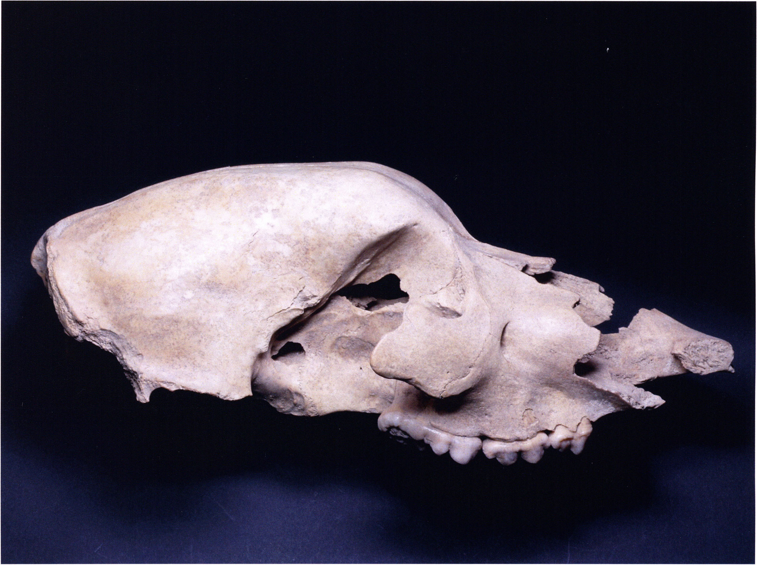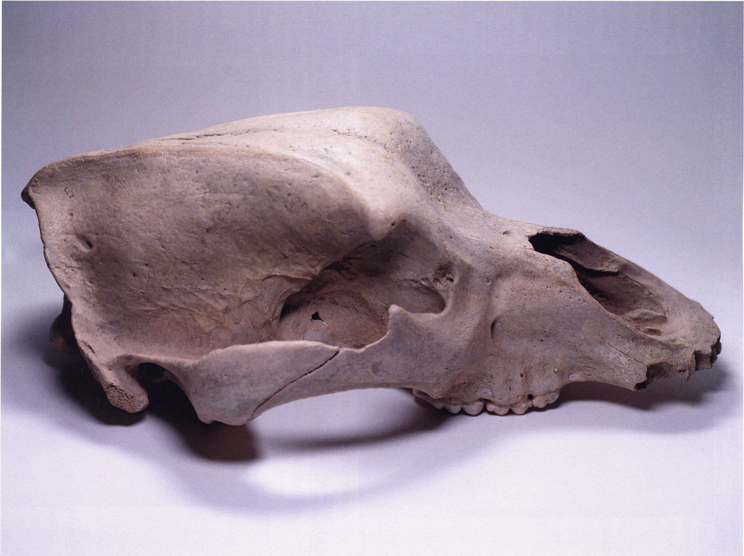 "D 20" shows large openings in the temple region on both sides throughout, and above them on the right side of the skull roof a smaller hole of approximately 3 cm in diameter; the zygomatic arches are absent; otherwise "D 20" is somewhat more complete than "D 17" — the upper jaw has, alongside 4½ molars, the left canine — though peculiarly mutilated — and bears the same traces of human activity as "D 17"! — Profile length: 380 mm.