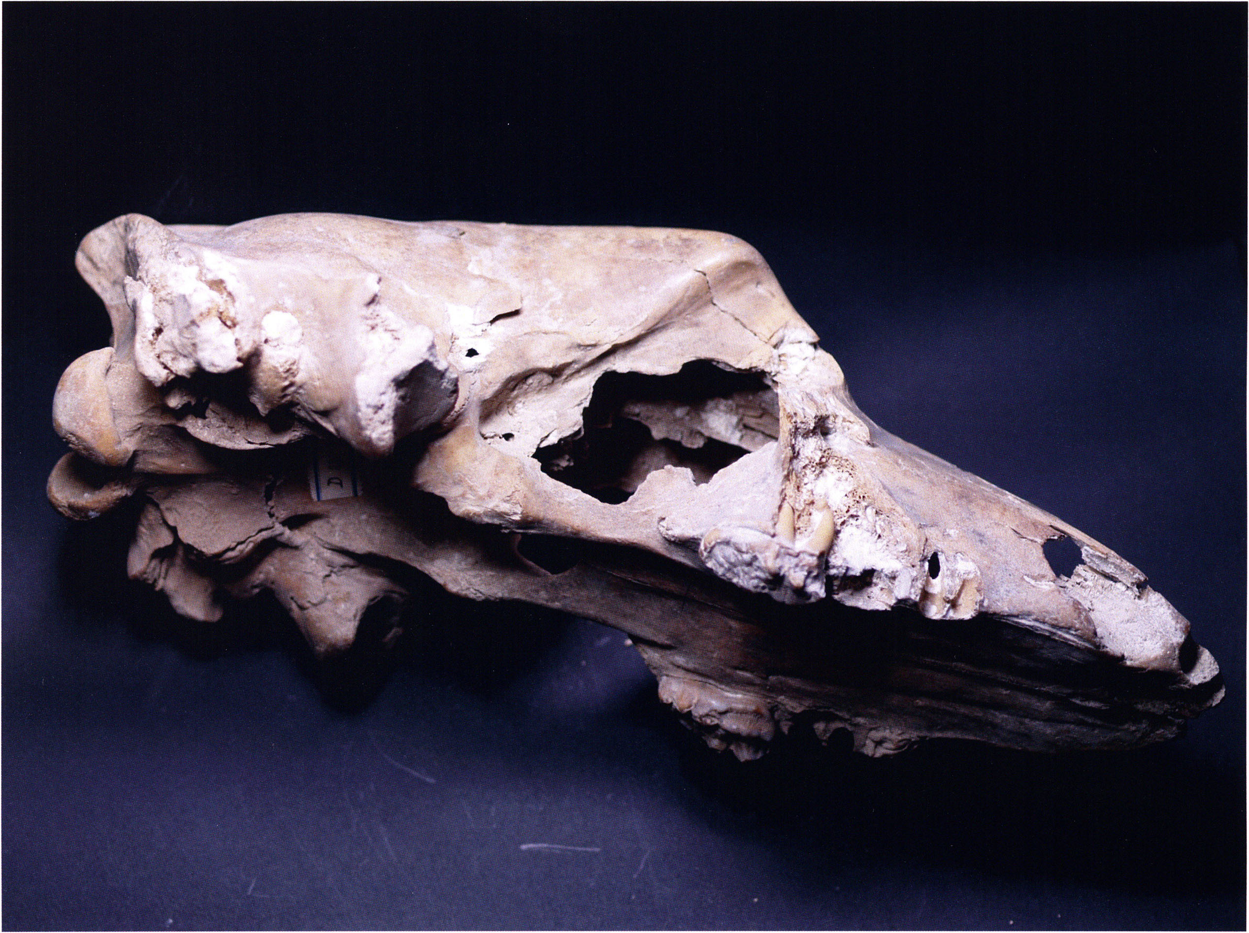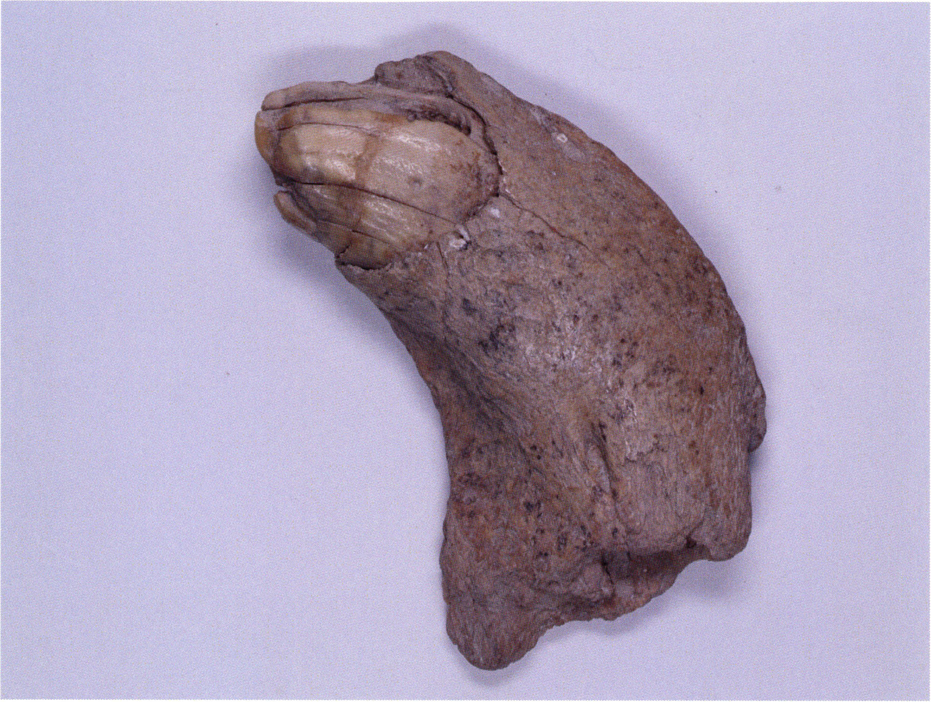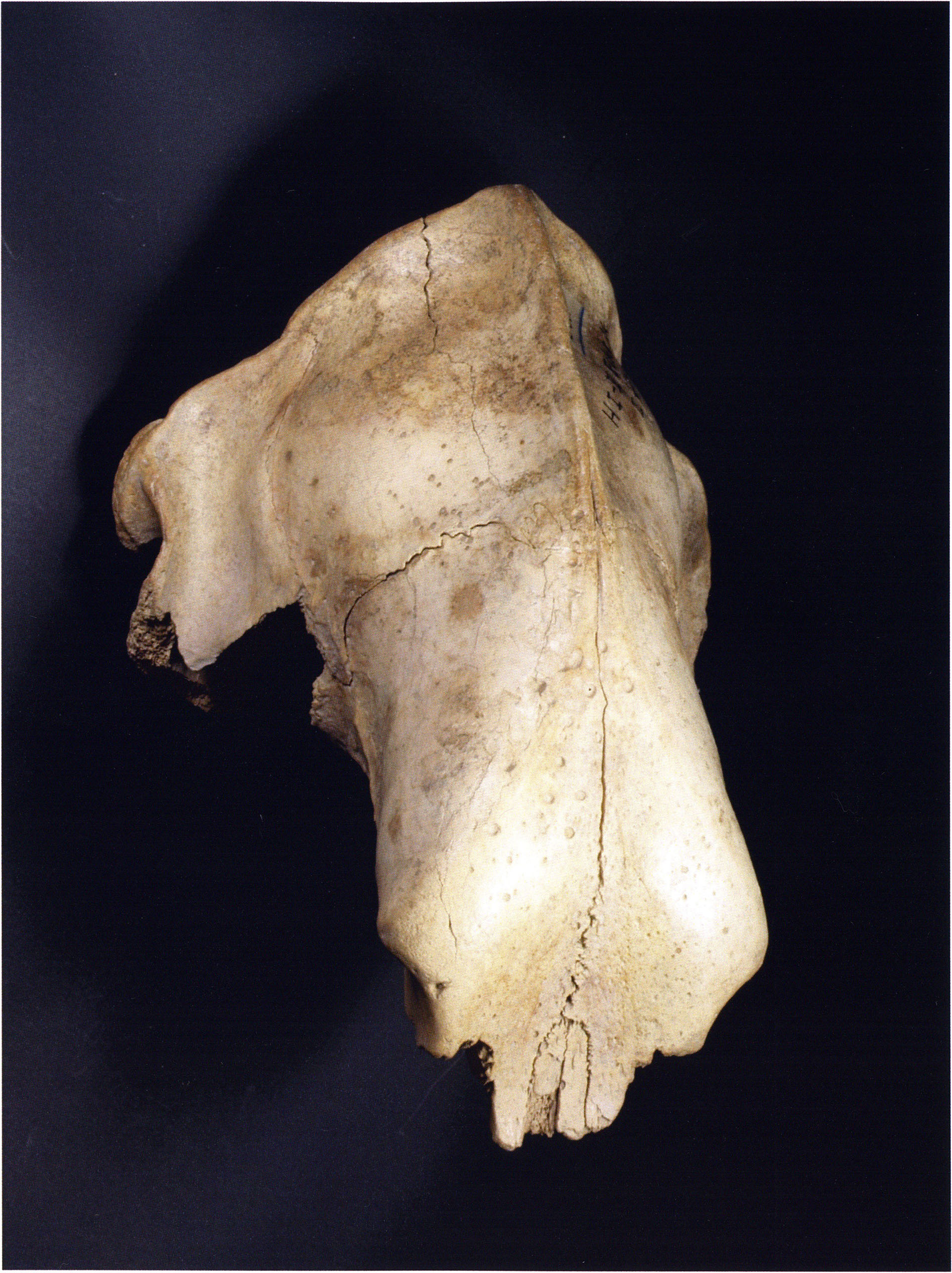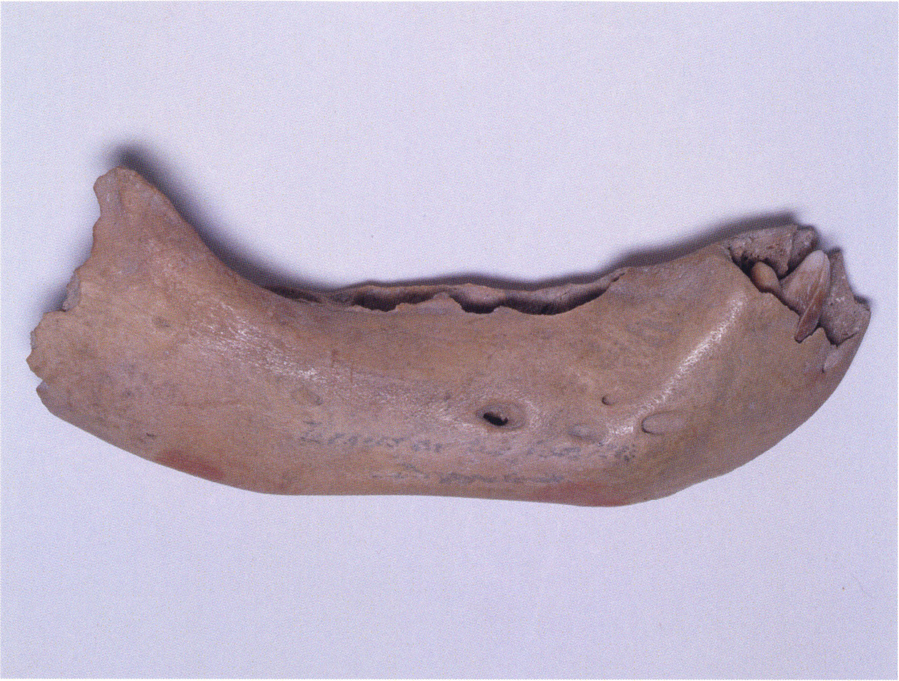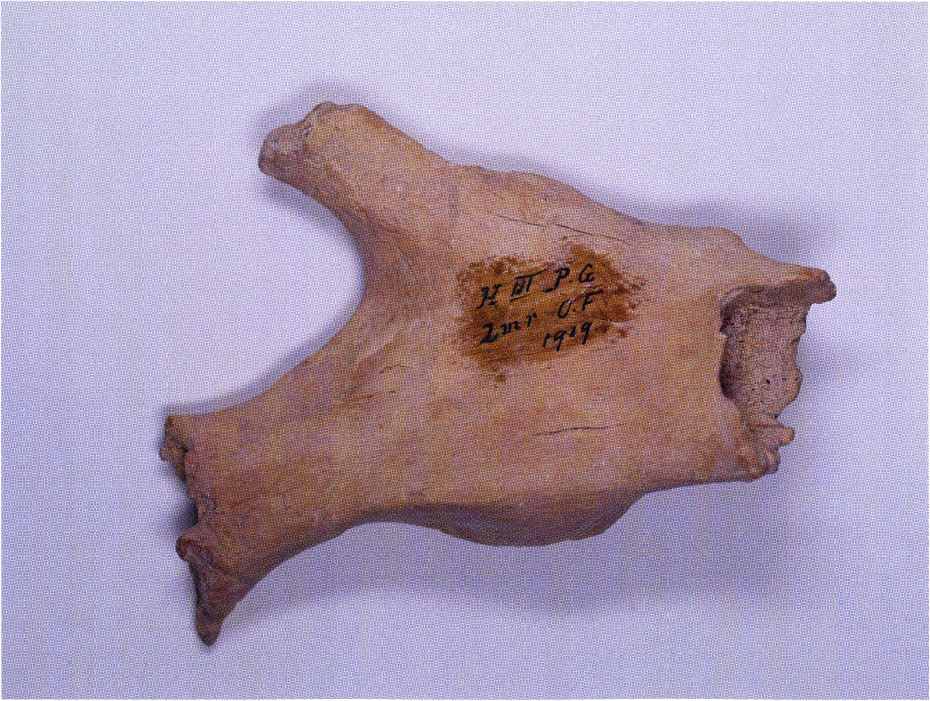"D 20" shows large openings in the temple region on both sides throughout, and above them on the right side of the skull roof a smaller hole of approximately 3 cm in diameter; the zygomatic arches are absent; otherwise "D 20" is somewhat more complete than "D 17" — the upper jaw has, alongside 4½ molars, the left canine — though peculiarly mutilated — and bears the same traces of human activity as "D 17"! — Profile length: 380 mm.