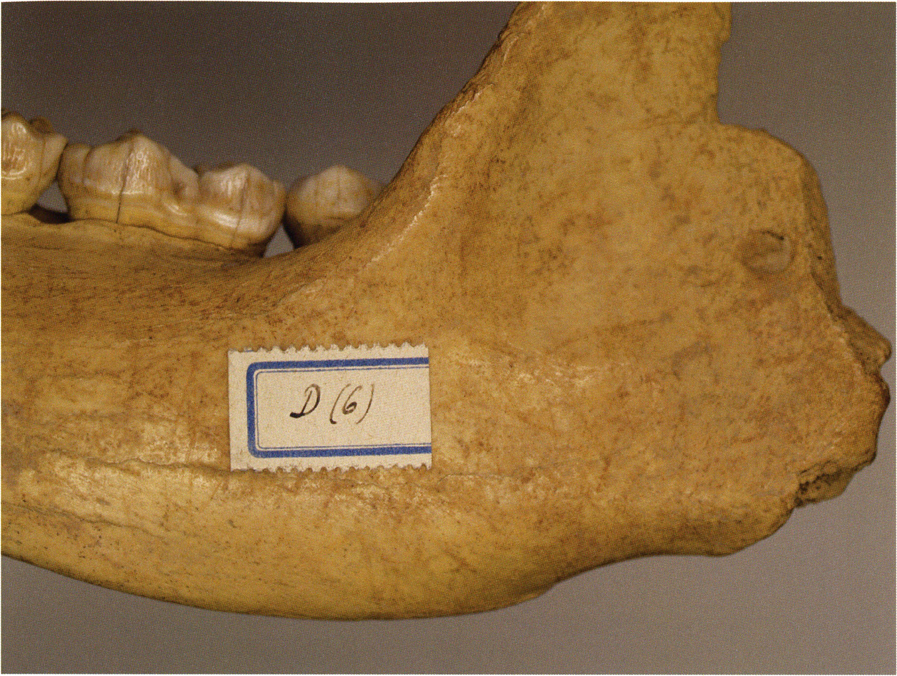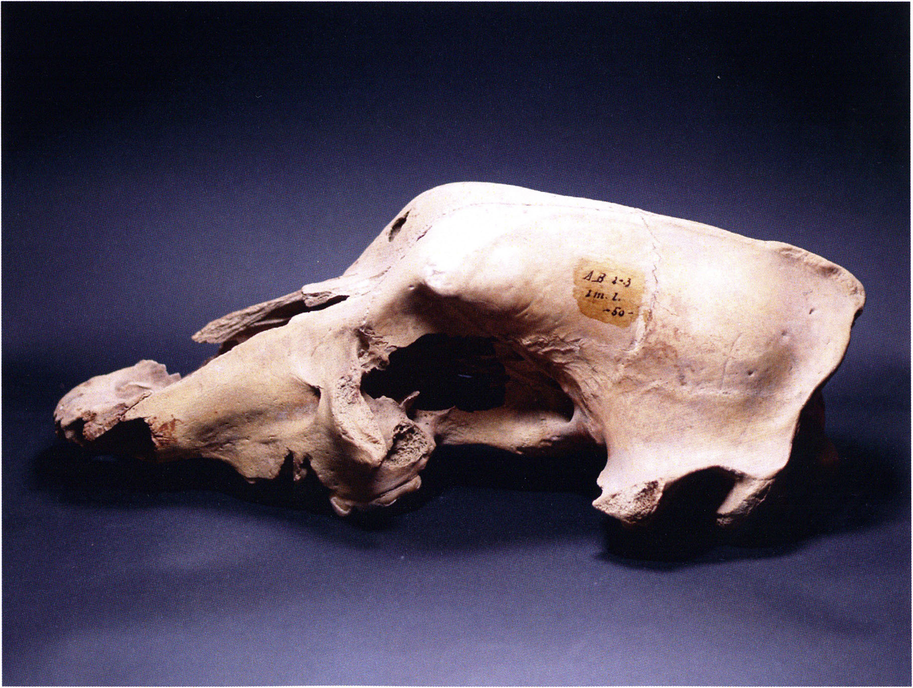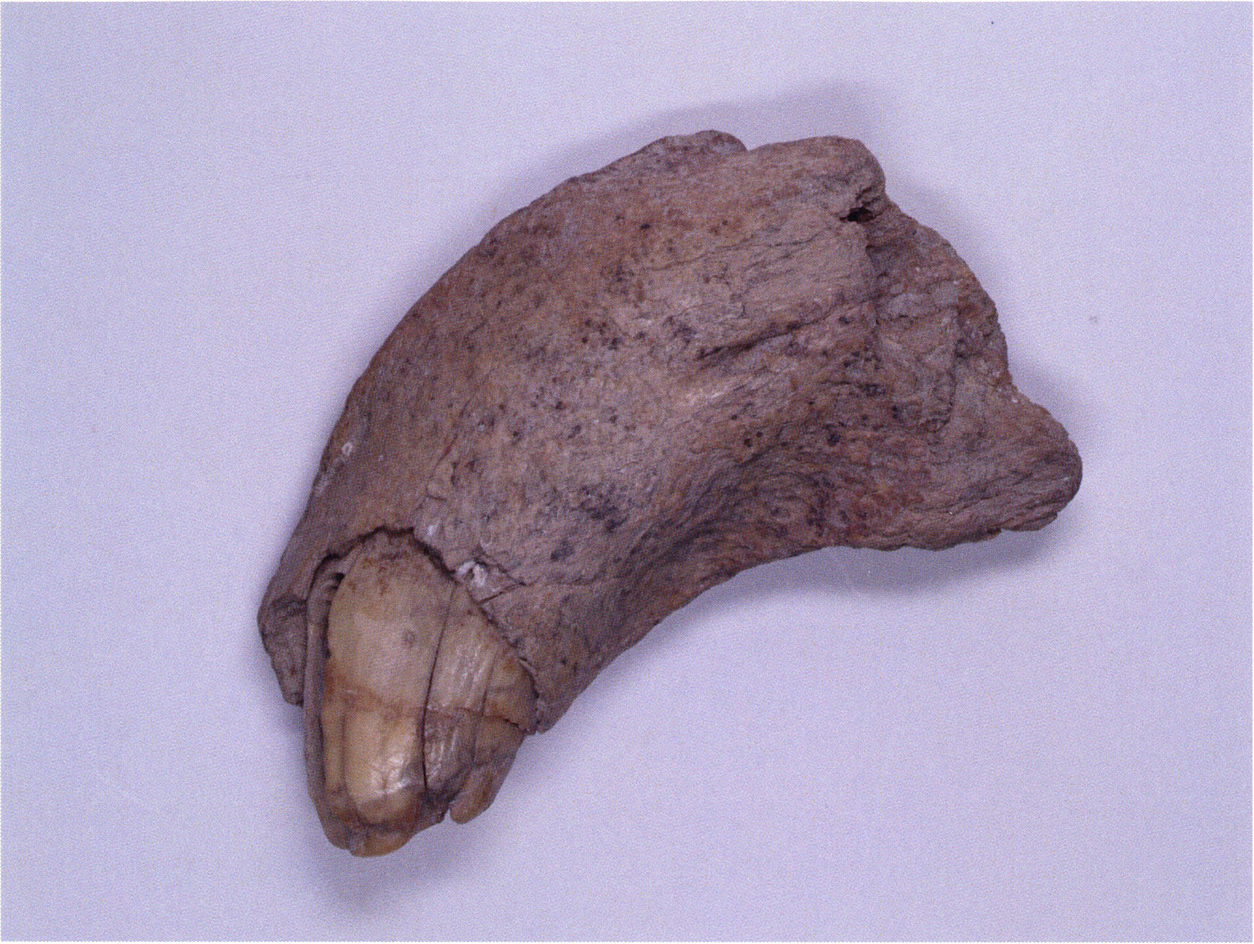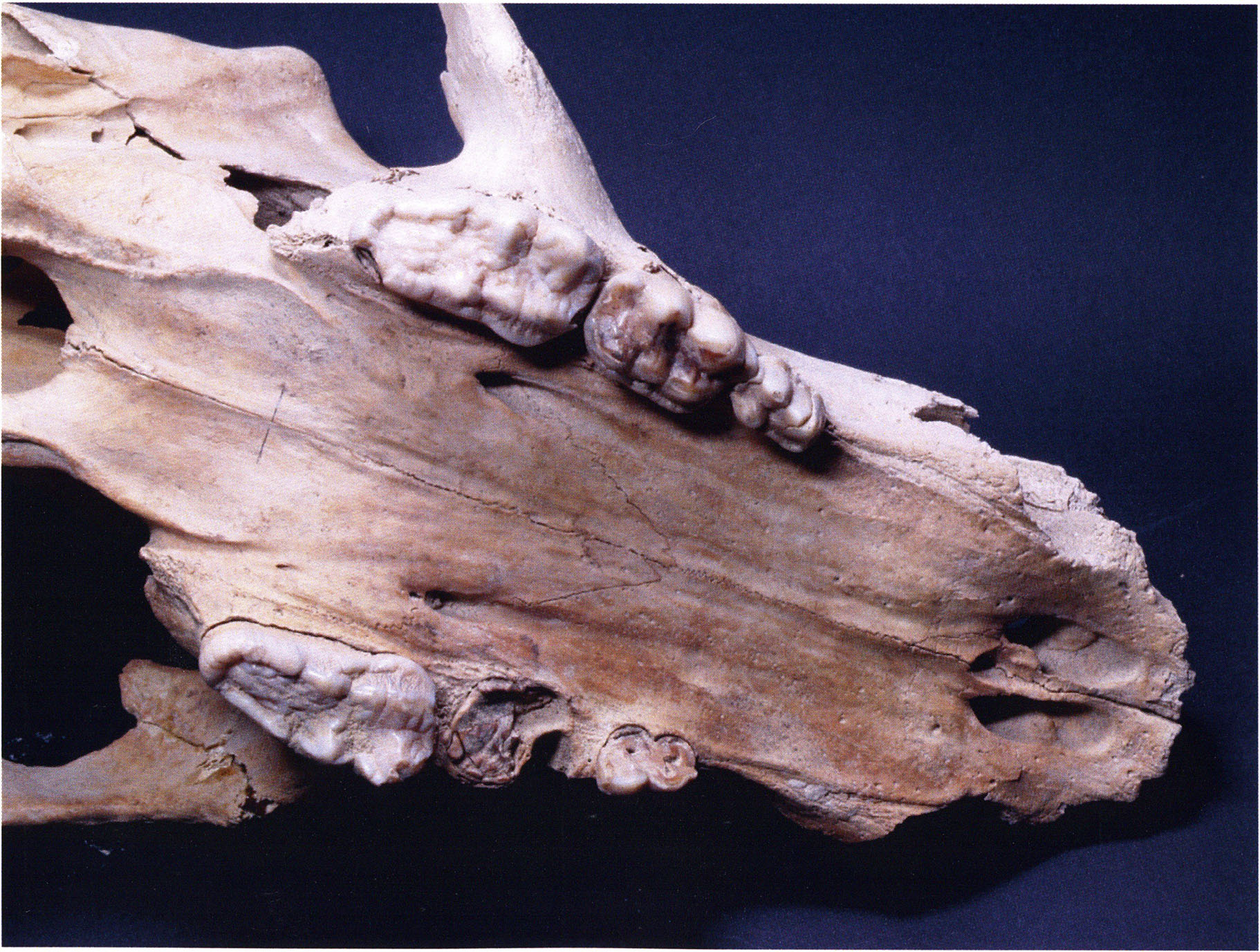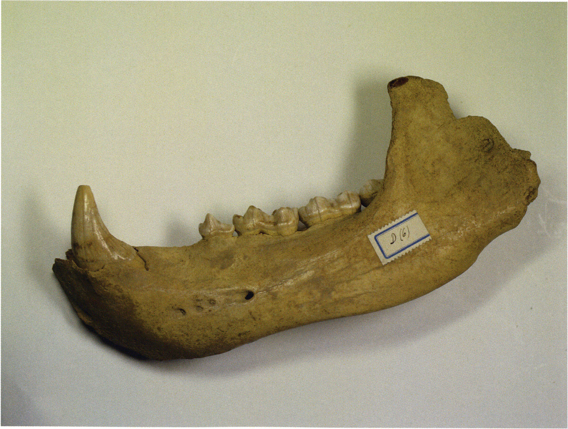 "D 20" shows large openings in the temple region on both sides throughout, and above them on the right side of the skull roof a smaller hole of approximately 3 cm in diameter; the zygomatic arches are absent; otherwise "D 20" is somewhat more complete than "D 17" — the upper jaw has, alongside 4½ molars, the left canine — though peculiarly mutilated — and bears the same traces of human activity as "D 17"! — Profile length: 380 mm.