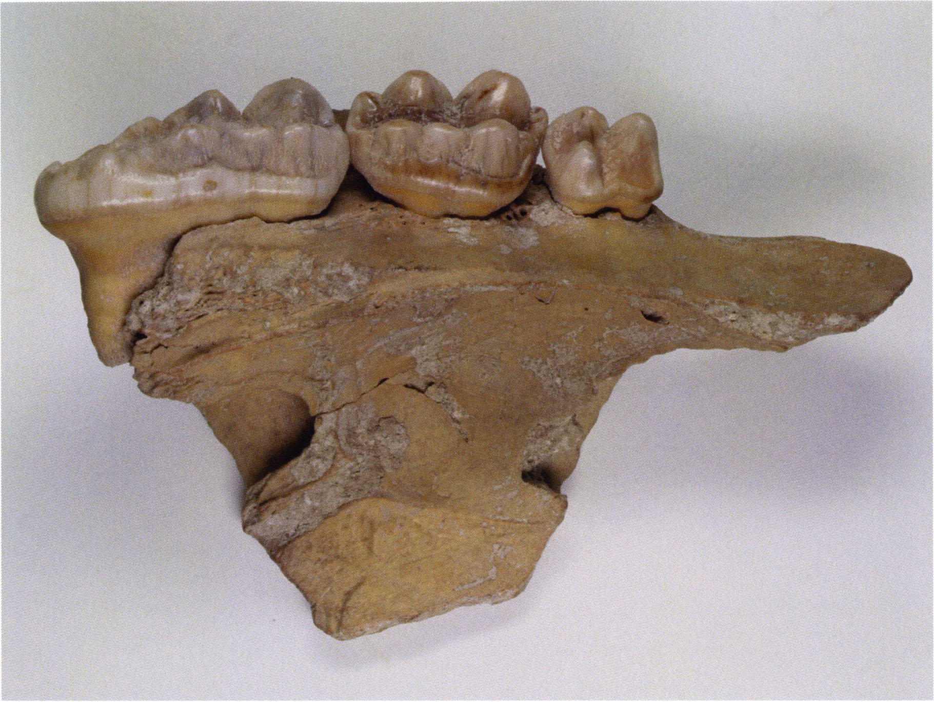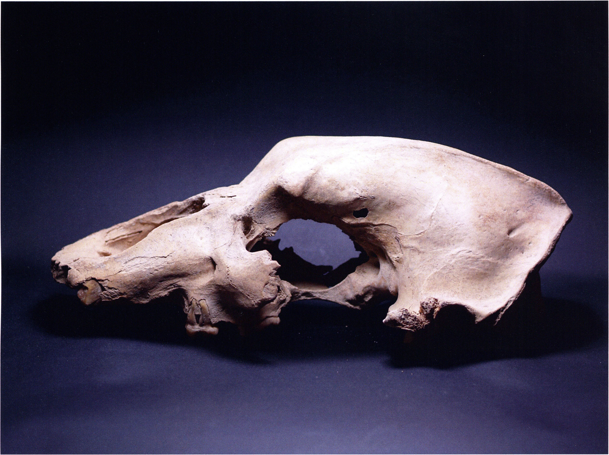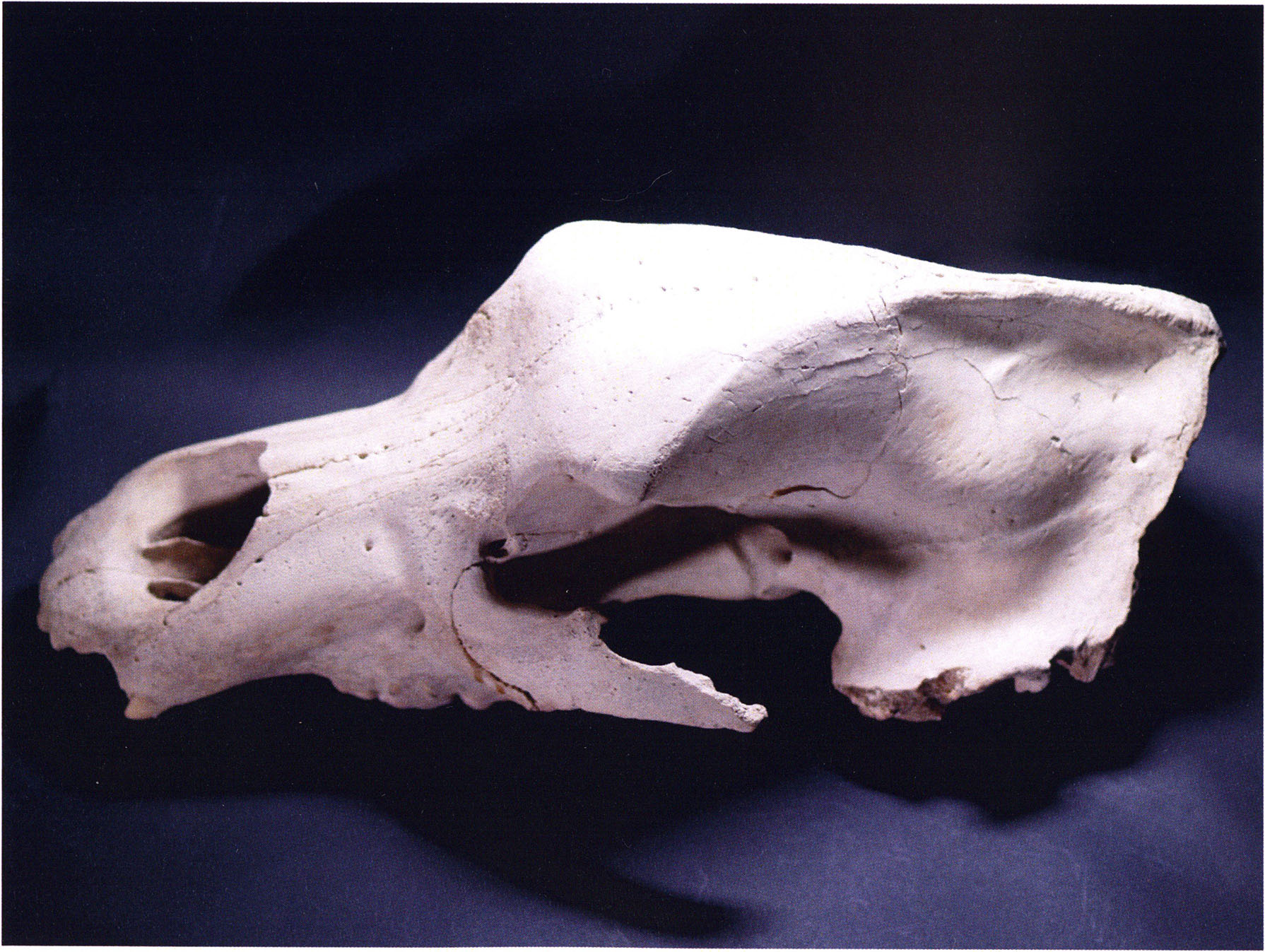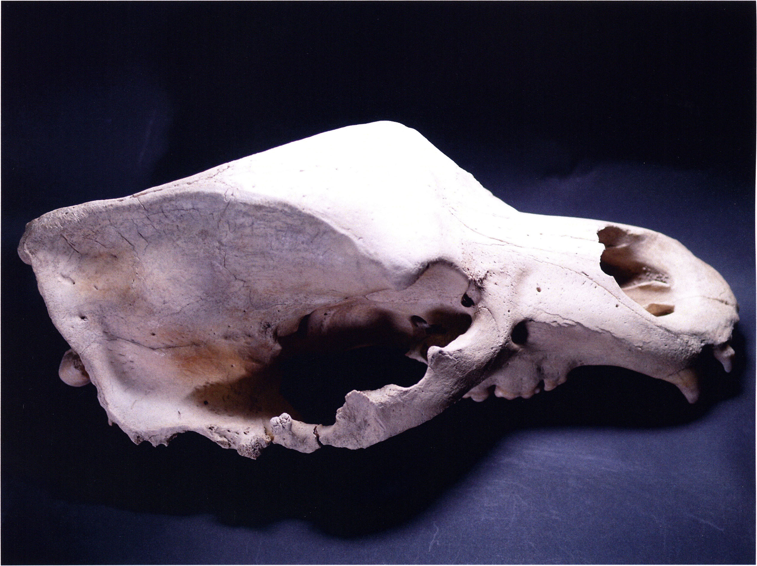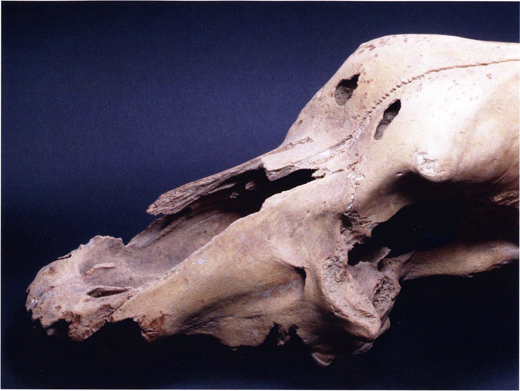 "D 20" shows large openings in the temple region on both sides throughout, and above them on the right side of the skull roof a smaller hole of approximately 3 cm in diameter; the zygomatic arches are absent; otherwise "D 20" is somewhat more complete than "D 17" — the upper jaw has, alongside 4½ molars, the left canine — though peculiarly mutilated — and bears the same traces of human activity as "D 17"! — Profile length: 380 mm.