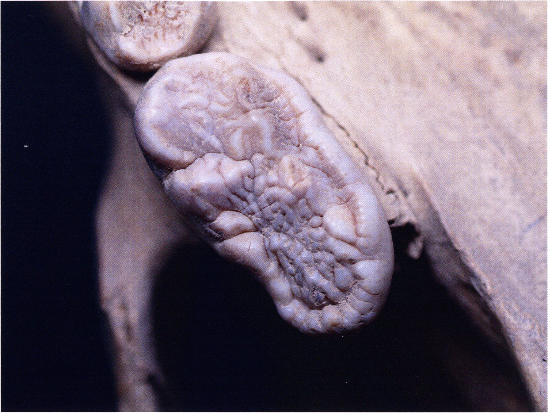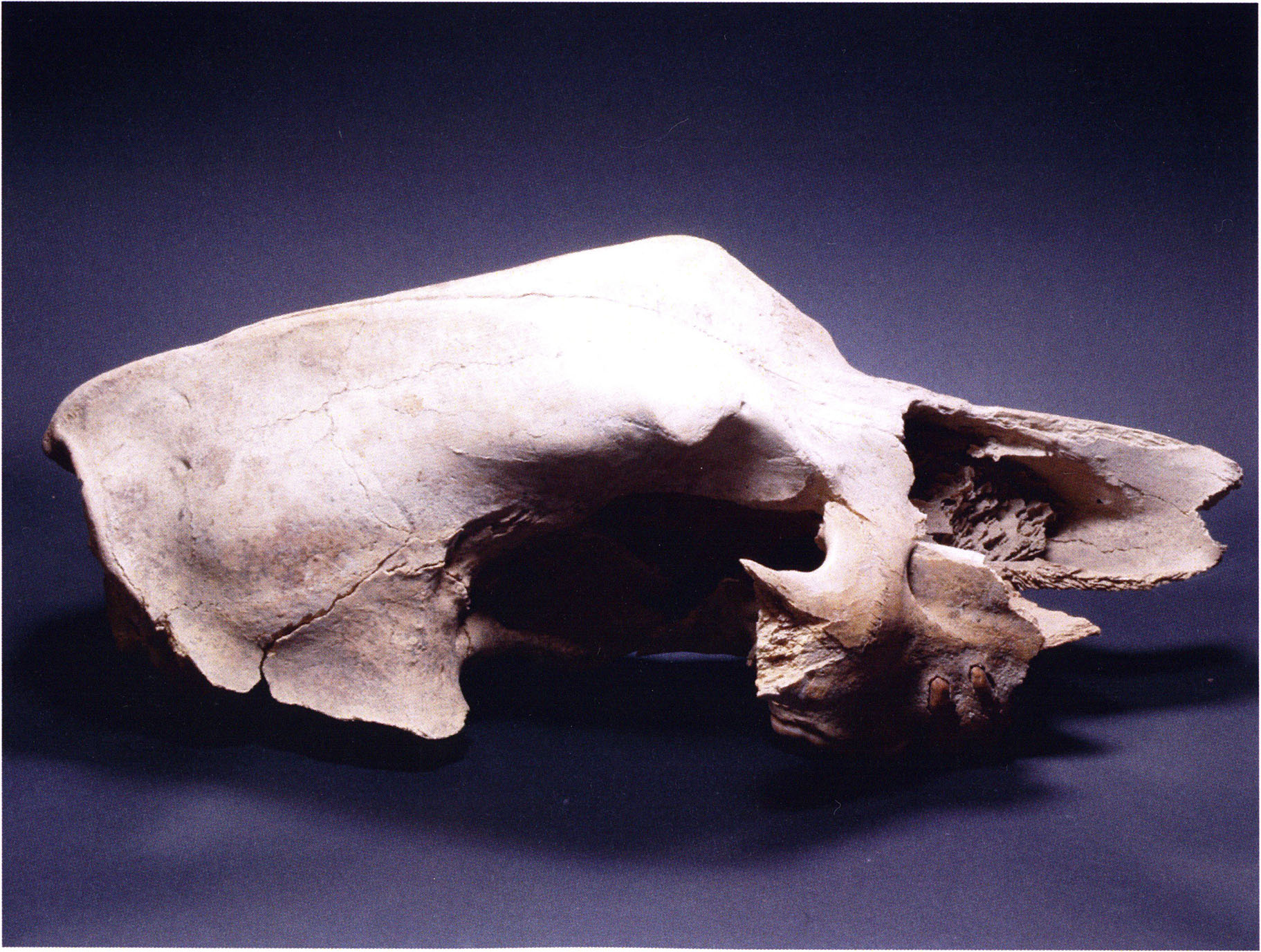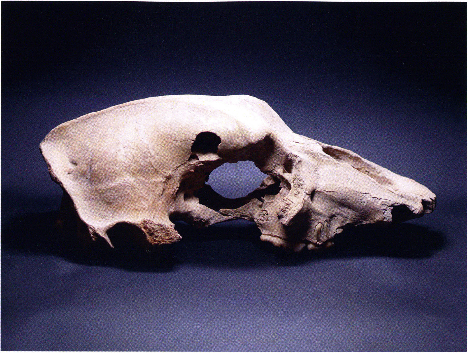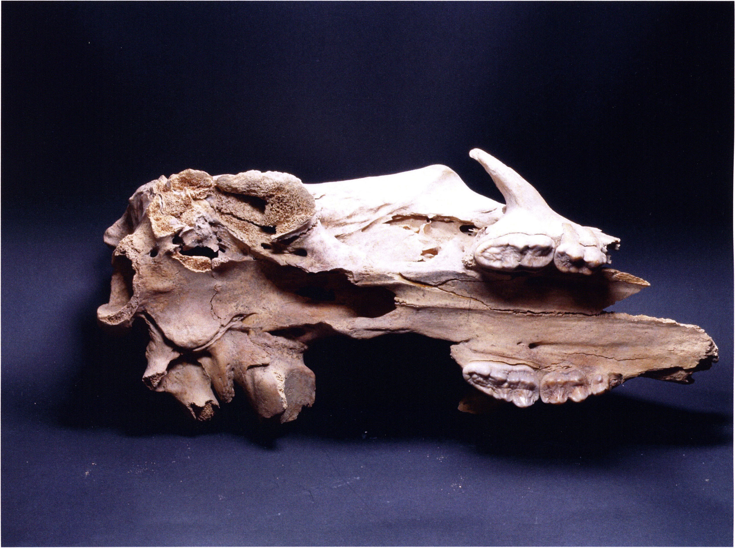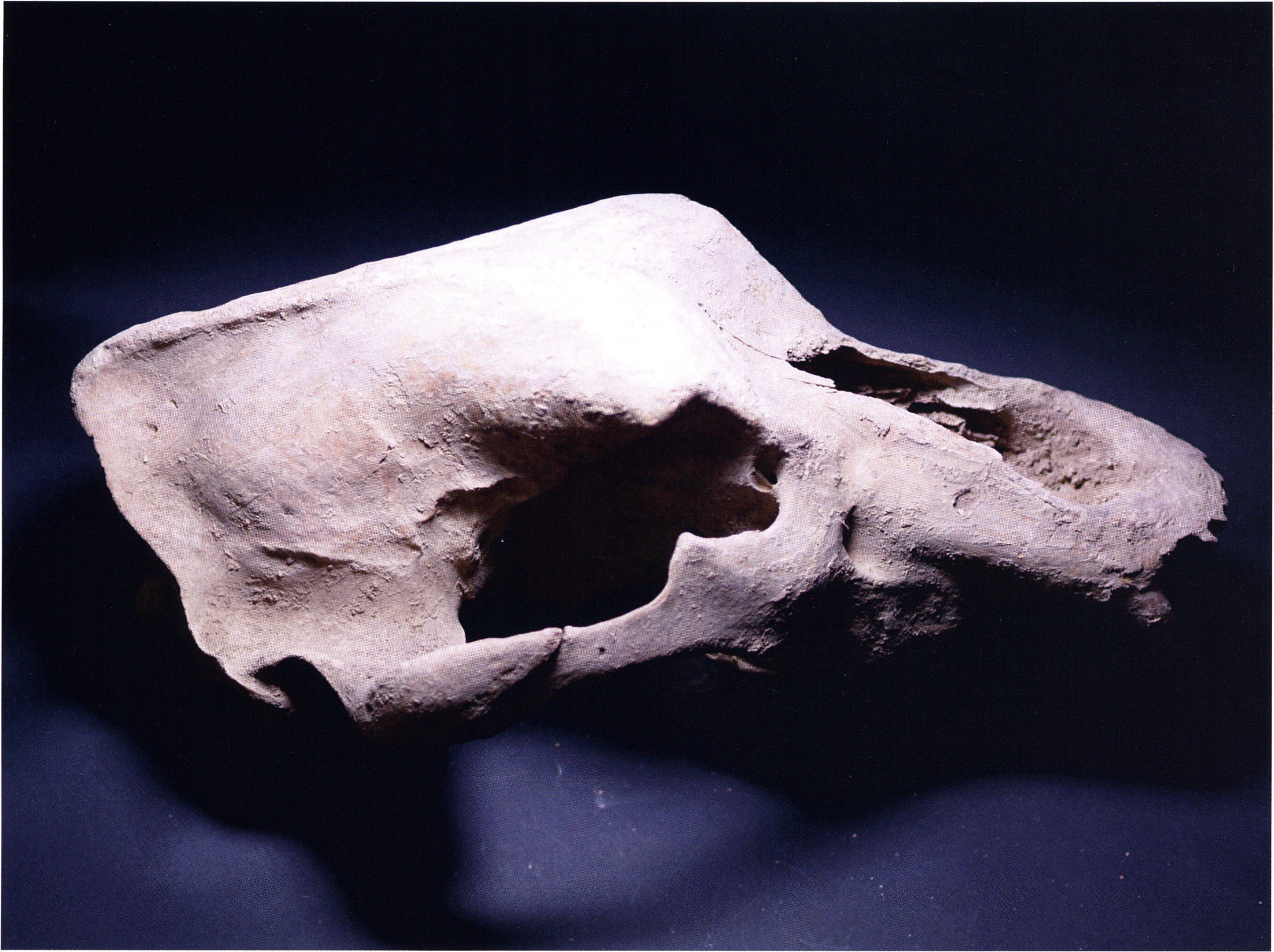 "D 20" shows large openings in the temple region on both sides throughout, and above them on the right side of the skull roof a smaller hole of approximately 3 cm in diameter; the zygomatic arches are absent; otherwise "D 20" is somewhat more complete than "D 17" — the upper jaw has, alongside 4½ molars, the left canine — though peculiarly mutilated — and bears the same traces of human activity as "D 17"! — Profile length: 380 mm.