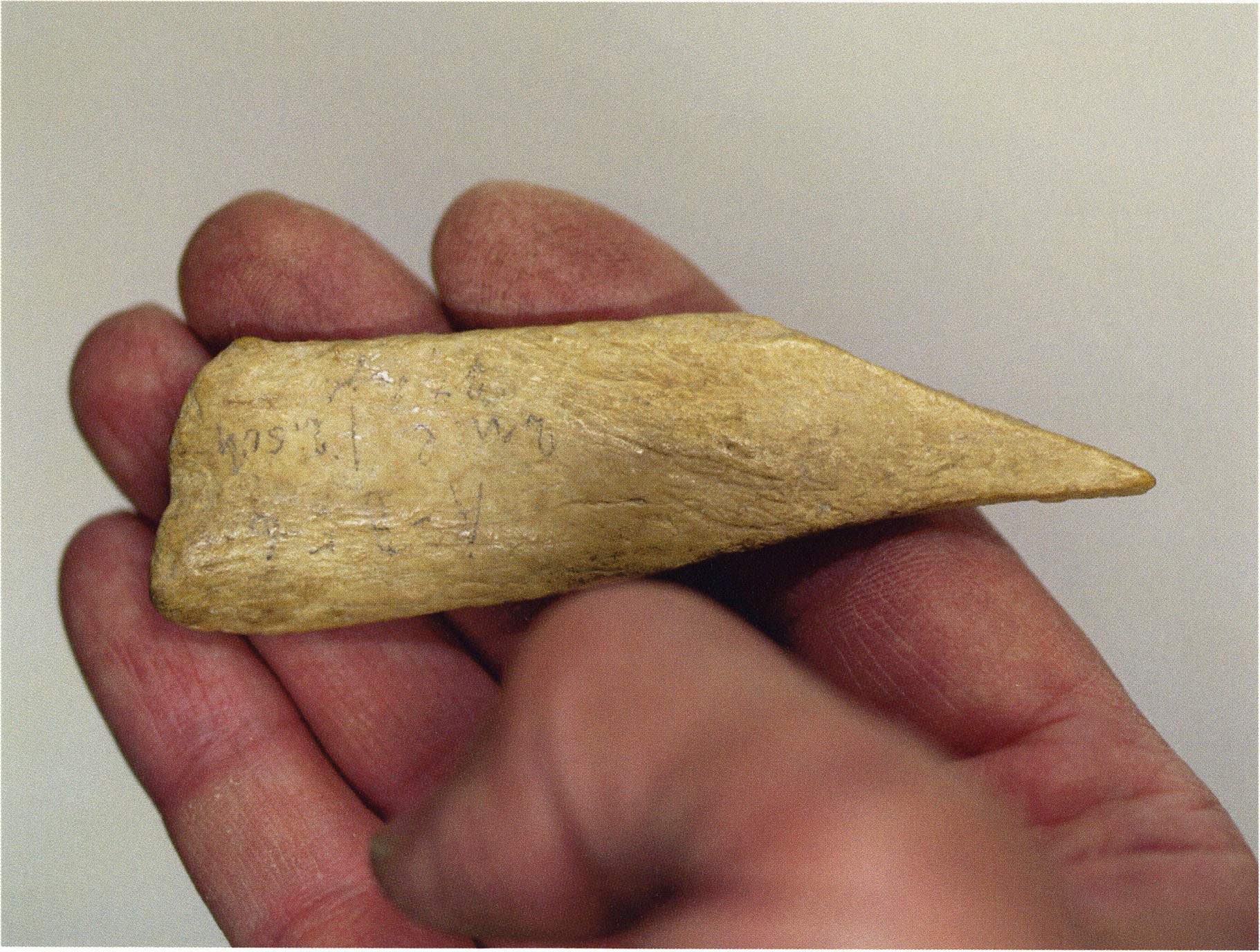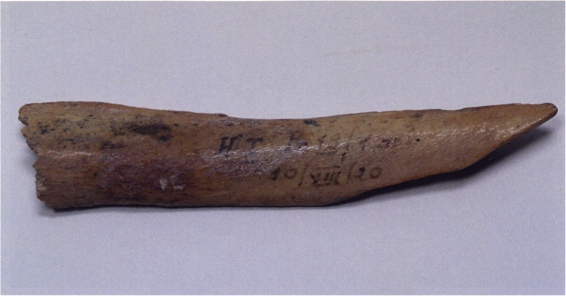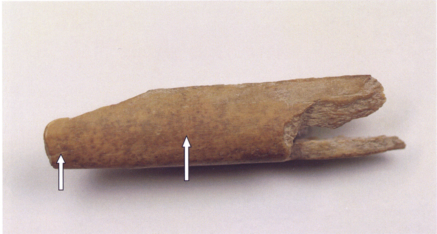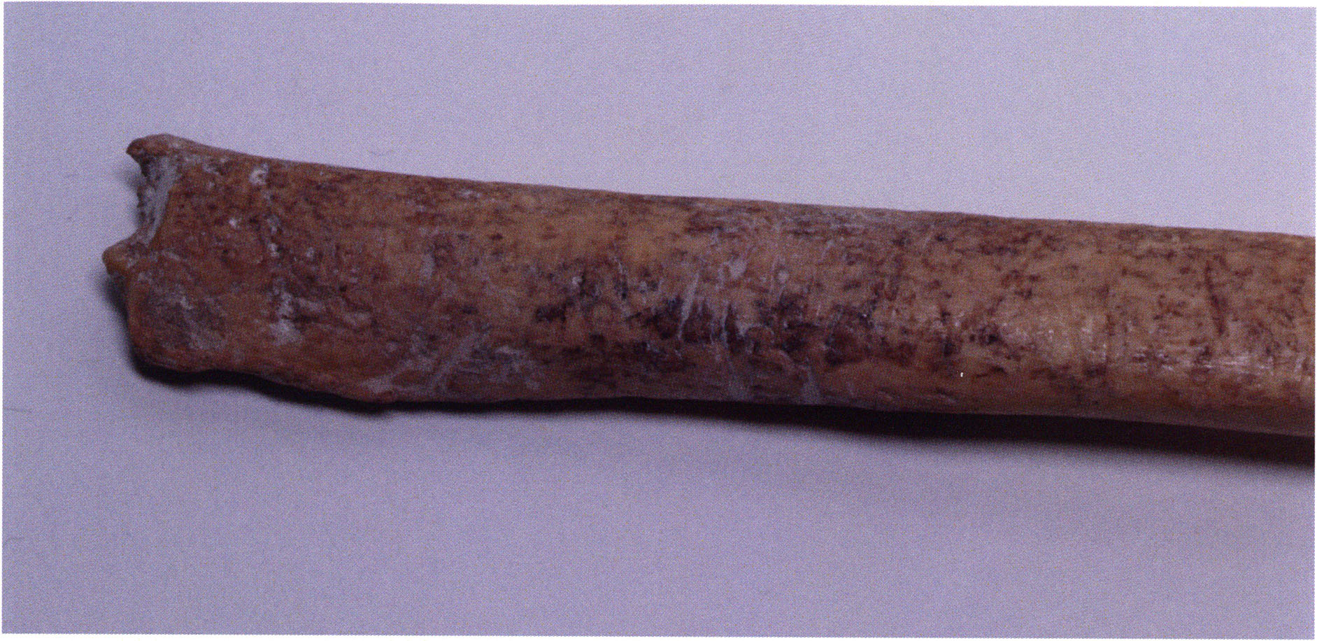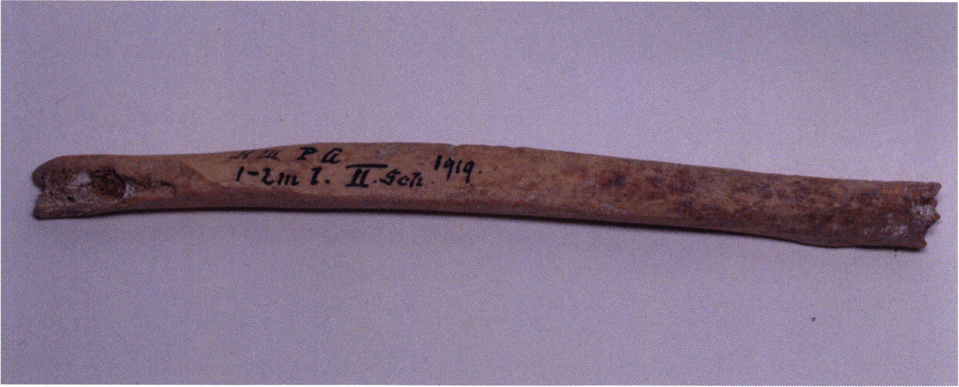 Figs. 173 a–c, pp. 371 f.: 89 mm long rib fragment with polished flute-beak fracture at one of the two fracture sites, numerous fine scratch marks on the outer surface from working, and the inscription "H III section 9, 1 m right." — This inscription is partially somewhat faded — notably the "r" — visible only upon closer inspection — not "l"! — of "right" (of the axis). For this stated location Nigg records in 1923, p. 27, as accompaniment of a third skull depot in the 9th section metre of H III, 1st m right of the axis, in the 2nd layer resting immediately on the 3rd layer: "a suspicious rib piece"! We can be almost certain that the photographed piece is this "suspicious rib piece"! — (a) Outer surface. (b) Outer surface of the polished flute-beak fracture end. (c) Inner surface.