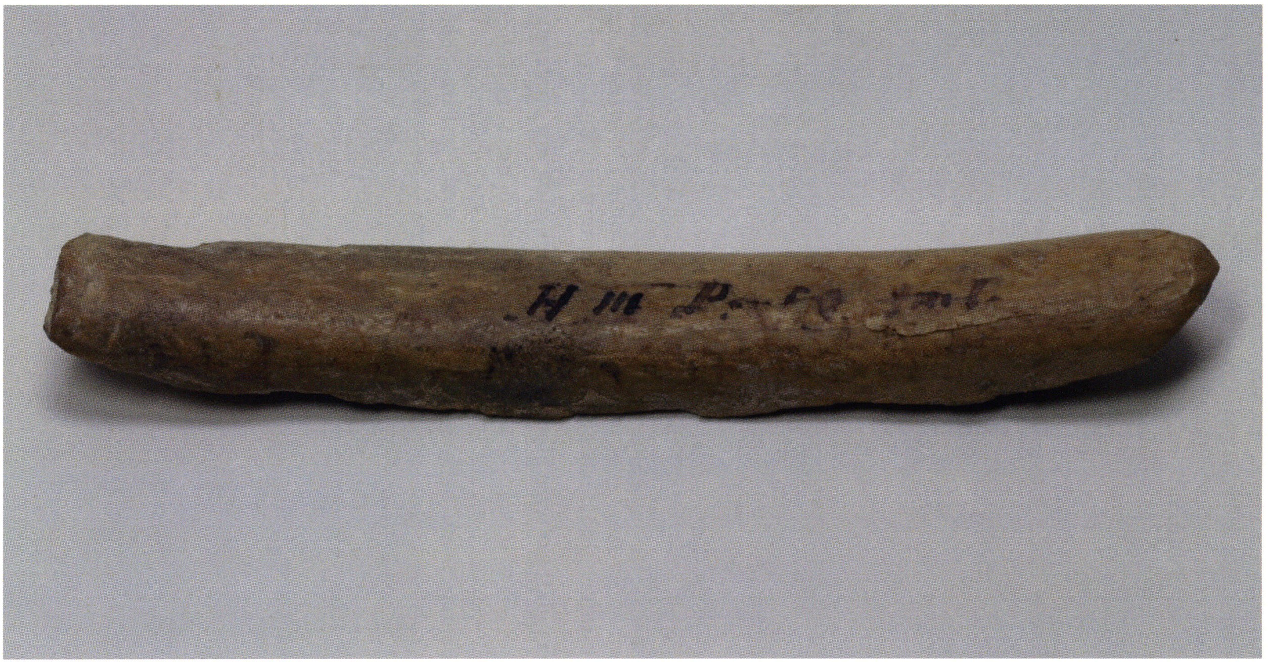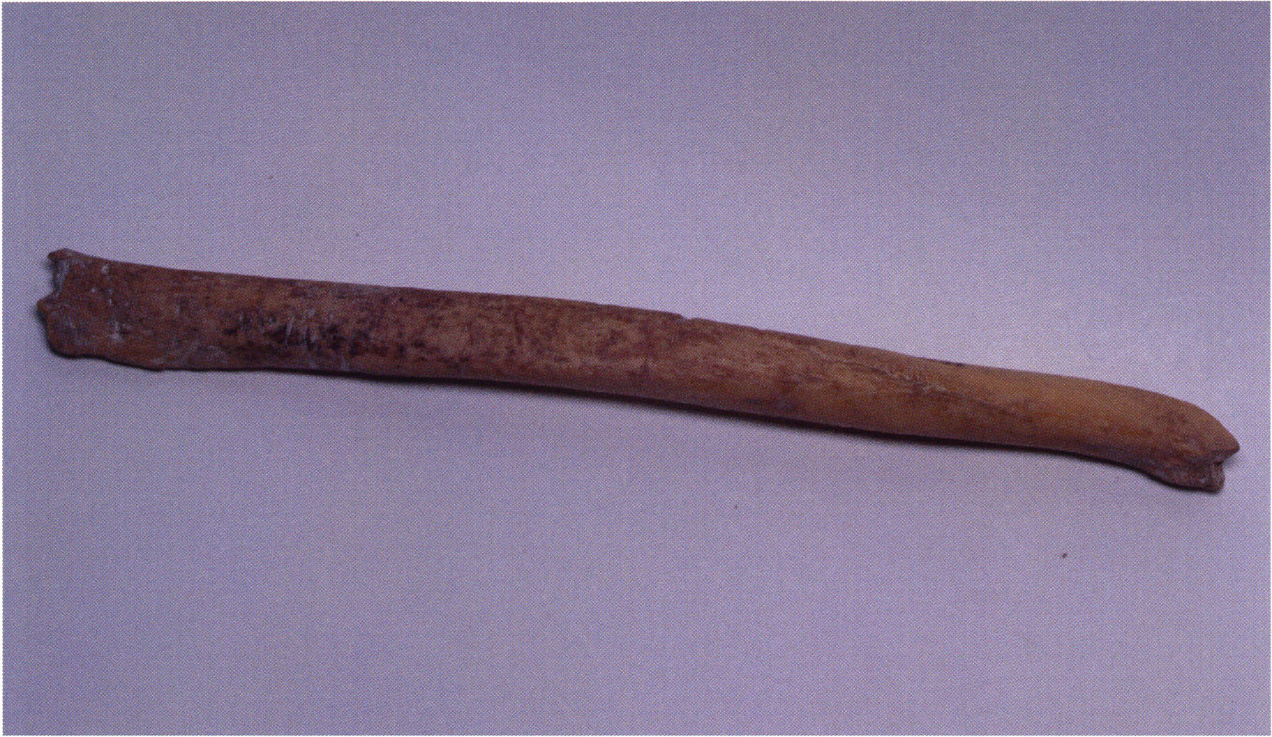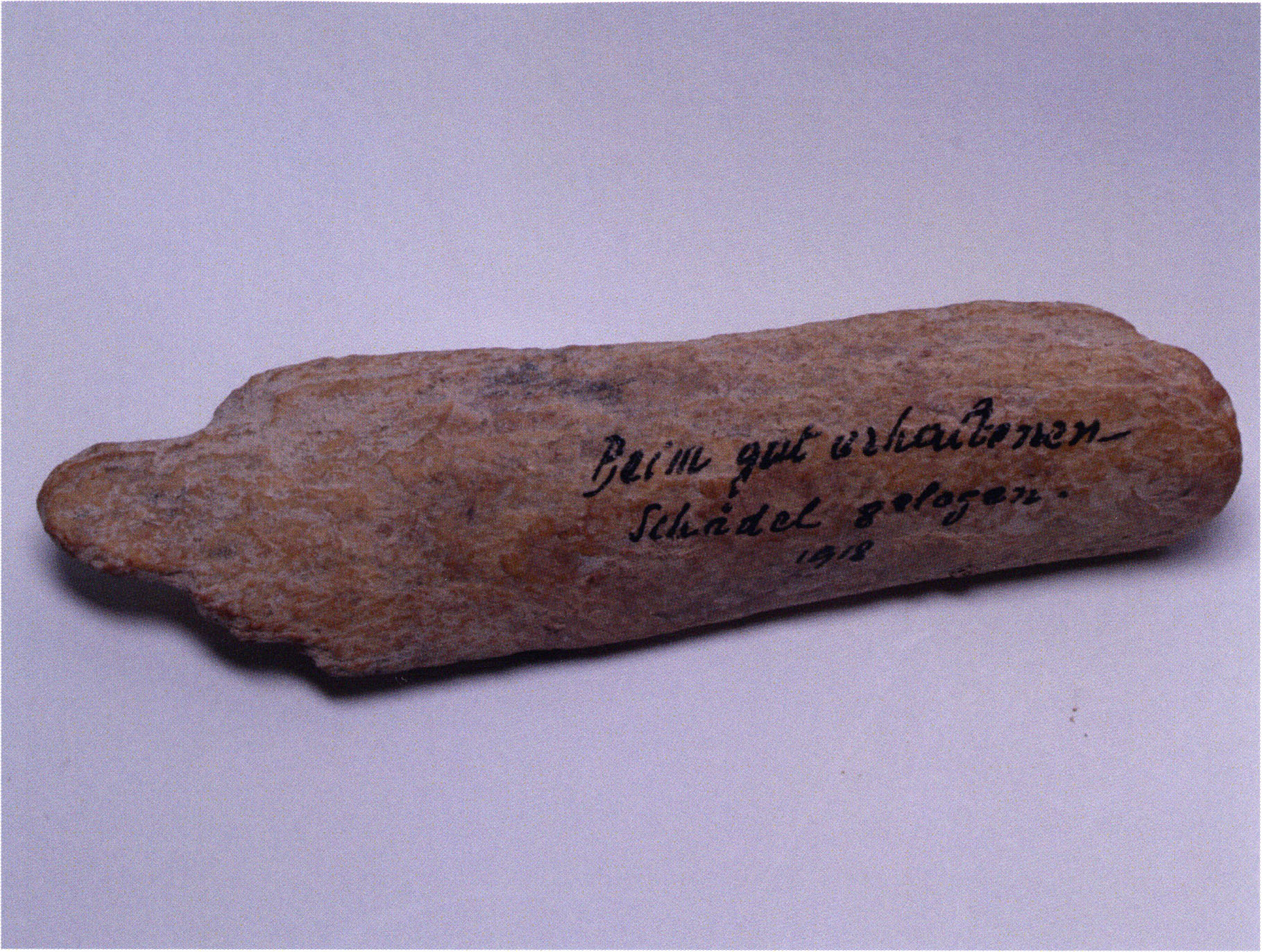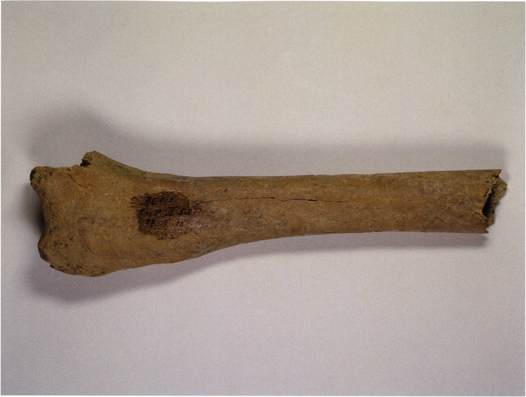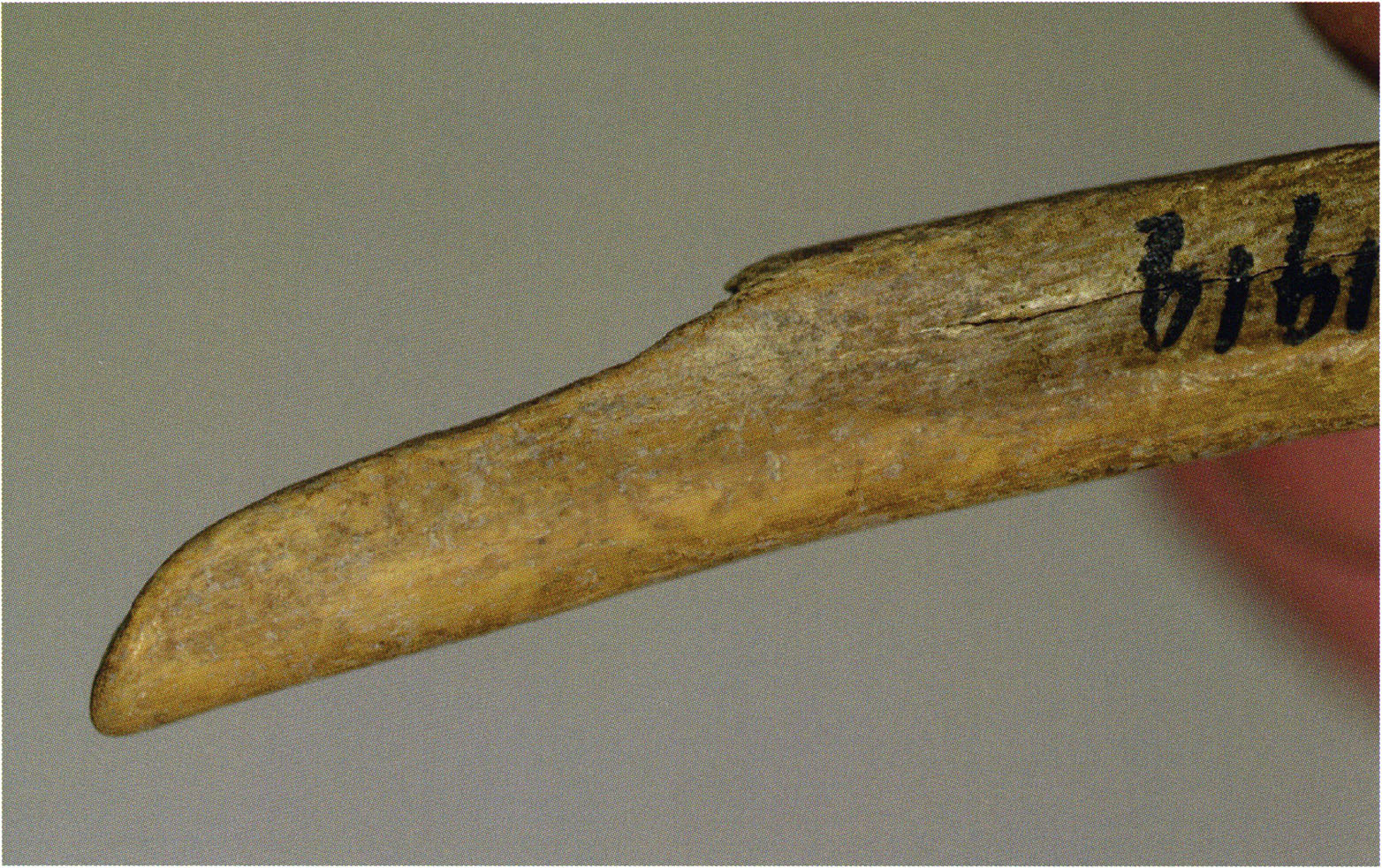 Figs. 173 a–c, pp. 371 f.: 89 mm long rib fragment with polished flute-beak fracture at one of the two fracture sites, numerous fine scratch marks on the outer surface from working, and the inscription "H III section 9, 1 m right." — This inscription is partially somewhat faded — notably the "r" — visible only upon closer inspection — not "l"! — of "right" (of the axis). For this stated location Nigg records in 1923, p. 27, as accompaniment of a third skull depot in the 9th section metre of H III, 1st m right of the axis, in the 2nd layer resting immediately on the 3rd layer: "a suspicious rib piece"! We can be almost certain that the photographed piece is this "suspicious rib piece"! — (a) Outer surface. (b) Outer surface of the polished flute-beak fracture end. (c) Inner surface.