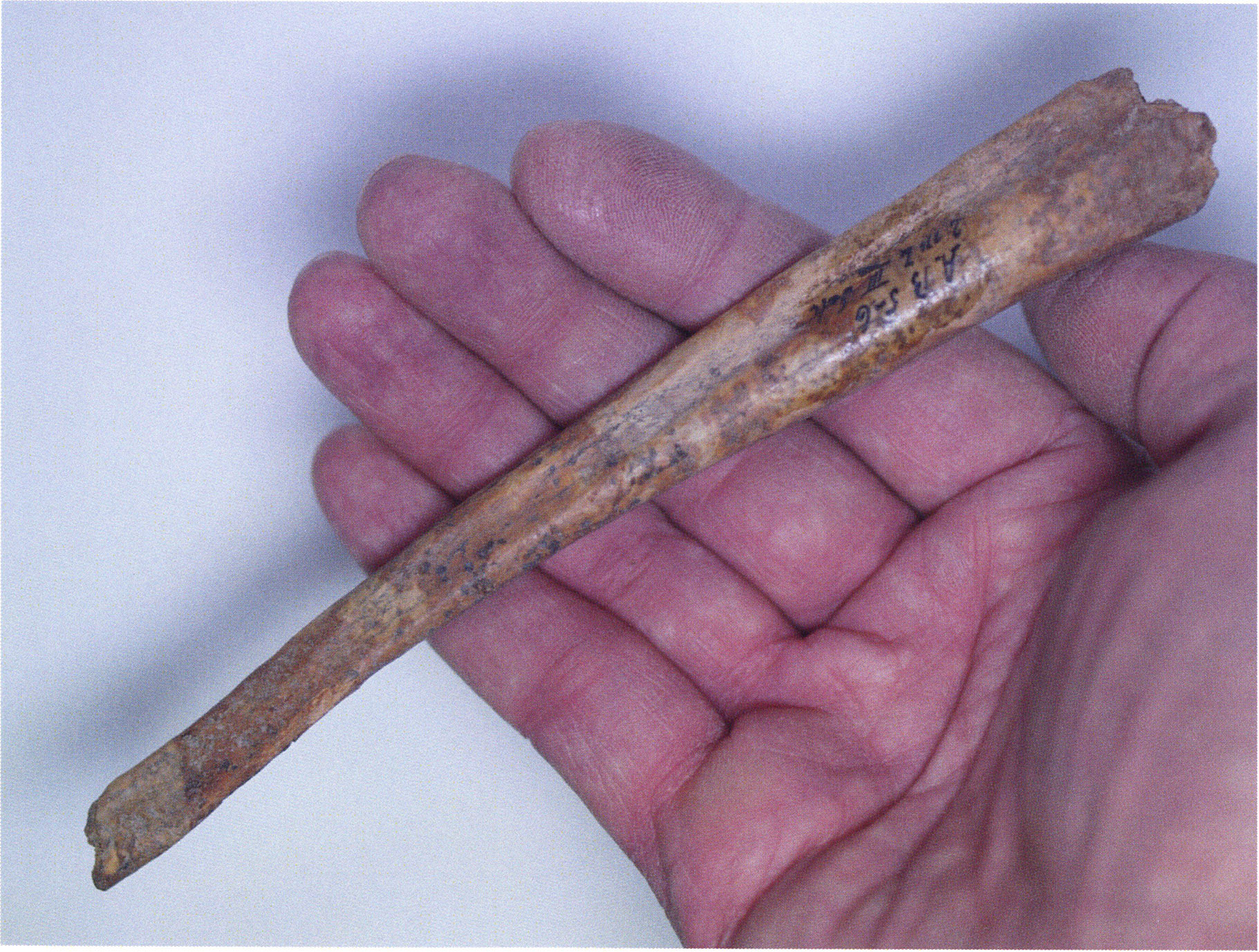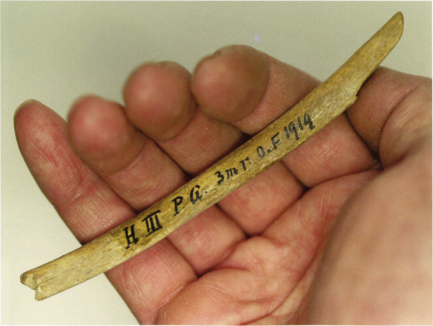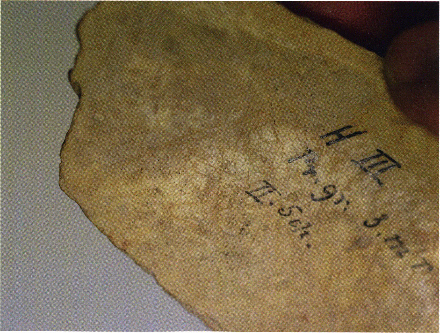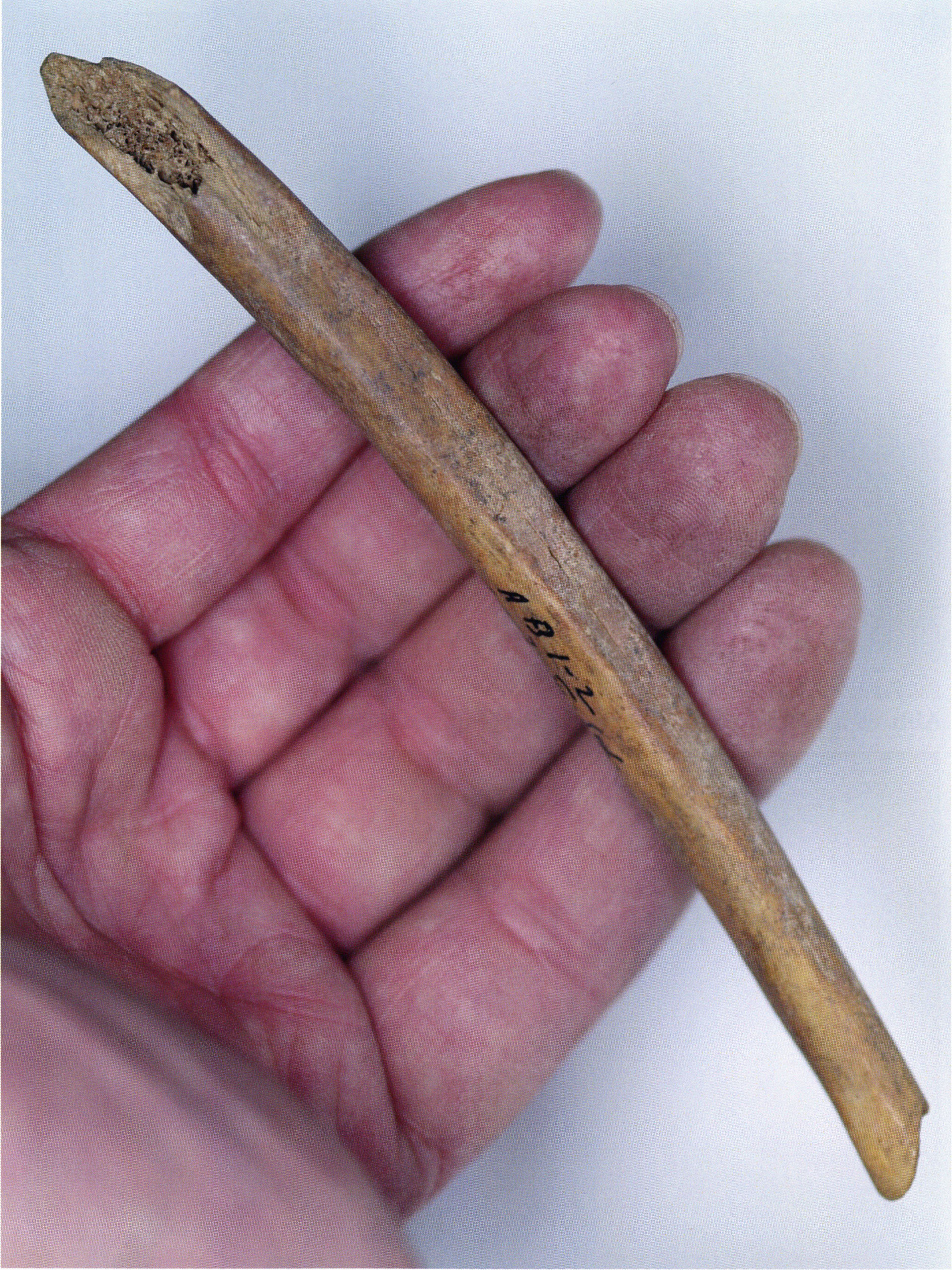 Figs. 173 a–c, pp. 371 f.: 89 mm long rib fragment with polished flute-beak fracture at one of the two fracture sites, numerous fine scratch marks on the outer surface from working, and the inscription "H III section 9, 1 m right." — This inscription is partially somewhat faded — notably the "r" — visible only upon closer inspection — not "l"! — of "right" (of the axis). For this stated location Nigg records in 1923, p. 27, as accompaniment of a third skull depot in the 9th section metre of H III, 1st m right of the axis, in the 2nd layer resting immediately on the 3rd layer: "a suspicious rib piece"! We can be almost certain that the photographed piece is this "suspicious rib piece"! — (a) Outer surface. (b) Outer surface of the polished flute-beak fracture end. (c) Inner surface.