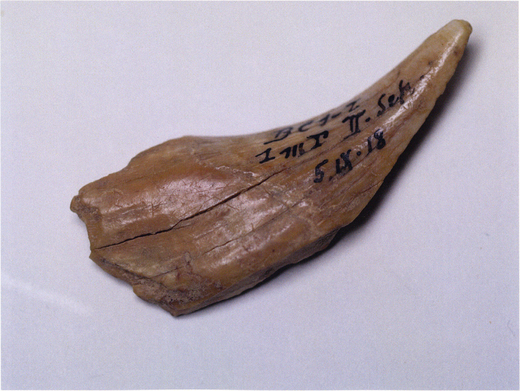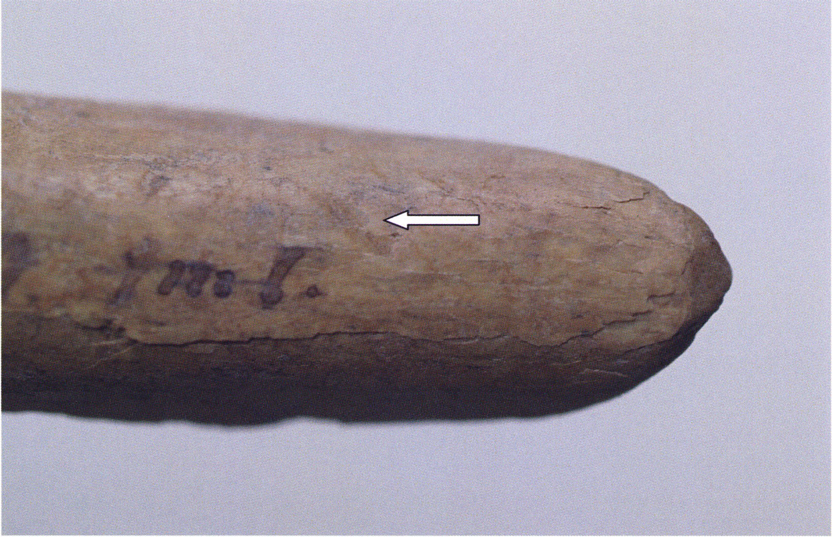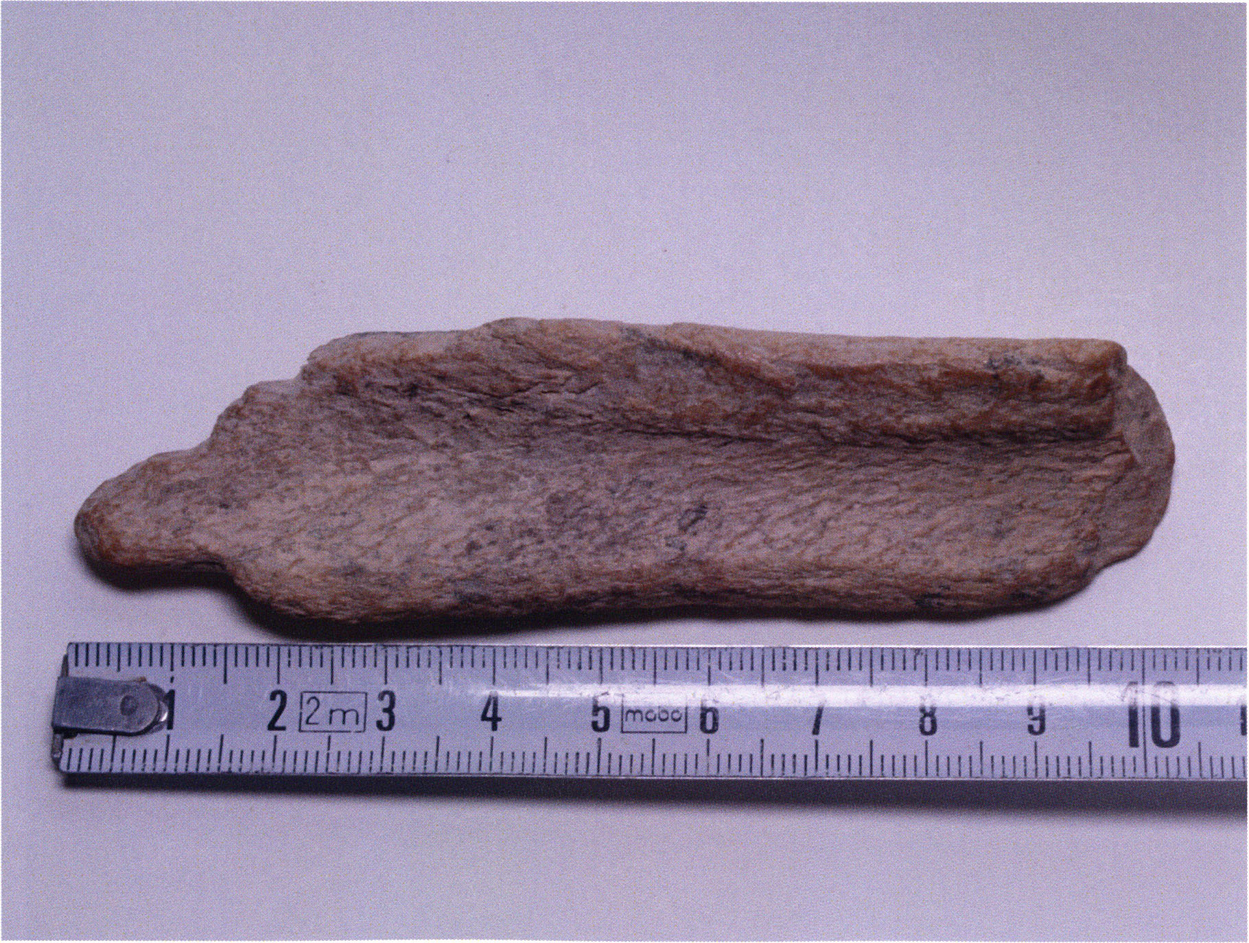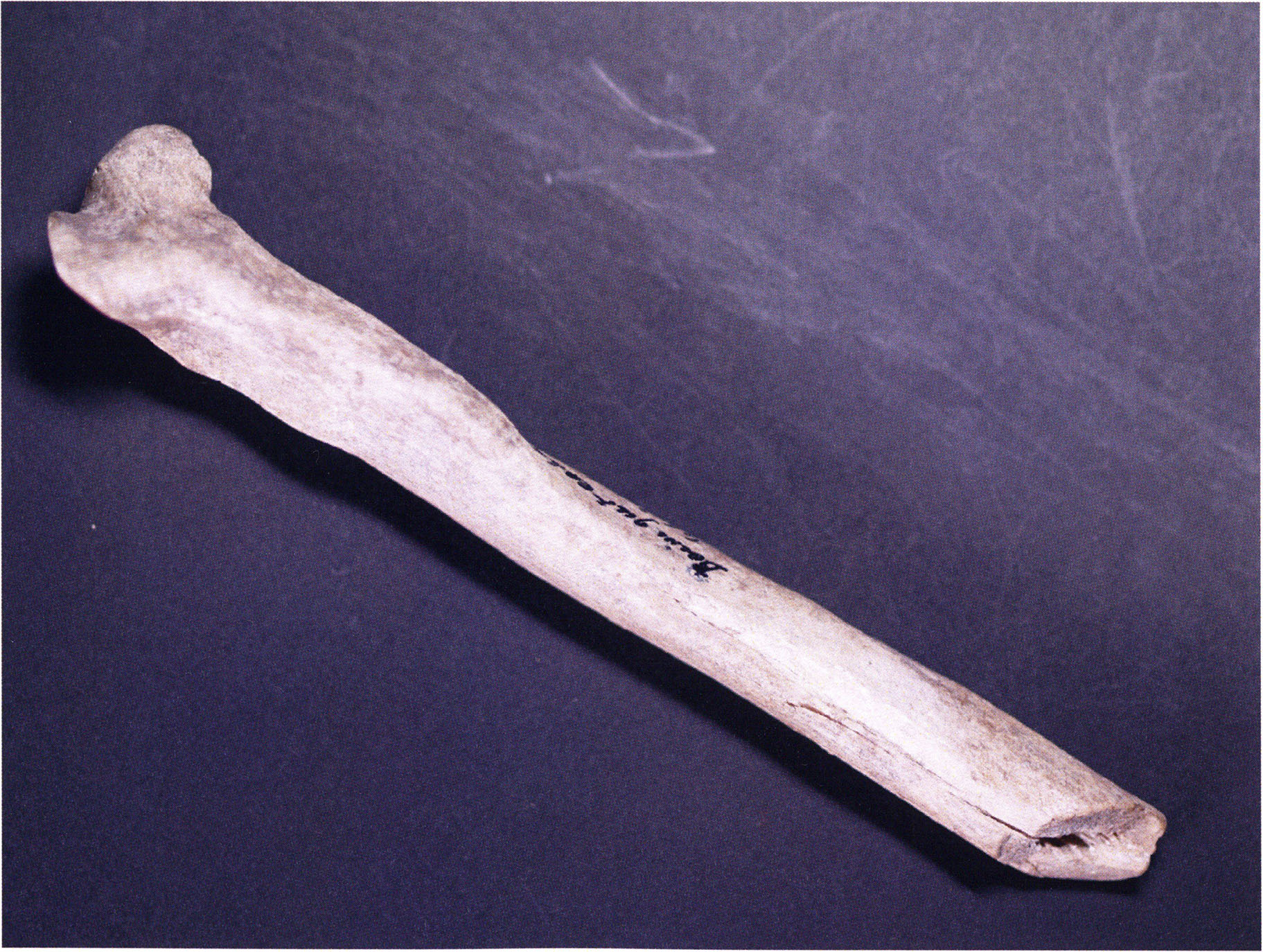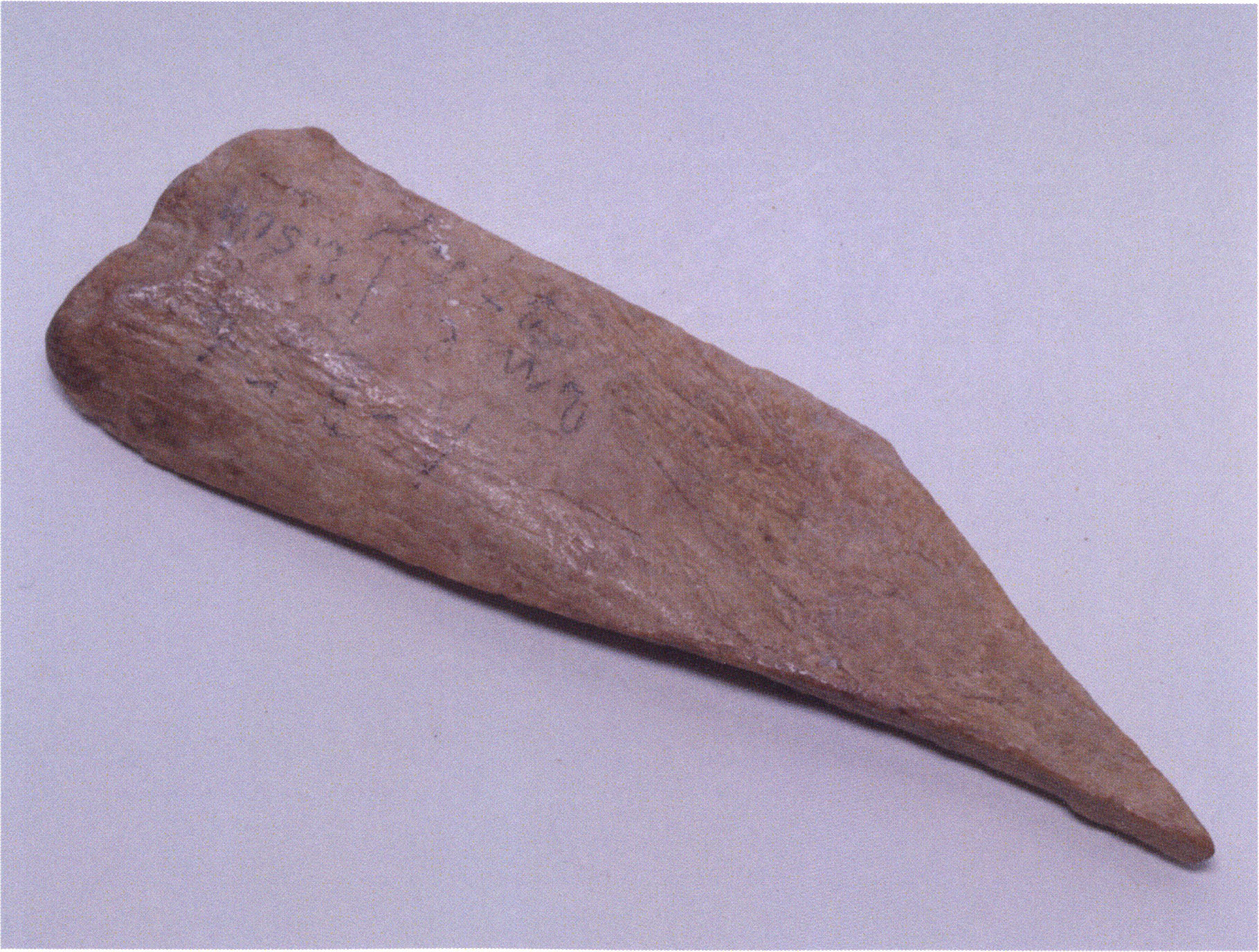 Figs. 173 a–c, pp. 371 f.: 89 mm long rib fragment with polished flute-beak fracture at one of the two fracture sites, numerous fine scratch marks on the outer surface from working, and the inscription "H III section 9, 1 m right." — This inscription is partially somewhat faded — notably the "r" — visible only upon closer inspection — not "l"! — of "right" (of the axis). For this stated location Nigg records in 1923, p. 27, as accompaniment of a third skull depot in the 9th section metre of H III, 1st m right of the axis, in the 2nd layer resting immediately on the 3rd layer: "a suspicious rib piece"! We can be almost certain that the photographed piece is this "suspicious rib piece"! — (a) Outer surface. (b) Outer surface of the polished flute-beak fracture end. (c) Inner surface.