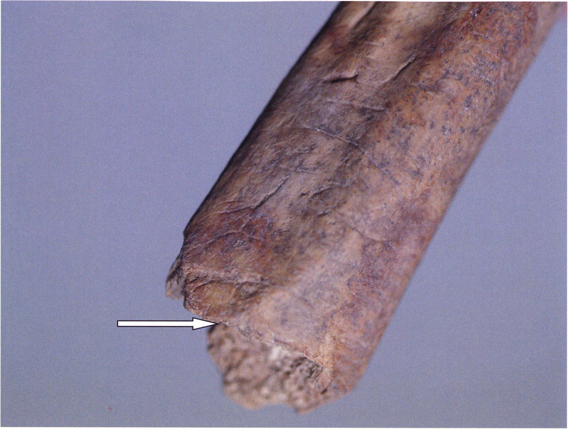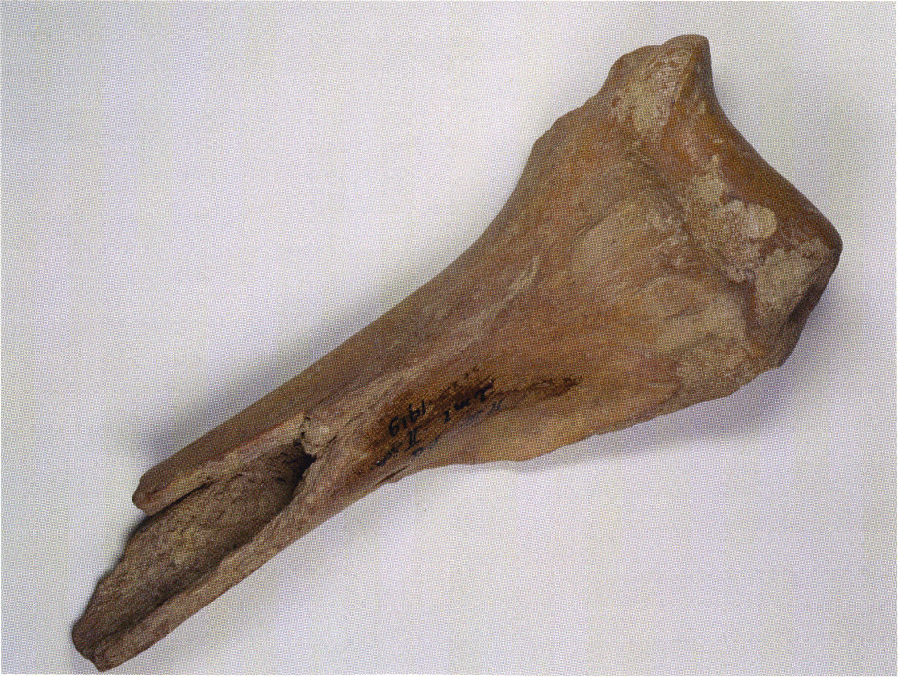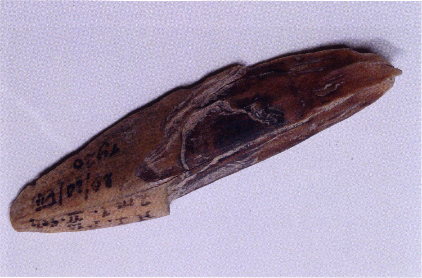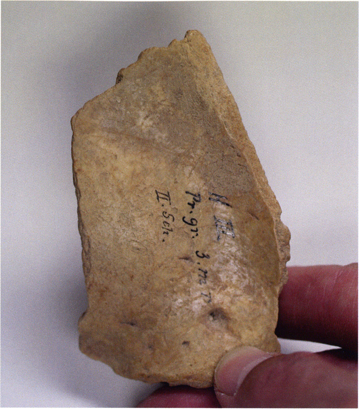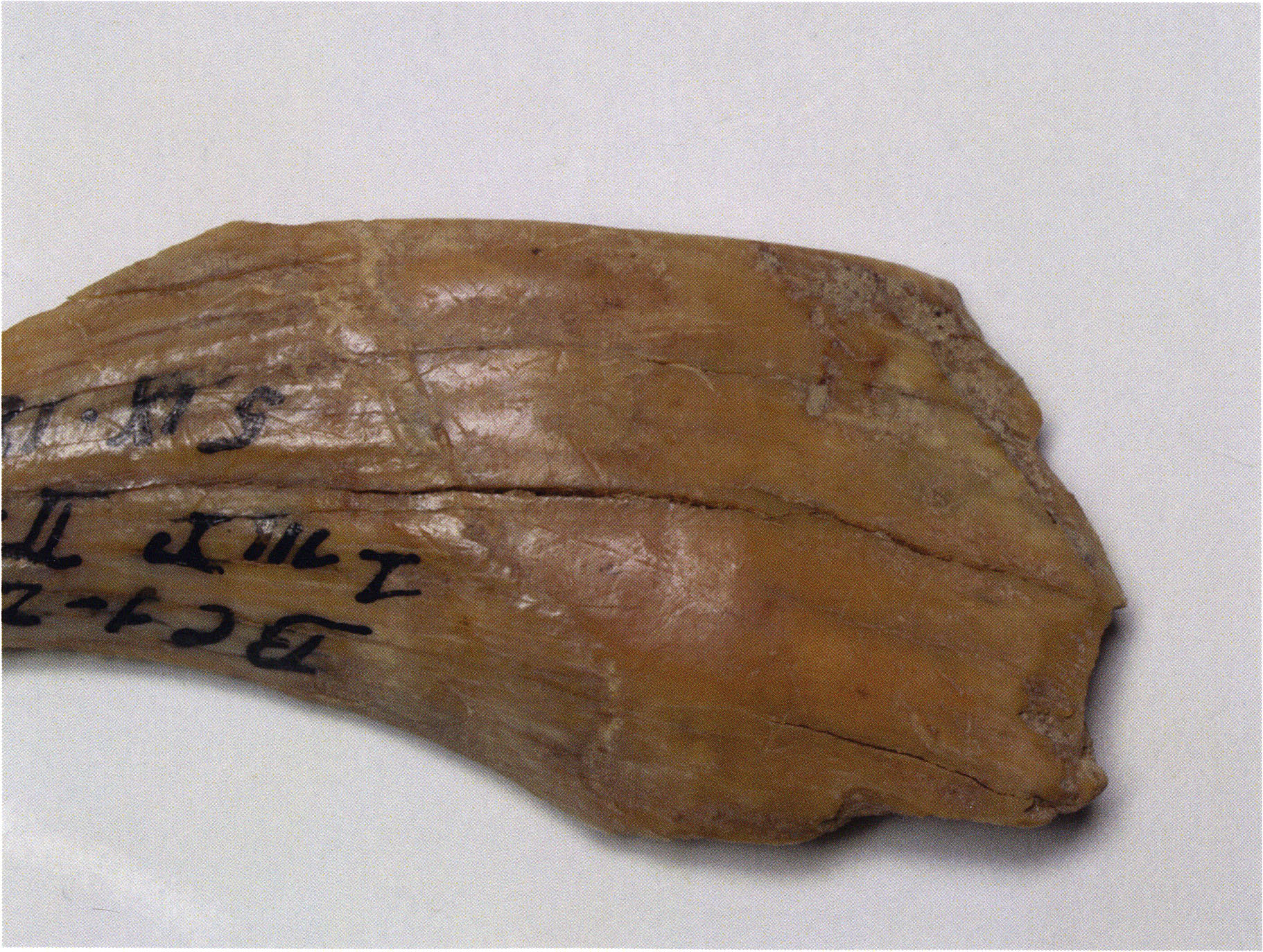 Figs. 173 a–c, pp. 371 f.: 89 mm long rib fragment with polished flute-beak fracture at one of the two fracture sites, numerous fine scratch marks on the outer surface from working, and the inscription "H III section 9, 1 m right." — This inscription is partially somewhat faded — notably the "r" — visible only upon closer inspection — not "l"! — of "right" (of the axis). For this stated location Nigg records in 1923, p. 27, as accompaniment of a third skull depot in the 9th section metre of H III, 1st m right of the axis, in the 2nd layer resting immediately on the 3rd layer: "a suspicious rib piece"! We can be almost certain that the photographed piece is this "suspicious rib piece"! — (a) Outer surface. (b) Outer surface of the polished flute-beak fracture end. (c) Inner surface.