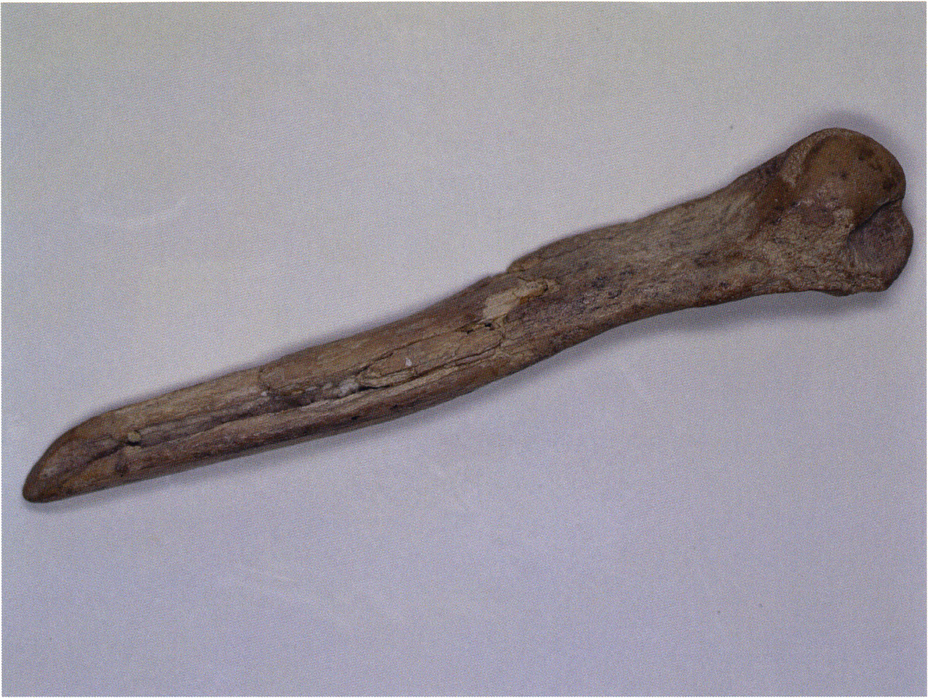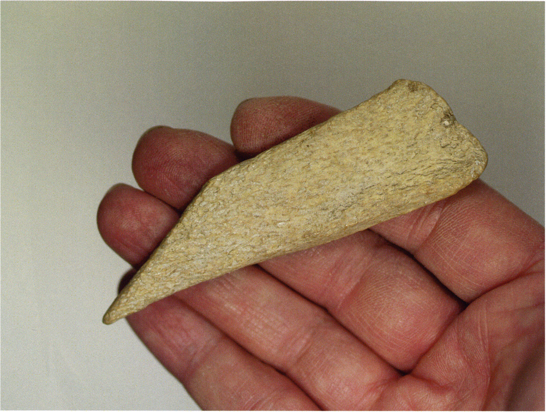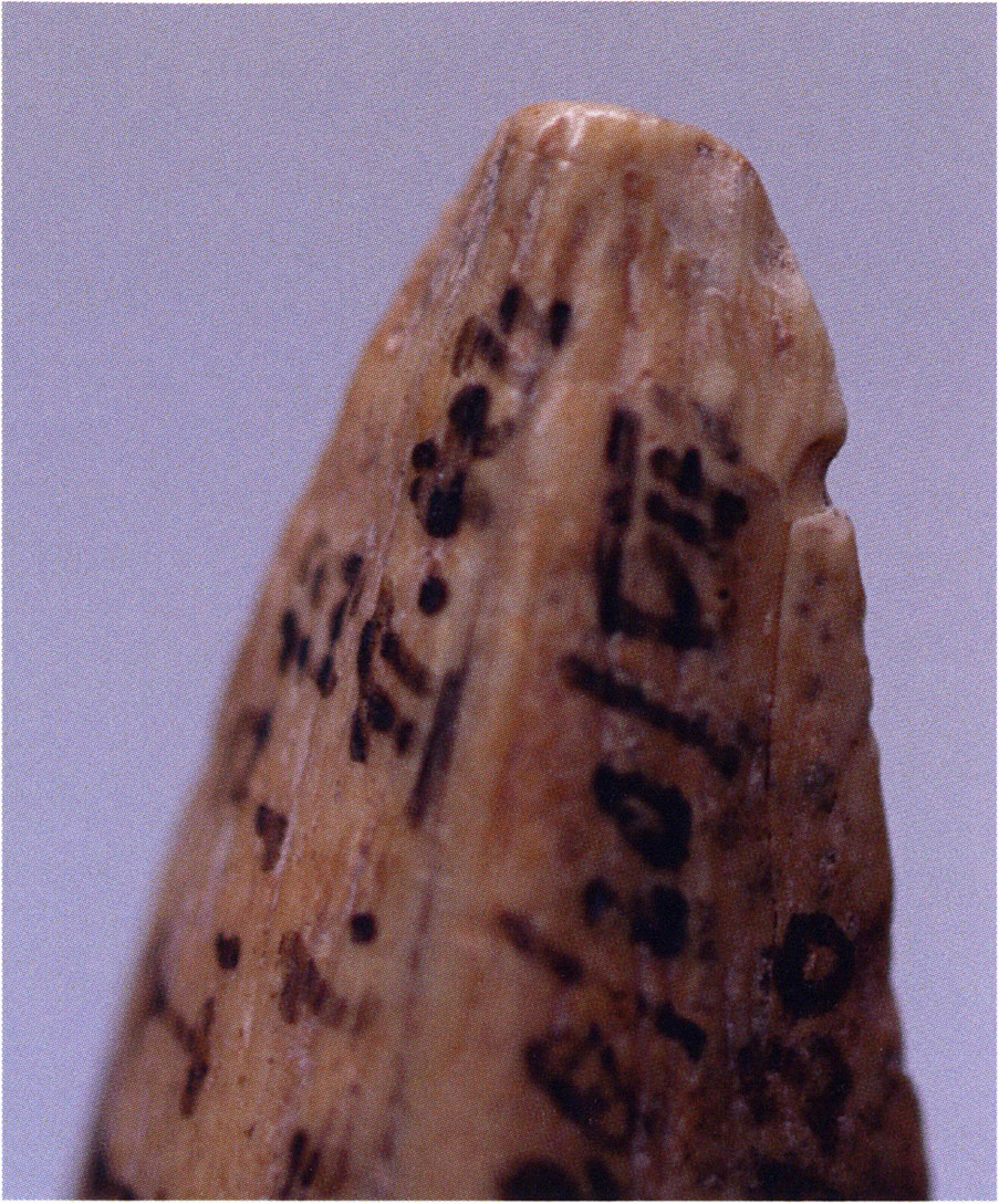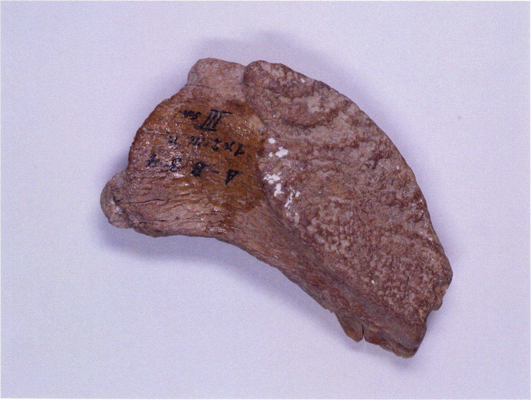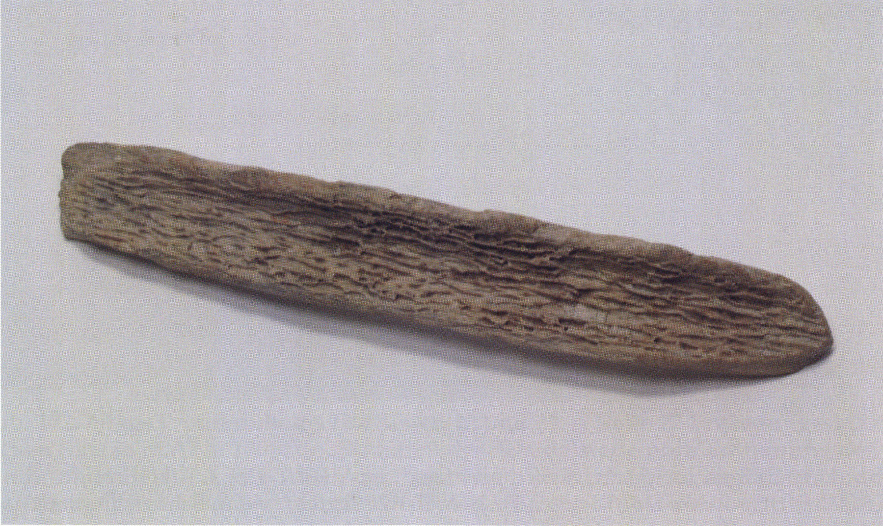Figs. 173 a–c, pp. 371 f.: 89 mm long rib fragment with polished flute-beak fracture at one of the two fracture sites, numerous fine scratch marks on the outer surface from working, and the inscription "H III section 9, 1 m right." — This inscription is partially somewhat faded — notably the "r" — visible only upon closer inspection — not "l"! — of "right" (of the axis). For this stated location Nigg records in 1923, p. 27, as accompaniment of a third skull depot in the 9th section metre of H III, 1st m right of the axis, in the 2nd layer resting immediately on the 3rd layer: "a suspicious rib piece"! We can be almost certain that the photographed piece is this "suspicious rib piece"! — (a) Outer surface. (b) Outer surface of the polished flute-beak fracture end. (c) Inner surface.