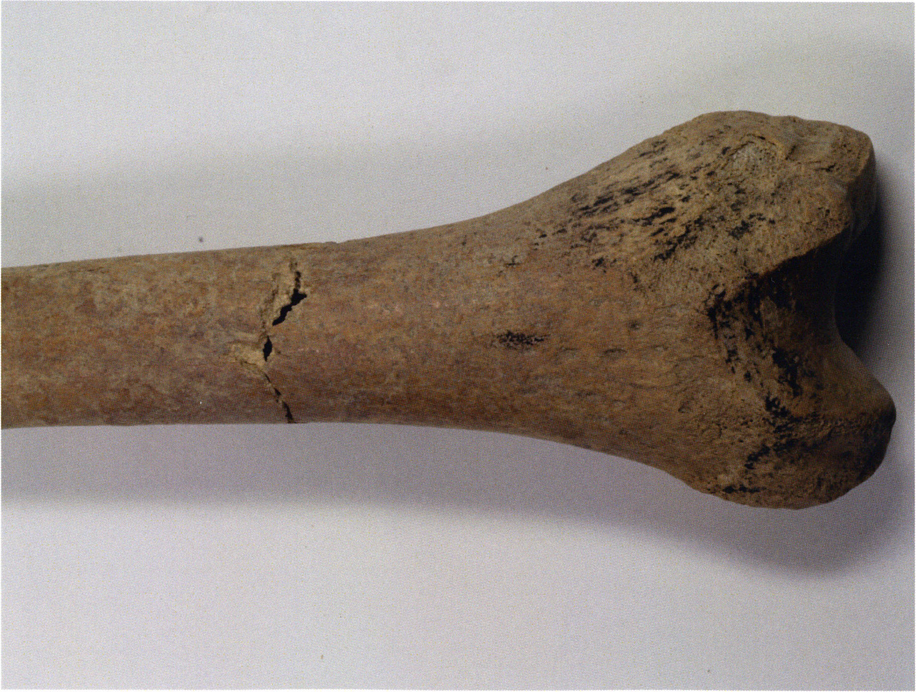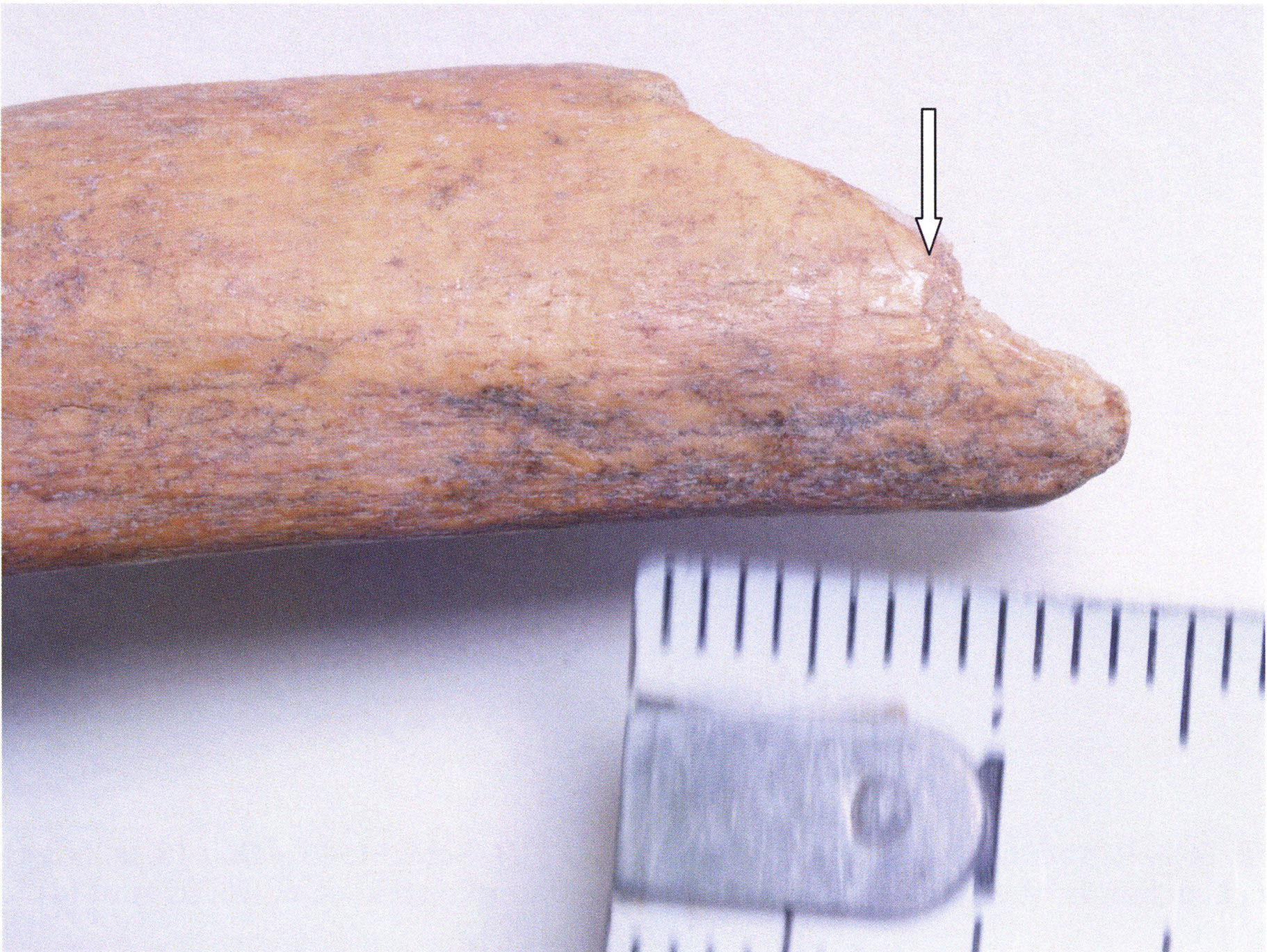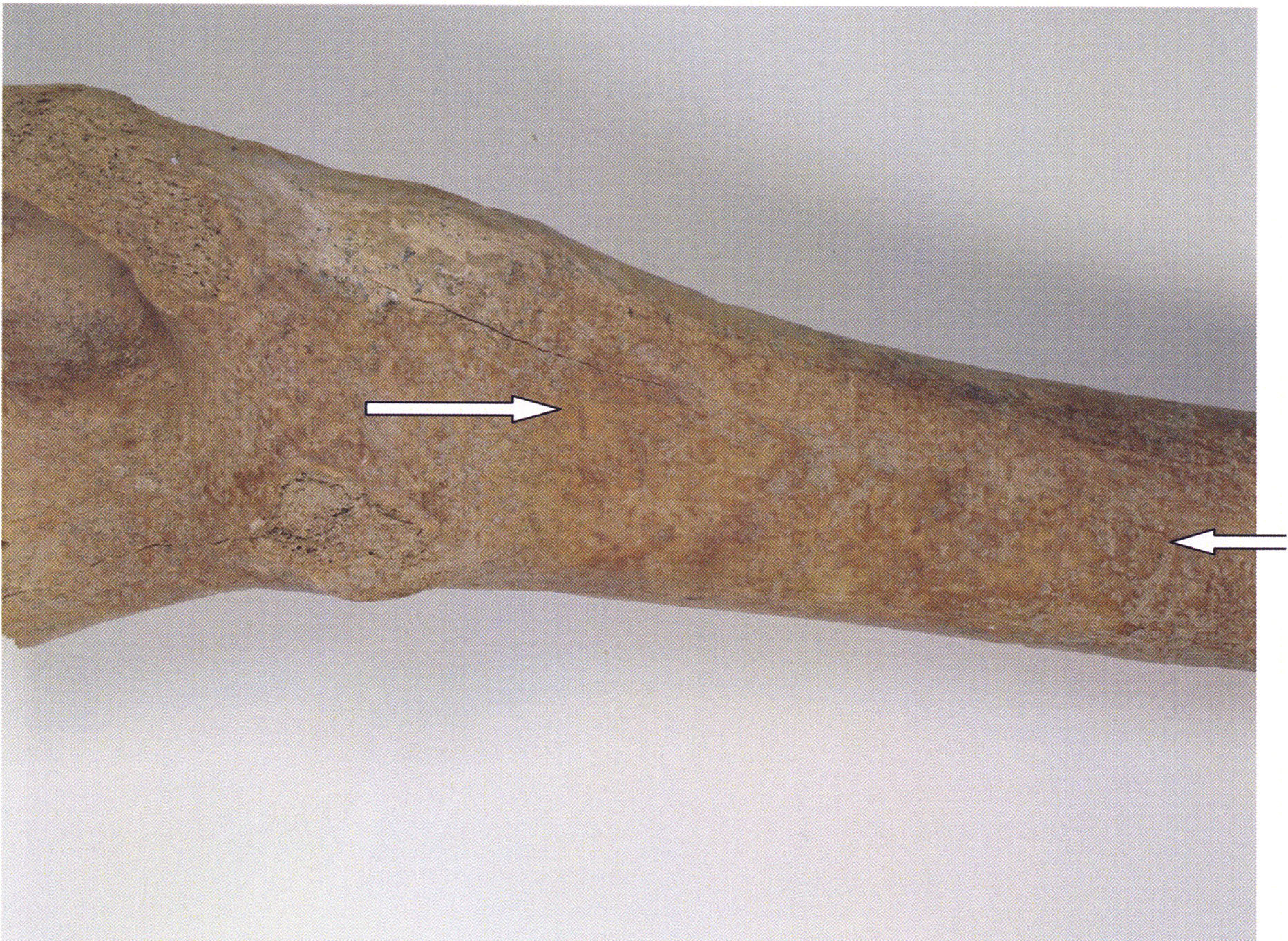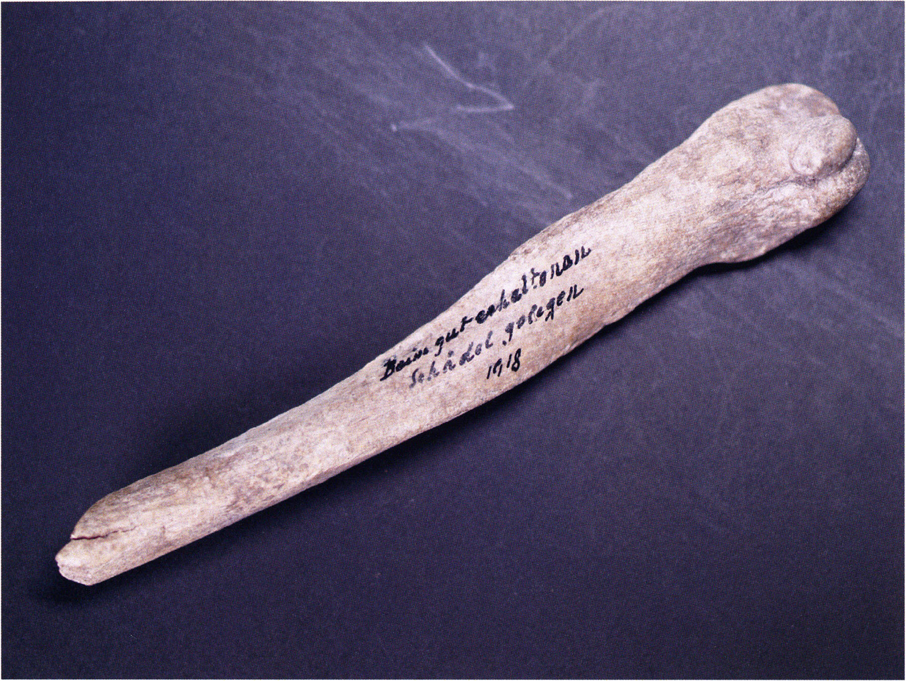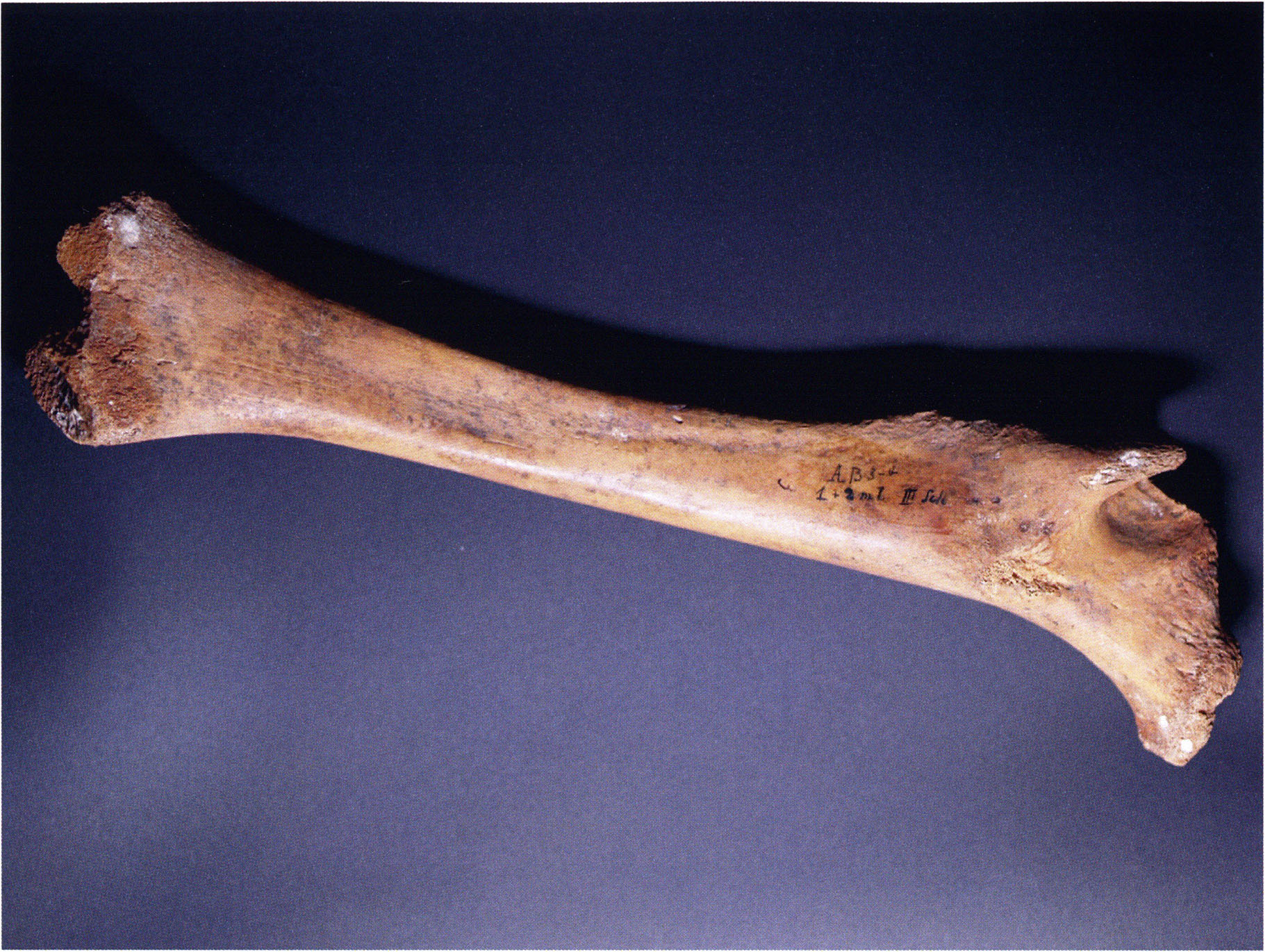Figs. 173 a–c, pp. 371 f.: 89 mm long rib fragment with polished flute-beak fracture at one of the two fracture sites, numerous fine scratch marks on the outer surface from working, and the inscription "H III section 9, 1 m right." — This inscription is partially somewhat faded — notably the "r" — visible only upon closer inspection — not "l"! — of "right" (of the axis). For this stated location Nigg records in 1923, p. 27, as accompaniment of a third skull depot in the 9th section metre of H III, 1st m right of the axis, in the 2nd layer resting immediately on the 3rd layer: "a suspicious rib piece"! We can be almost certain that the photographed piece is this "suspicious rib piece"! — (a) Outer surface. (b) Outer surface of the polished flute-beak fracture end. (c) Inner surface.