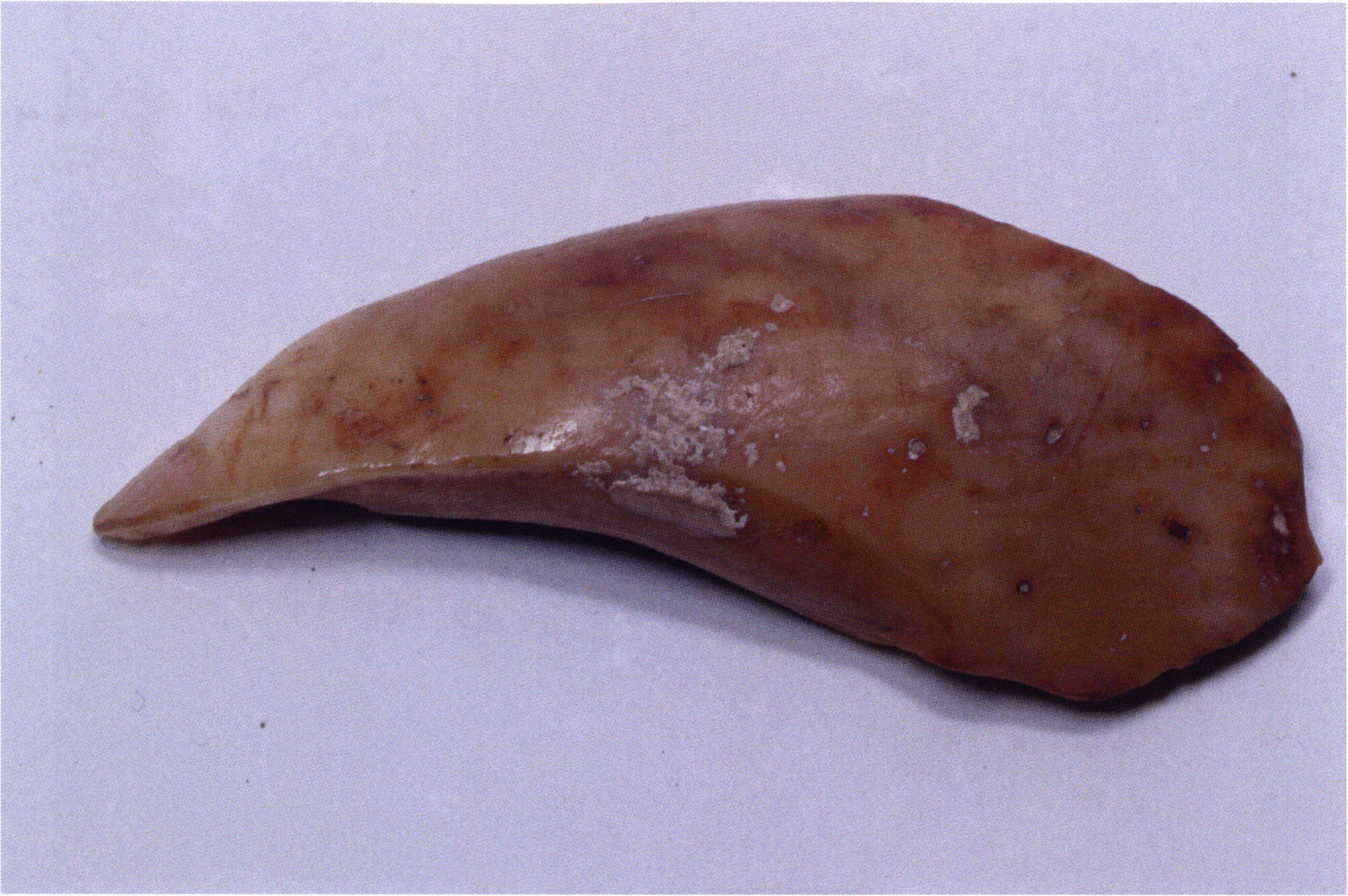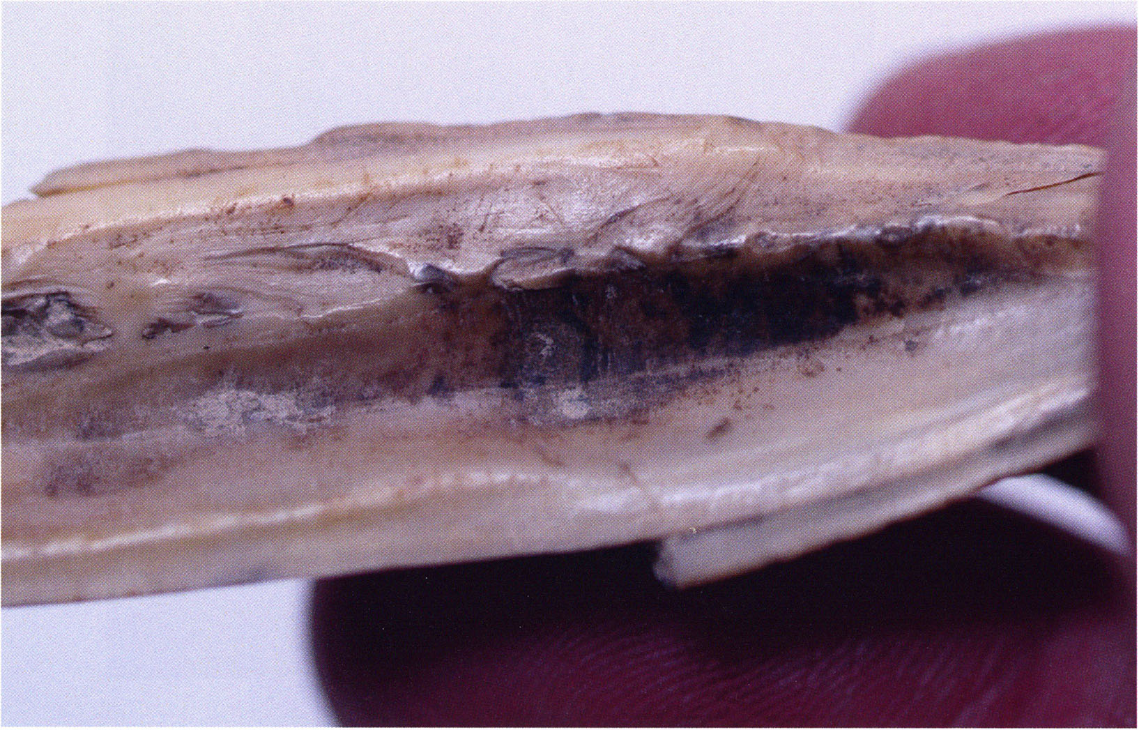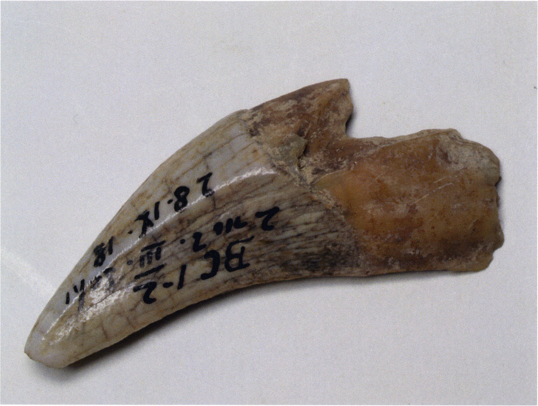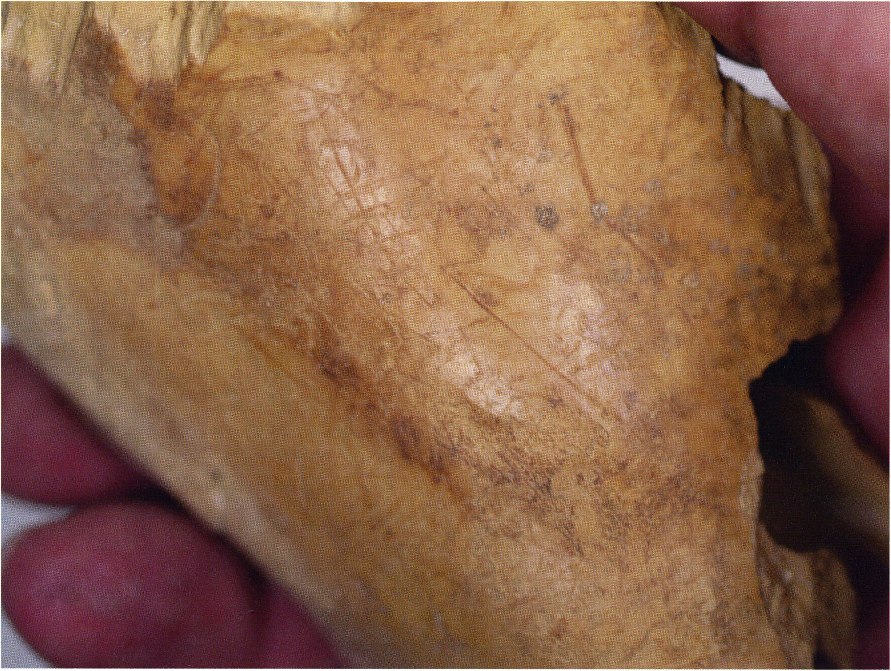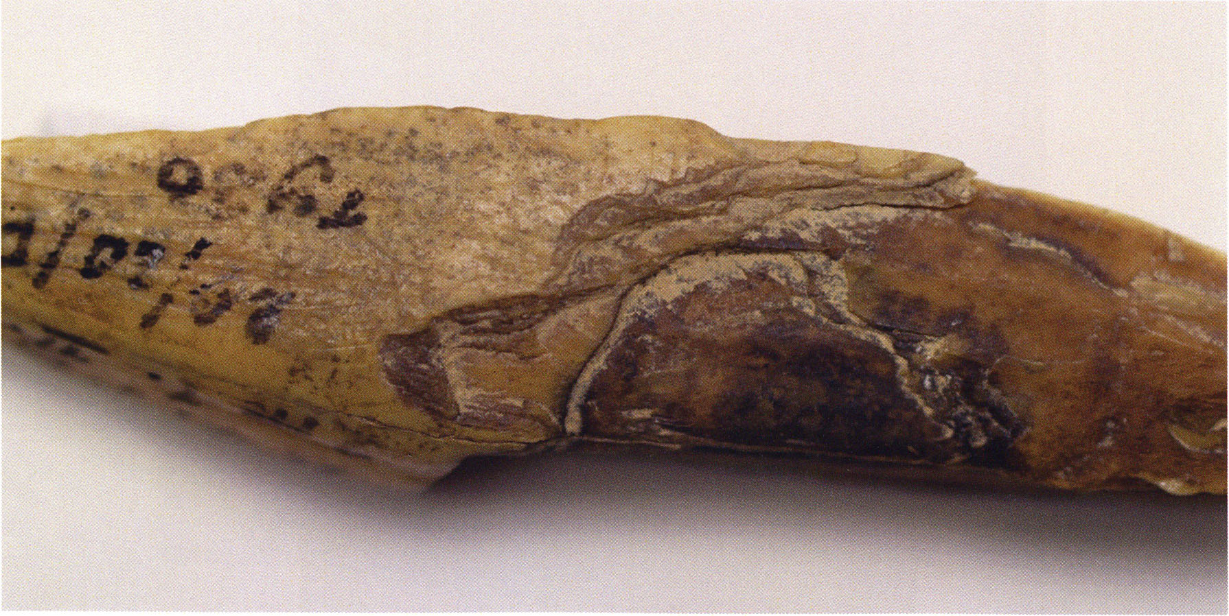 Figs. 173 a–c, pp. 371 f.: 89 mm long rib fragment with polished flute-beak fracture at one of the two fracture sites, numerous fine scratch marks on the outer surface from working, and the inscription "H III section 9, 1 m right." — This inscription is partially somewhat faded — notably the "r" — visible only upon closer inspection — not "l"! — of "right" (of the axis). For this stated location Nigg records in 1923, p. 27, as accompaniment of a third skull depot in the 9th section metre of H III, 1st m right of the axis, in the 2nd layer resting immediately on the 3rd layer: "a suspicious rib piece"! We can be almost certain that the photographed piece is this "suspicious rib piece"! — (a) Outer surface. (b) Outer surface of the polished flute-beak fracture end. (c) Inner surface.
