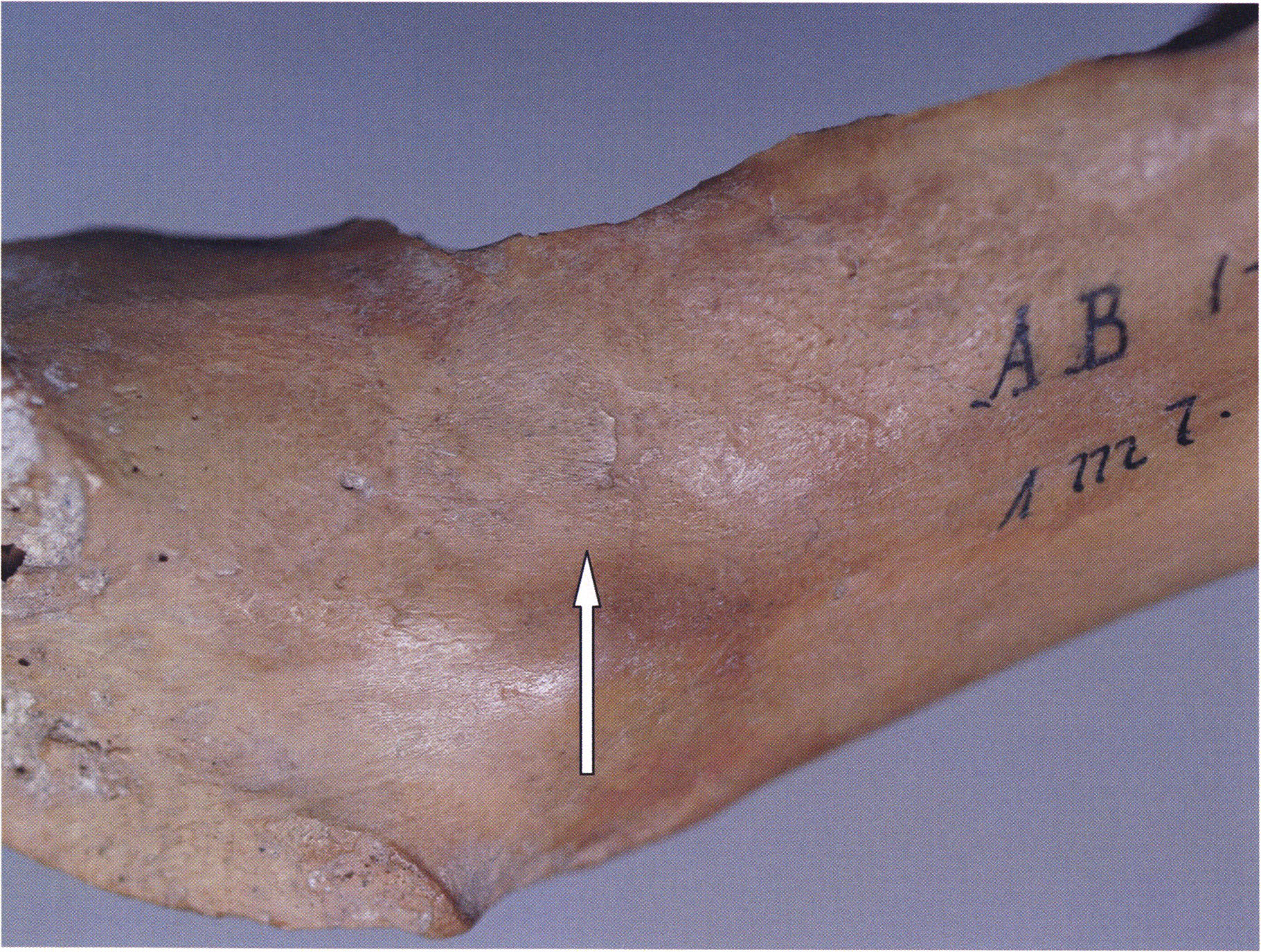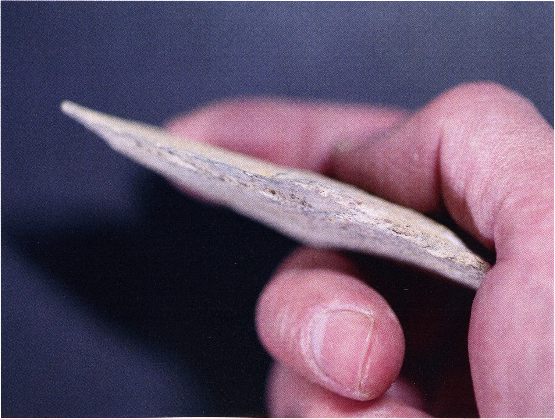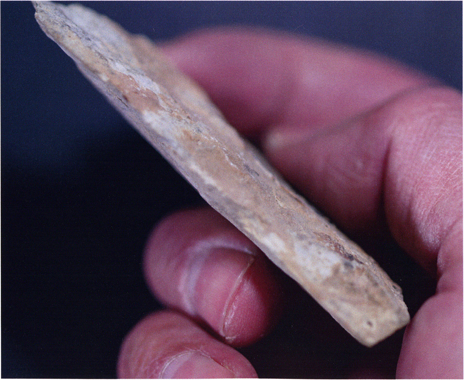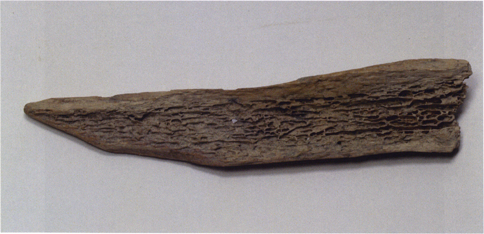 Figs. 173 a–c, pp. 371 f.: 89 mm long rib fragment with polished flute-beak fracture at one of the two fracture sites, numerous fine scratch marks on the outer surface from working, and the inscription "H III section 9, 1 m right." — This inscription is partially somewhat faded — notably the "r" — visible only upon closer inspection — not "l"! — of "right" (of the axis). For this stated location Nigg records in 1923, p. 27, as accompaniment of a third skull depot in the 9th section metre of H III, 1st m right of the axis, in the 2nd layer resting immediately on the 3rd layer: "a suspicious rib piece"! We can be almost certain that the photographed piece is this "suspicious rib piece"! — (a) Outer surface. (b) Outer surface of the polished flute-beak fracture end. (c) Inner surface.