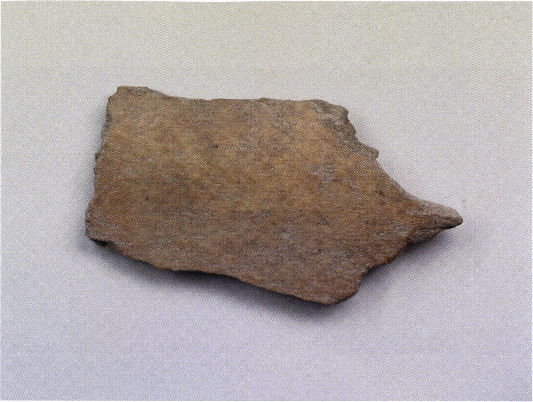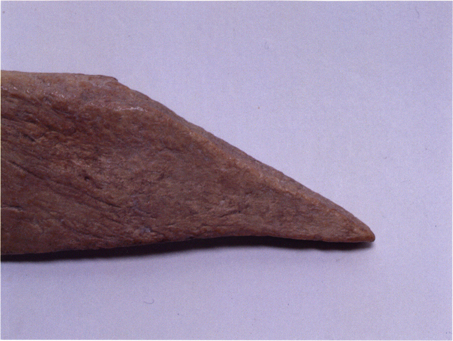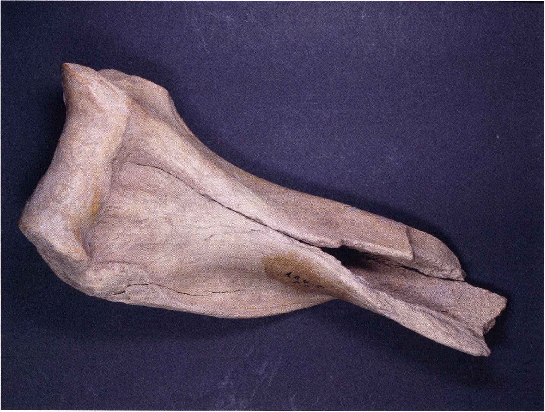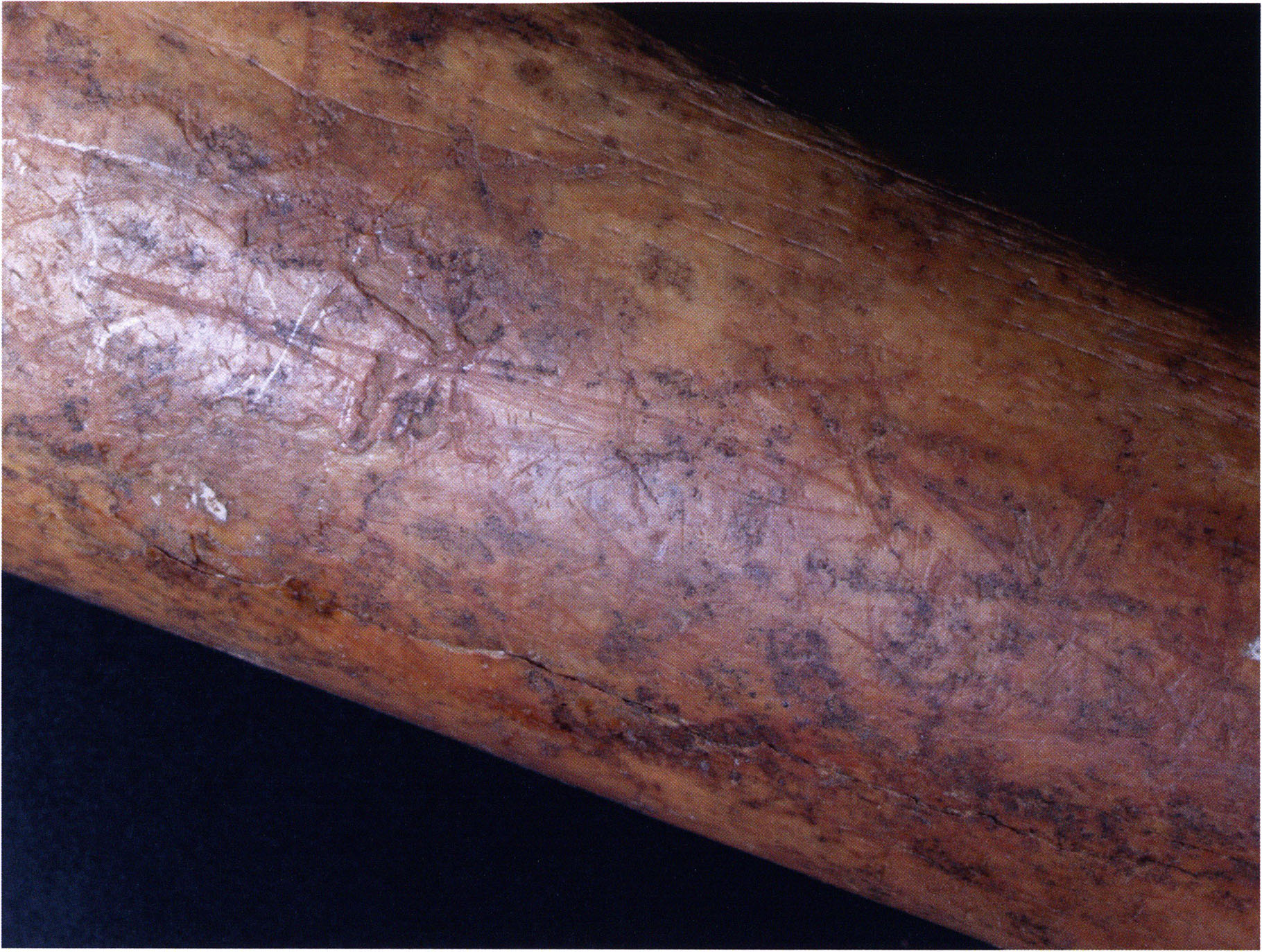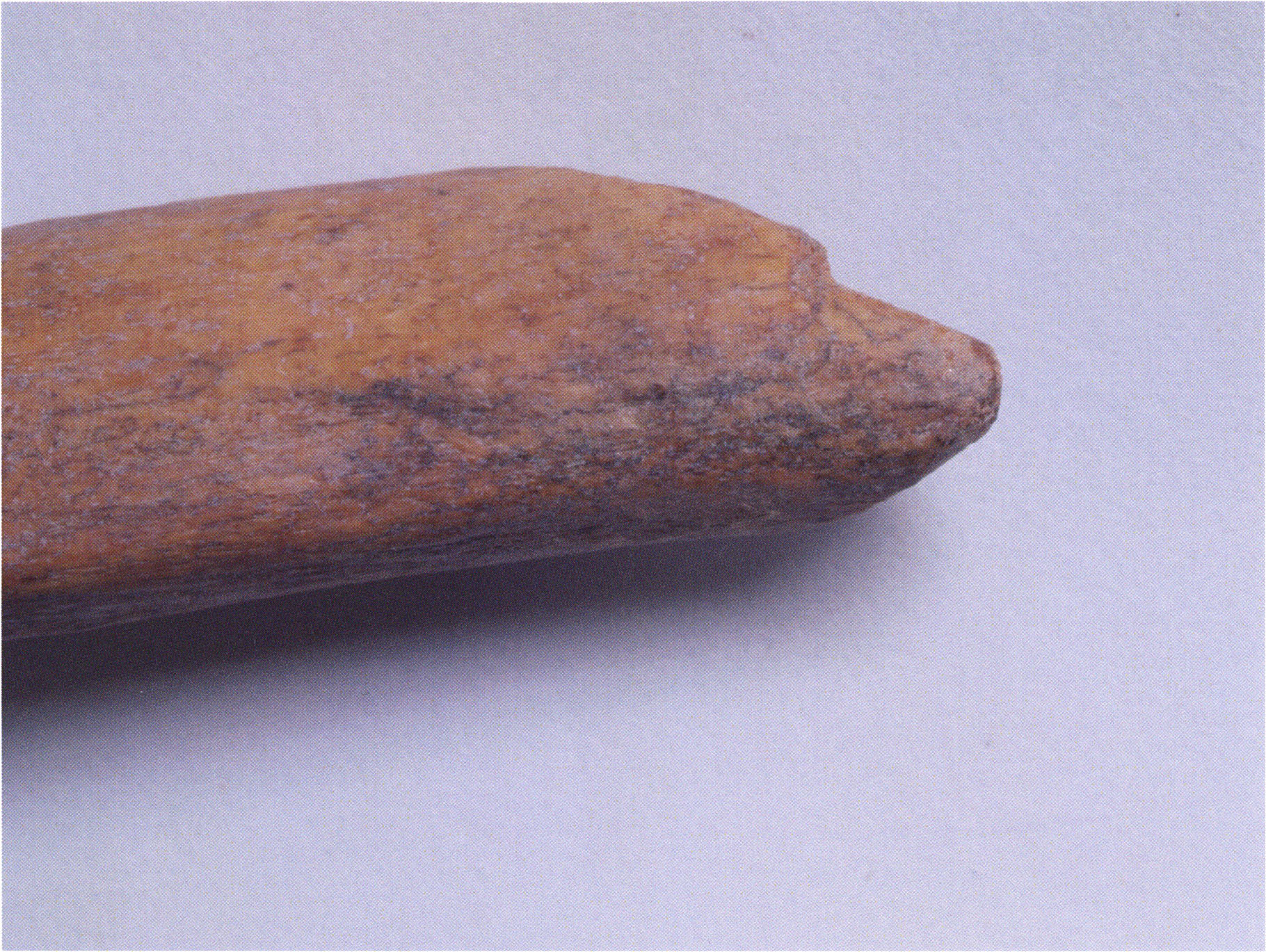 Figs. 173 a–c, pp. 371 f.: 89 mm long rib fragment with polished flute-beak fracture at one of the two fracture sites, numerous fine scratch marks on the outer surface from working, and the inscription "H III section 9, 1 m right." — This inscription is partially somewhat faded — notably the "r" — visible only upon closer inspection — not "l"! — of "right" (of the axis). For this stated location Nigg records in 1923, p. 27, as accompaniment of a third skull depot in the 9th section metre of H III, 1st m right of the axis, in the 2nd layer resting immediately on the 3rd layer: "a suspicious rib piece"! We can be almost certain that the photographed piece is this "suspicious rib piece"! — (a) Outer surface. (b) Outer surface of the polished flute-beak fracture end. (c) Inner surface.